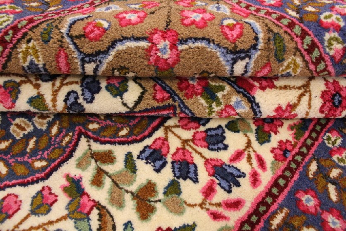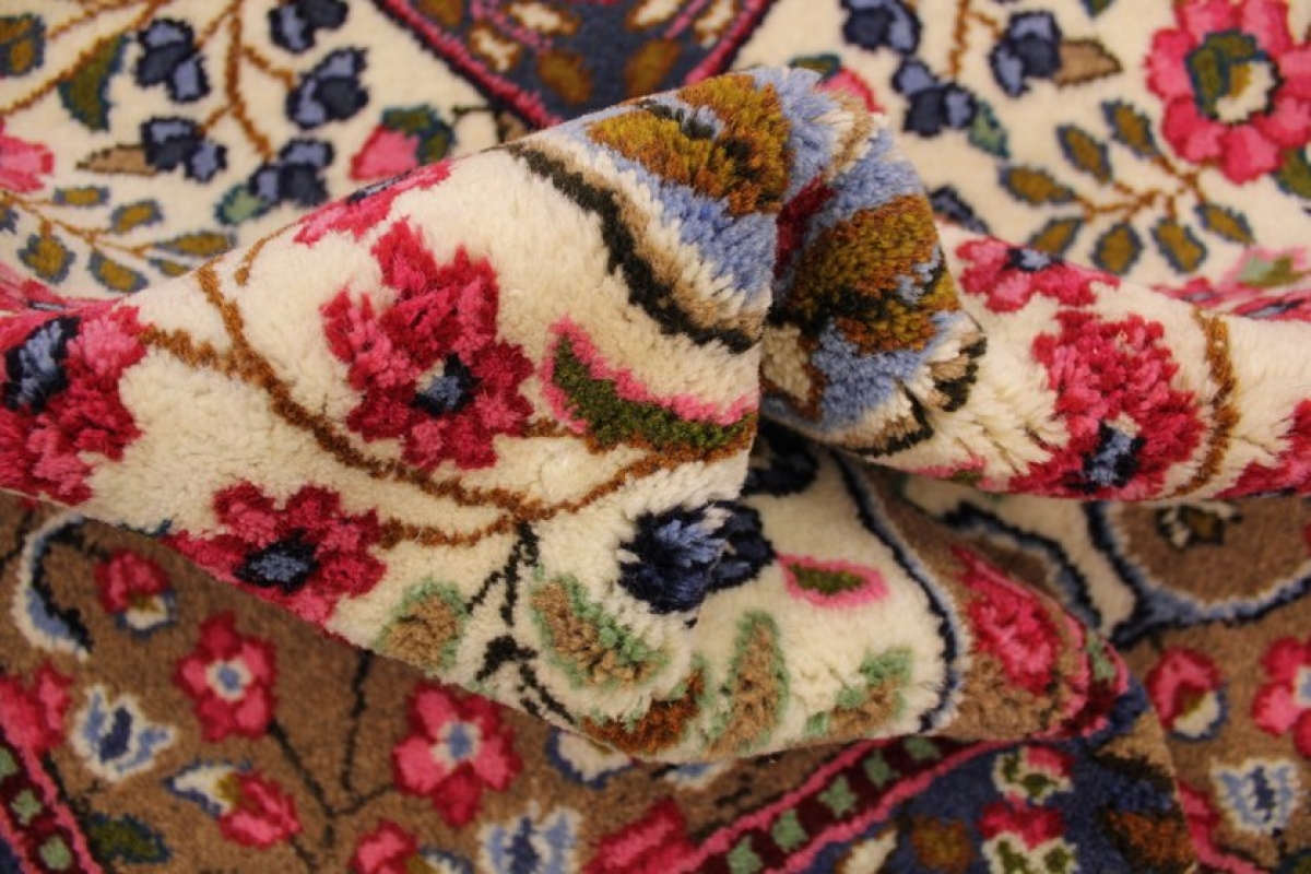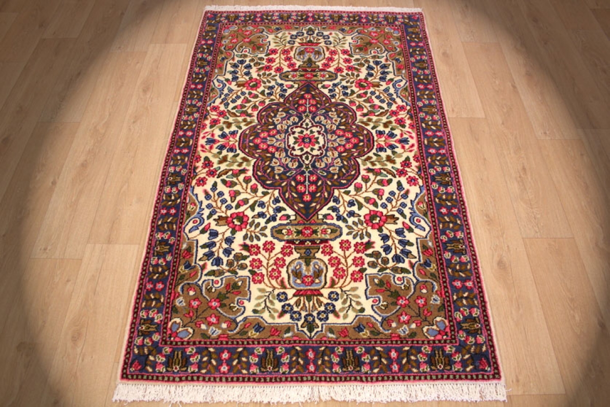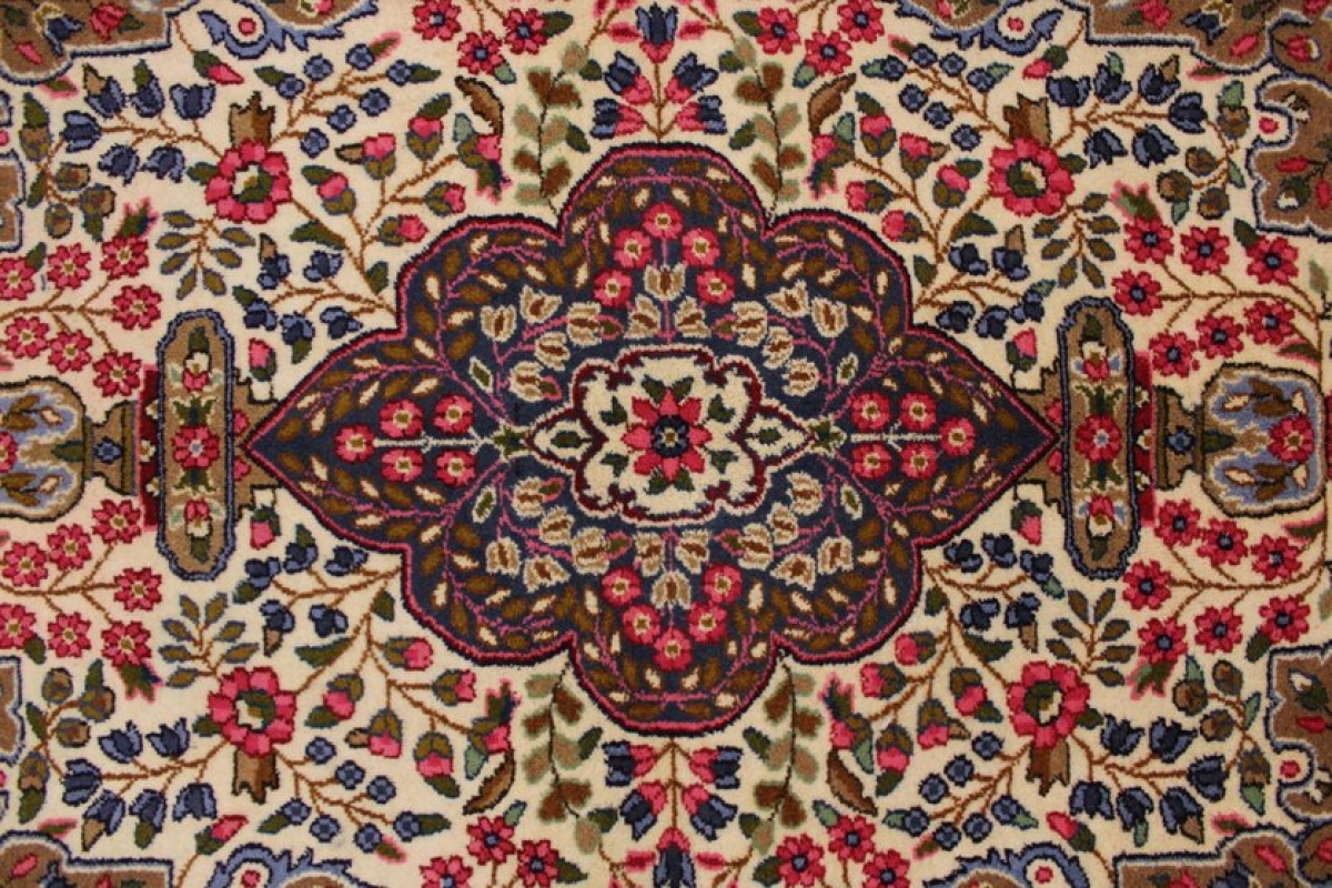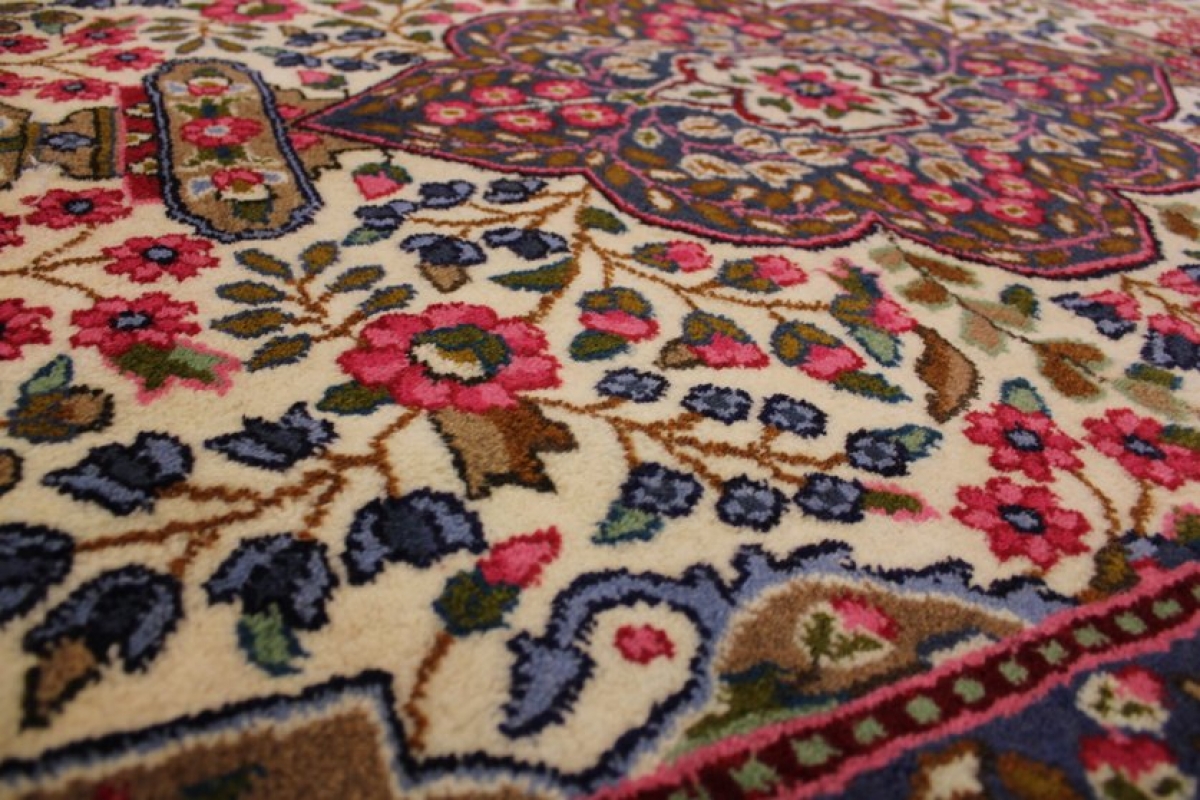 Kerman, auch Kirman, Hauptstadt der gleichnamigen Provinz in Persien. Kerman liegt 1076 km südöstlich von Tehran und 370 Kilometer südöstlich von Yazd entfernt. Die Stadt wurde von Ardashir I. (224 - 241) gegründet und liegt im Zentralpersien. Kerman wurde durch Turkmans, Araber und Mongols nach dem 7. Jahrhundert eingenommen. Kerman wurde für seine Teppiche berühmt, nachdem Marco Polo sie entdeckt hatte. Die Teppichproduktion ist sehr traditionsreich, die gute Qualität sowie die Lebendigkeit und Harmonie der Muster und Farben zeichnen Kerman Teppiche aus.