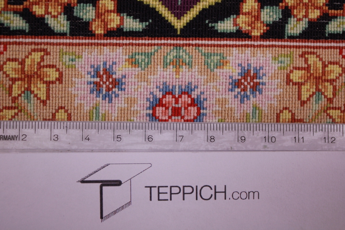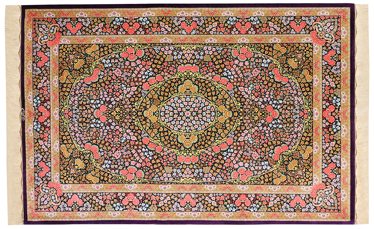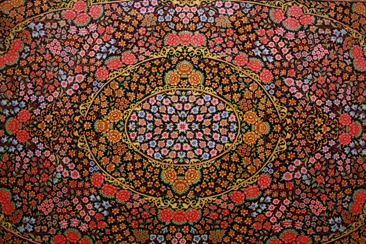 Trotz der vielseitigen Farbpalette hat der Gom-Teppich niemals grelle Farkontraste, sondern achtet auf eine harmonische Farbabstimmung. Bemerkenswert ist auch die äußerst exakte Knüpfung, die fast an Maschinenarbeit erinnert.