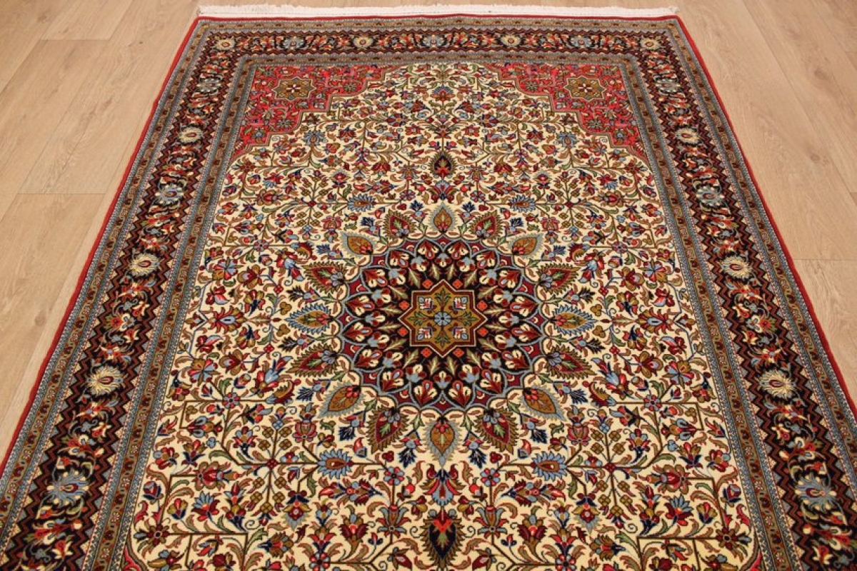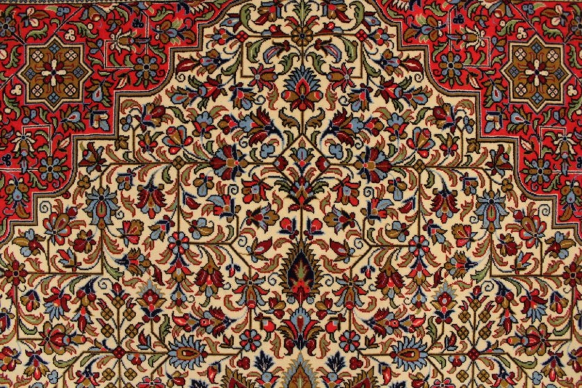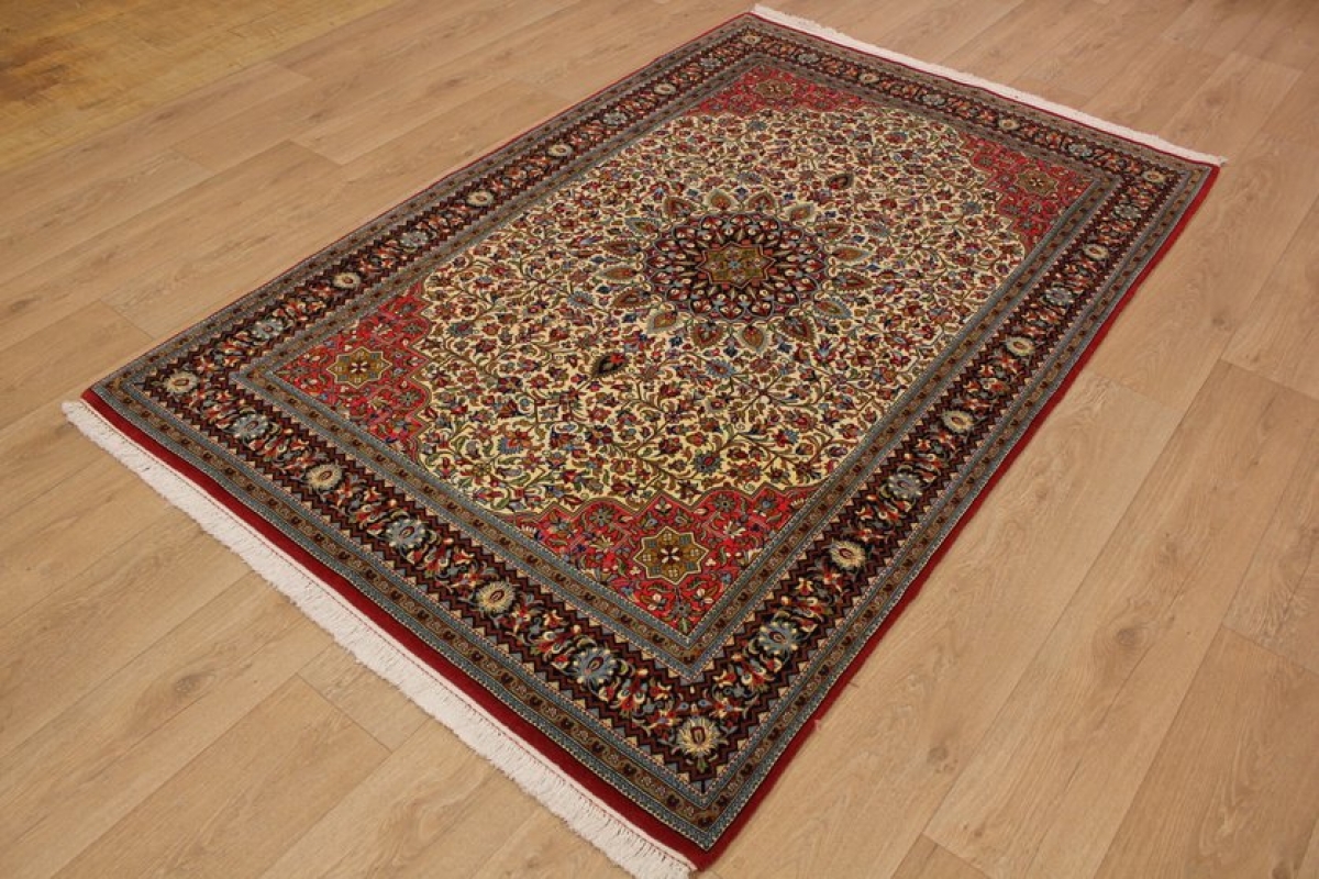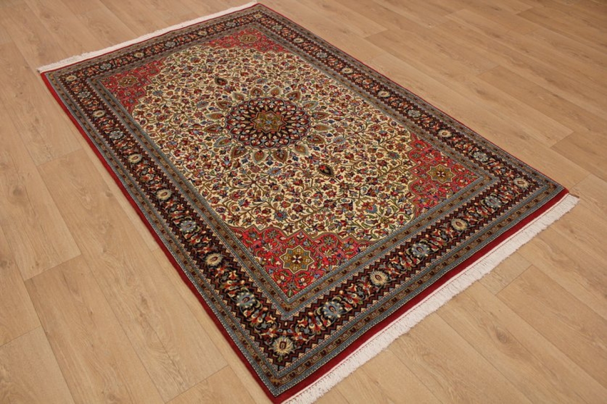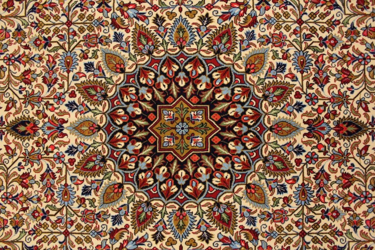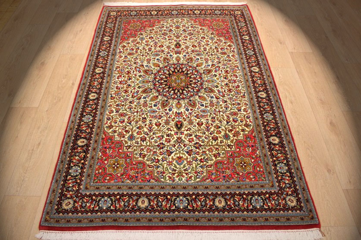 Aufgrund der soliden Wollqualtität und der fast ausschließlichen Verwendung von Naturfarben kann sich der Gom Teppich mit anderen hochwertigen Perserteppichen durchaus messen. Neben guten wollenen Teppichen werden hier in größerer Anzahl Seidenteppiche geknüpft. Als Motive findet man quadratisch unterteilte Gartenteppiche, Jagdschilderungen, Botteh-Motive, Zenrtalmedallions und Vasenmuster. Alle sind liebevoll feingliedrig ausgestattet. Ihre Kolorierung, für die hauptsächlich Naturfarben verwendet werden, reicht von sattem Rot (oft mit leuchtendem Türkis abgestimmt) bis zu lichtblauen, grünen und sogar braunen Tönen. Grundfarbe ist zumeist Elfenbein, zuweilen wird auch Rot als Hintergrundfarbe gewählt.