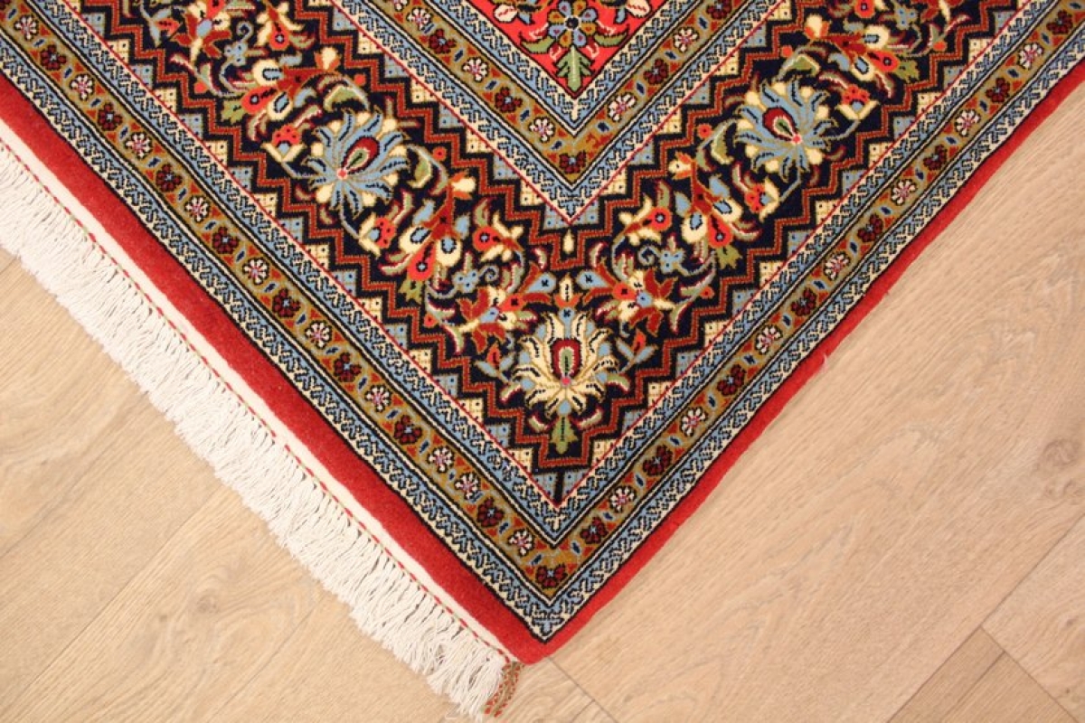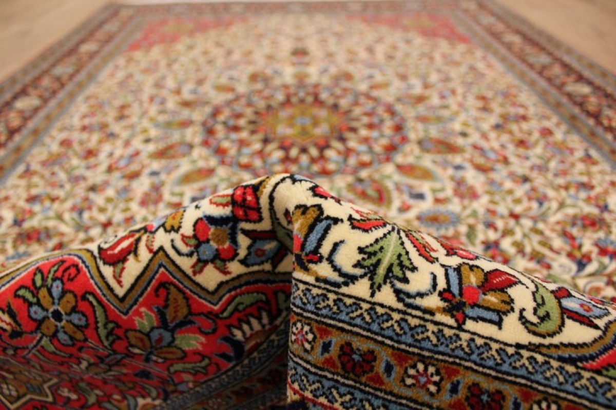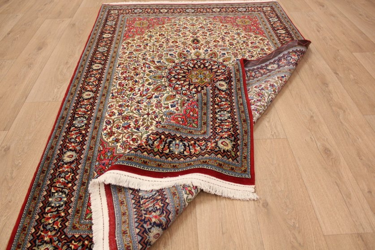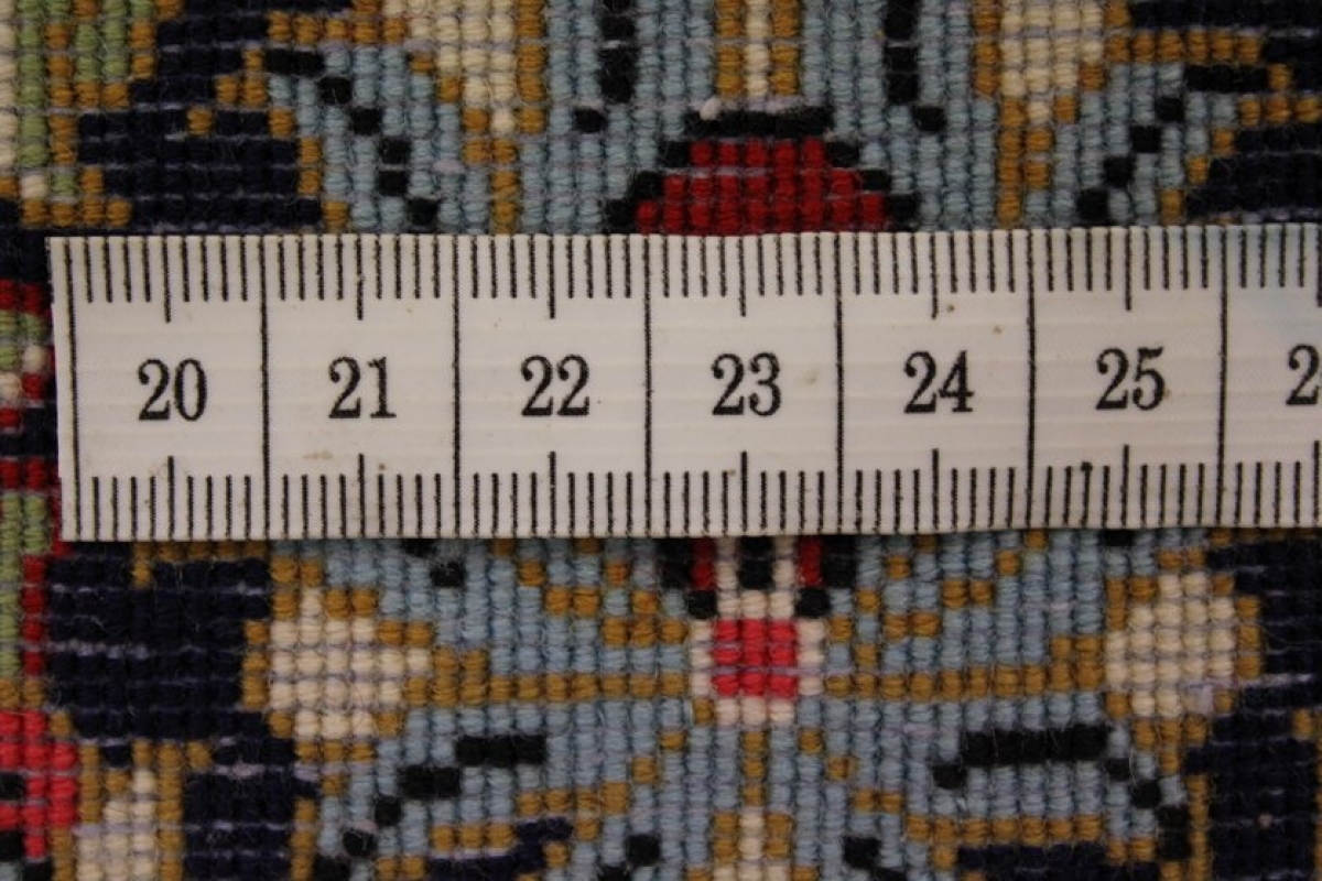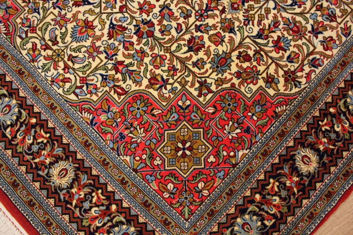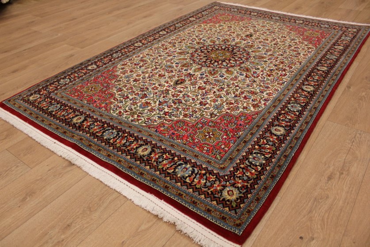 Aufgrund der soliden Wollqualtität und der fast ausschließlichen Verwendung von Naturfarben kann sich der Gom Teppich mit anderen hochwertigen Perserteppichen durchaus messen. Neben guten wollenen Teppichen werden hier in größerer Anzahl Seidenteppiche geknüpft. Als Motive findet man quadratisch unterteilte Gartenteppiche, Jagdschilderungen, Botteh-Motive, Zenrtalmedallions und Vasenmuster. Alle sind liebevoll feingliedrig ausgestattet. Ihre Kolorierung, für die hauptsächlich Naturfarben verwendet werden, reicht von sattem Rot (oft mit leuchtendem Türkis abgestimmt) bis zu lichtblauen, grünen und sogar braunen Tönen. Grundfarbe ist zumeist Elfenbein, zuweilen wird auch Rot als Hintergrundfarbe gewählt.