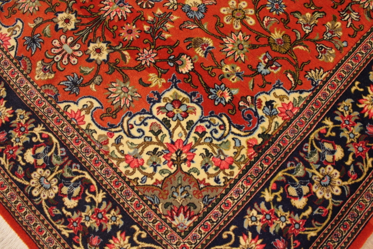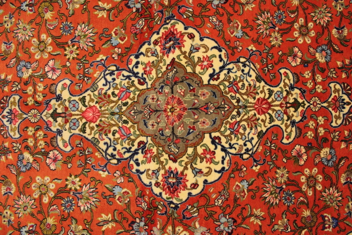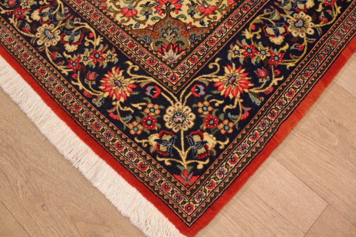 Trotz der vielseitigen Farbpalette hat der Gom-Teppich niemals grelle Farkontraste, sondern achtet auf eine harmonische Farbabstimmung. Bemerkenswert ist auch die äußerst exakte Knüpfung, die fast an Maschinenarbeit erinnert.