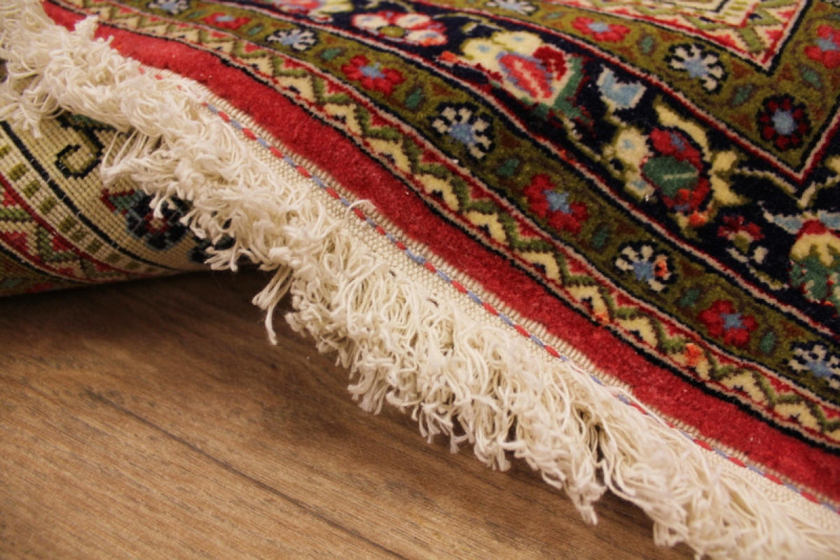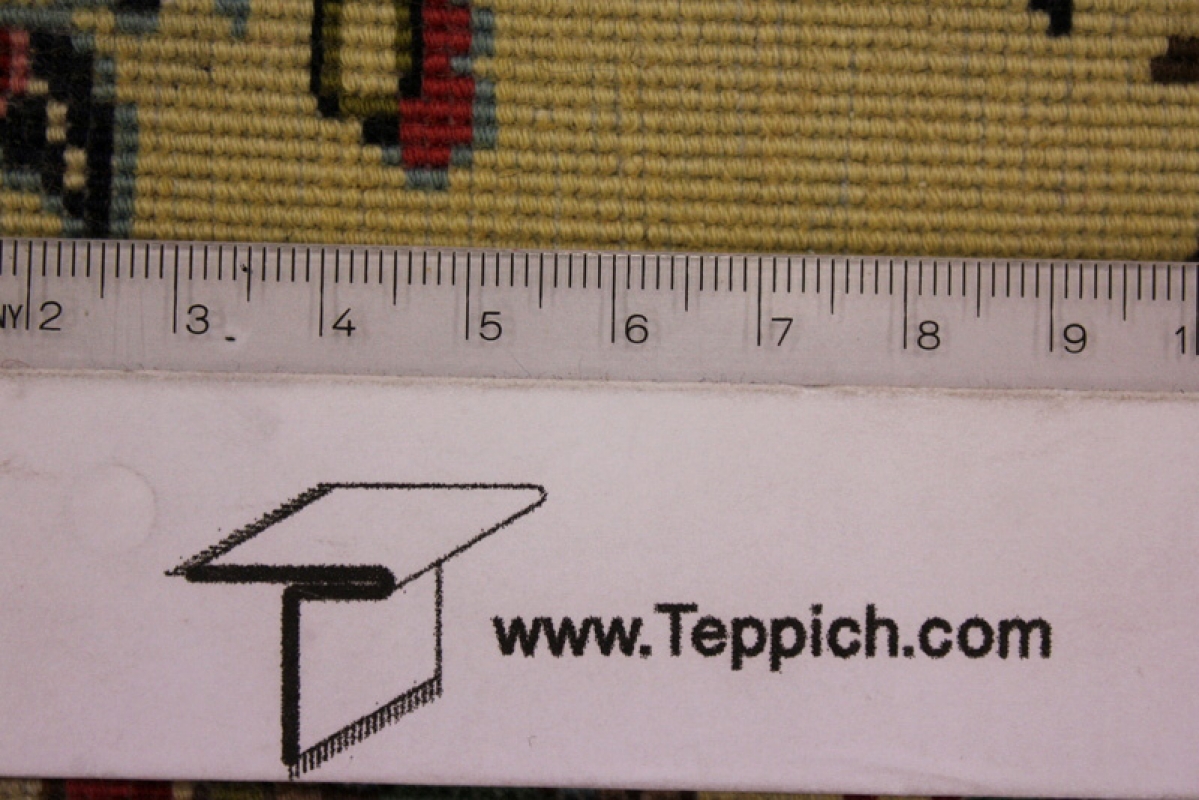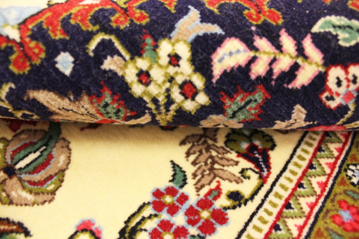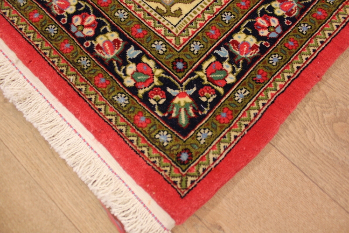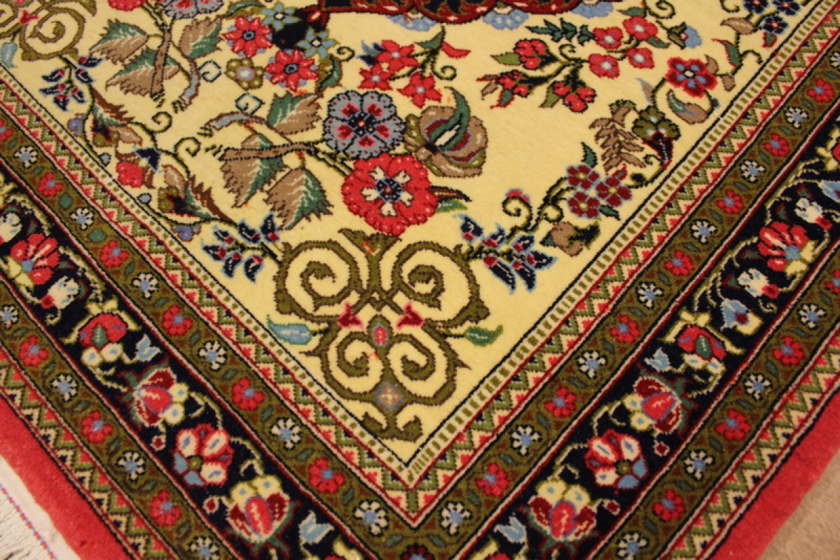 Trotz der vielseitigen Farbpalette hat der Gom-Teppich niemals grelle Farkontraste, sondern achtet auf eine harmonische Farbabstimmung. Bemerkenswert ist auch die äußerst exakte Knüpfung, die fast an Maschinenarbeit erinnert.