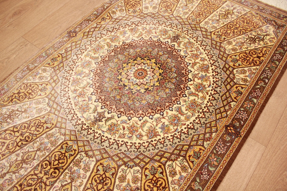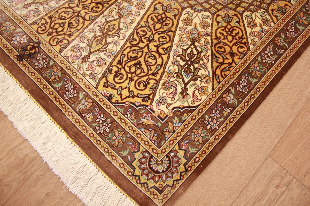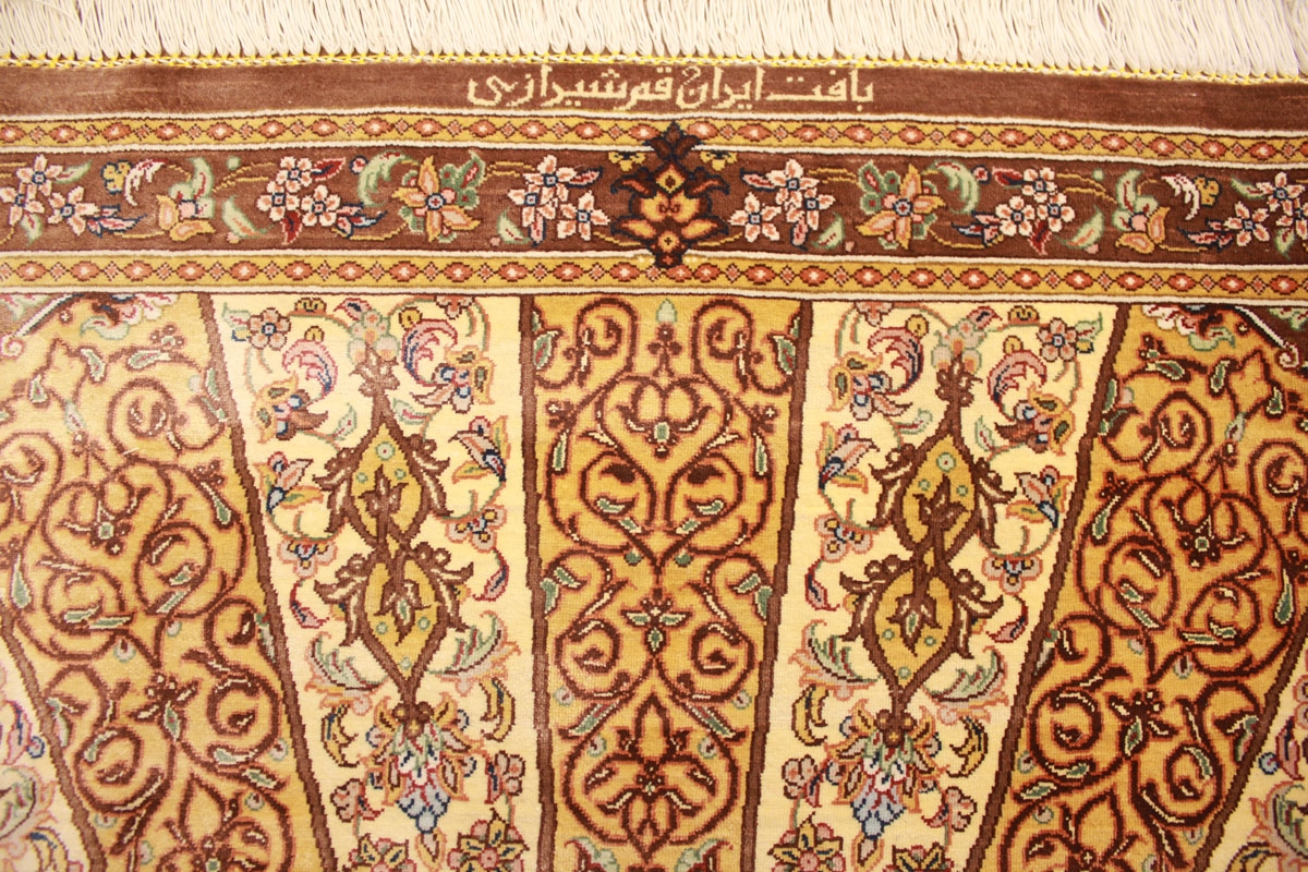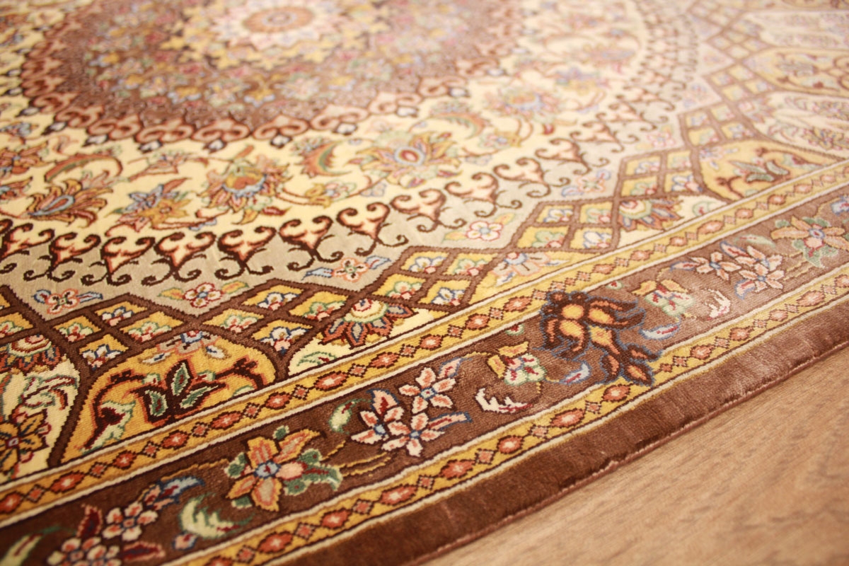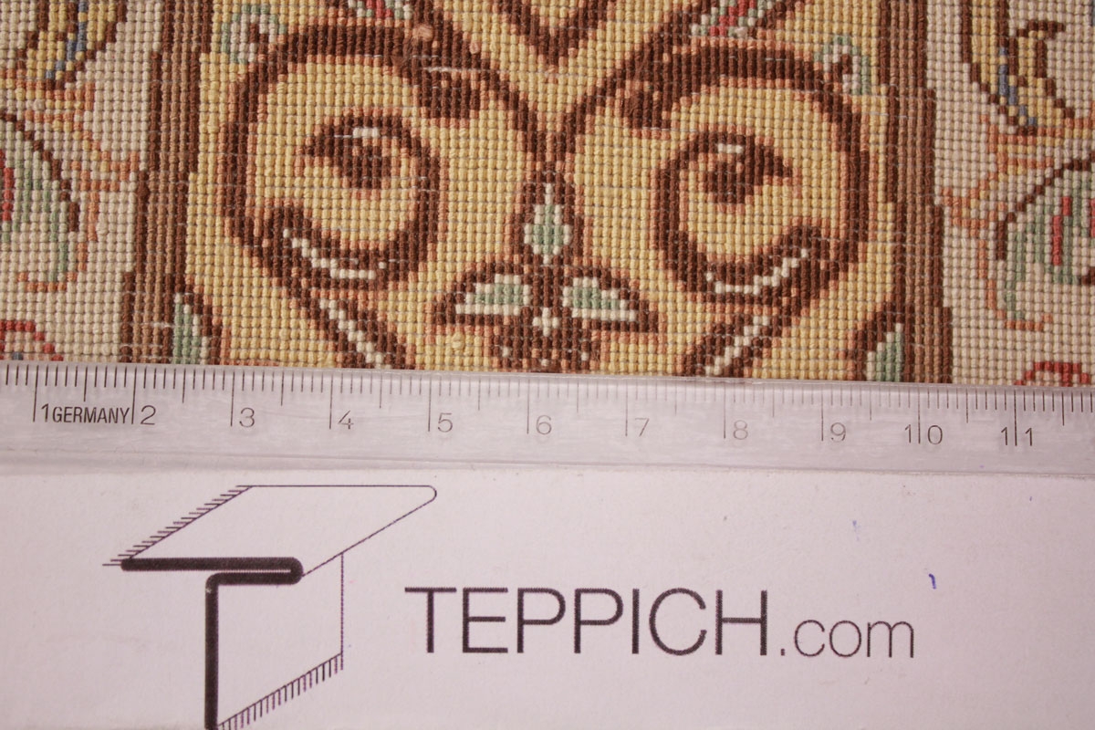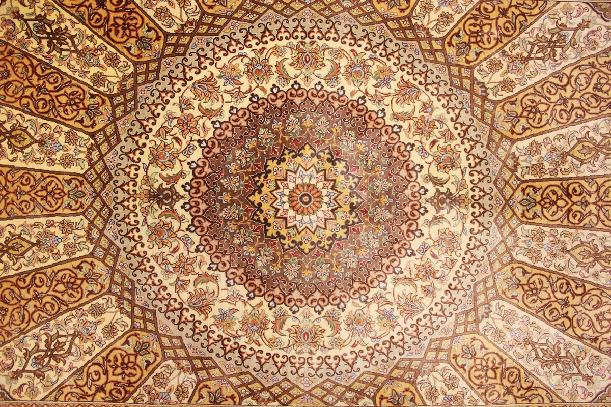 Trotz der vielseitigen Farbpalette hat der Ghom-Teppich niemals grelle Farkontraste, sondern achtet auf eine harmonische Farbabstimmung. Bemerkenswert ist auch die äußerst exakte Knüpfung, die fast an Maschinenarbeit erinnert.