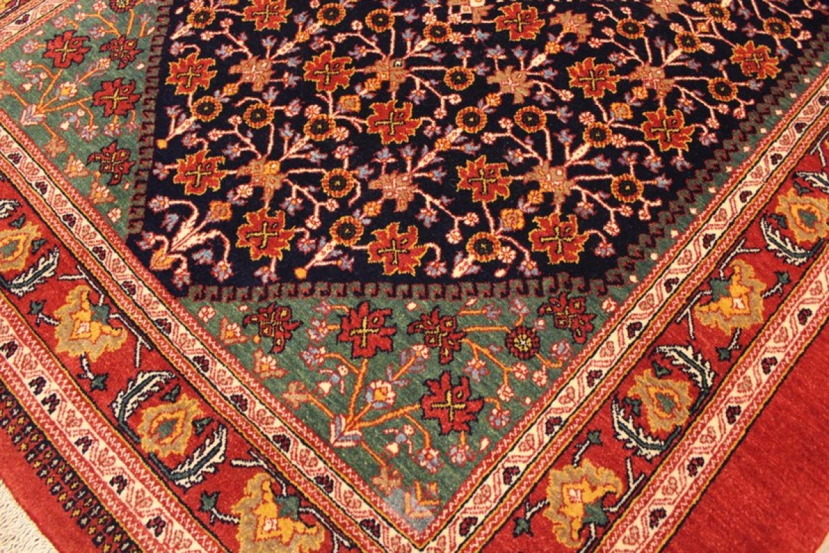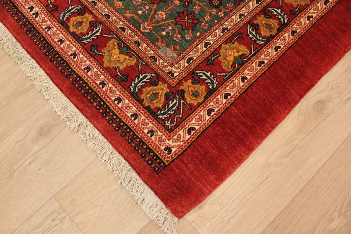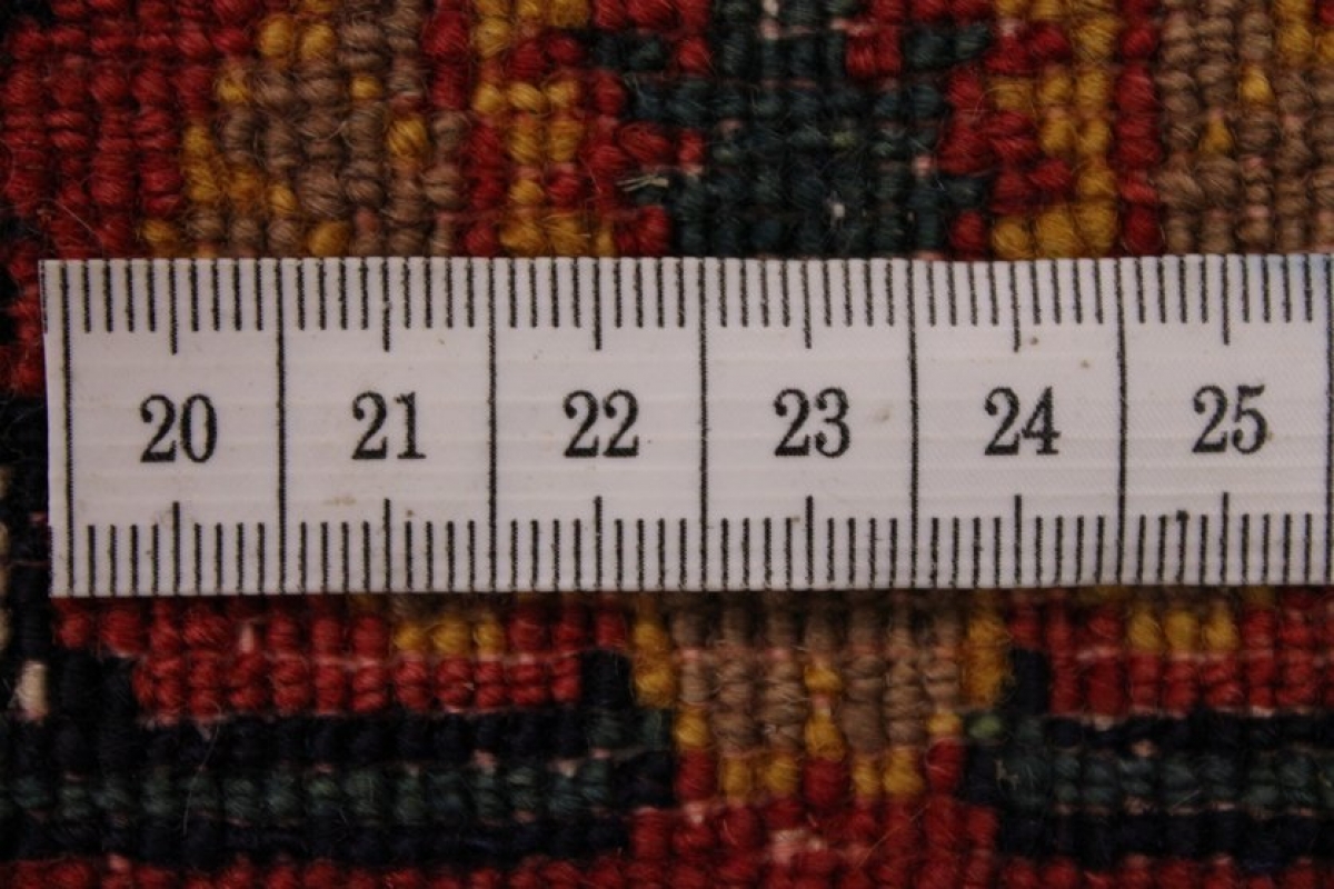 Vertikaler Webstuhl. Kette und Schuss aus Baumwolle. Flor aus Wolle. Türkischer Knoten mit einer Dichte zwischen 30 und 100 Knoten pro Quadratzoll. Die üblichen Maße sind der Dozar und der Treppenteppich oder der Strip.