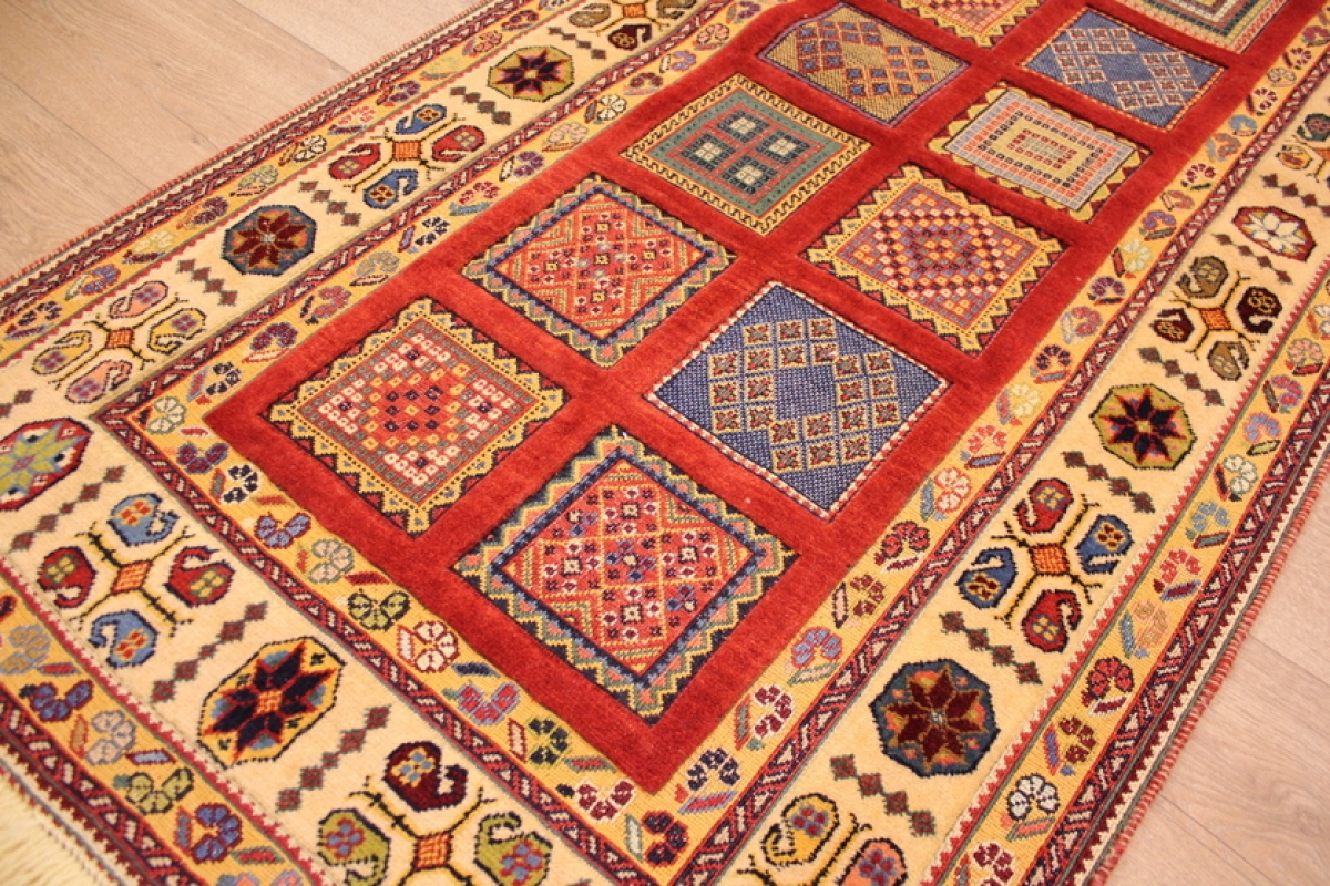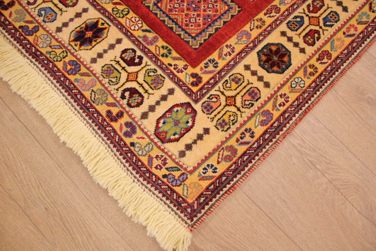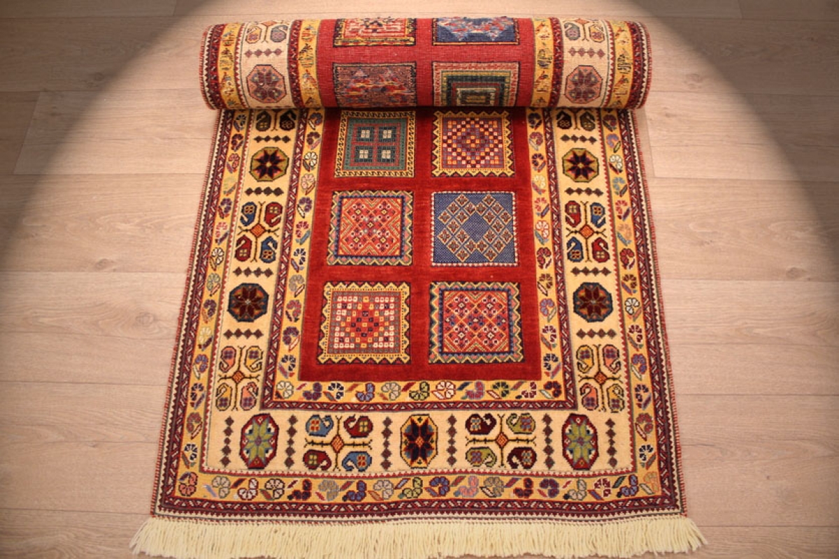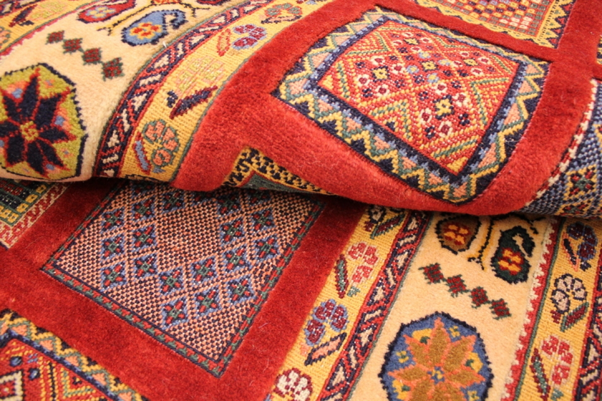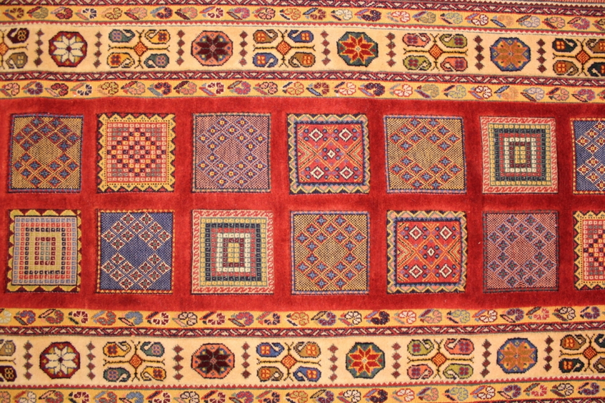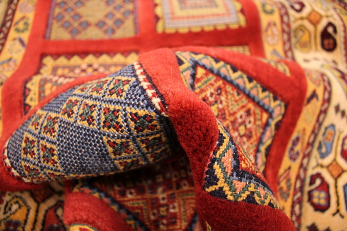 Sie werden sehr kunstvoll geknüpft und sind eine Kombination aus handgewebtem Kelim und handgeknüpftem Teppich.