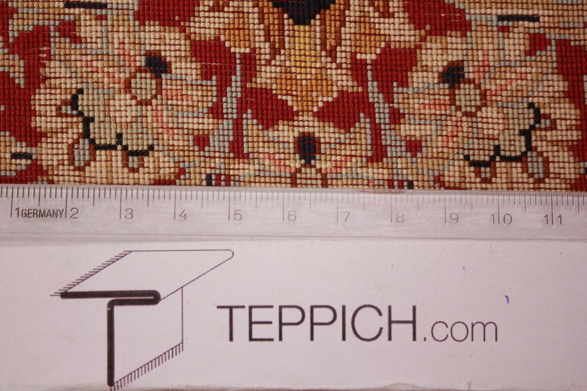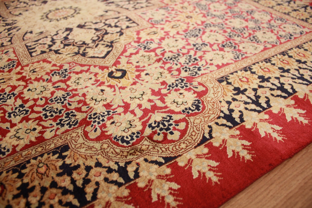 Trotz der vielseitigen Farbpalette hat der Gom-Teppich niemals grelle Farkontraste, sondern achtet auf eine harmonische Farbabstimmung. Bemerkenswert ist auch die äußerst exakte Knüpfung, die fast an Maschinenarbeit erinnert.