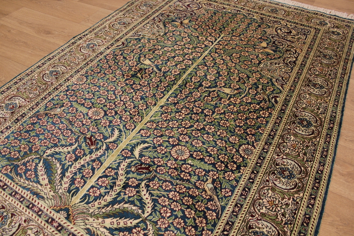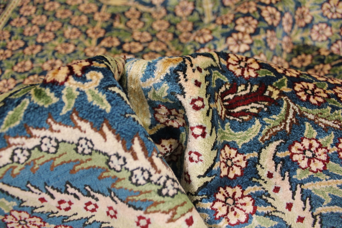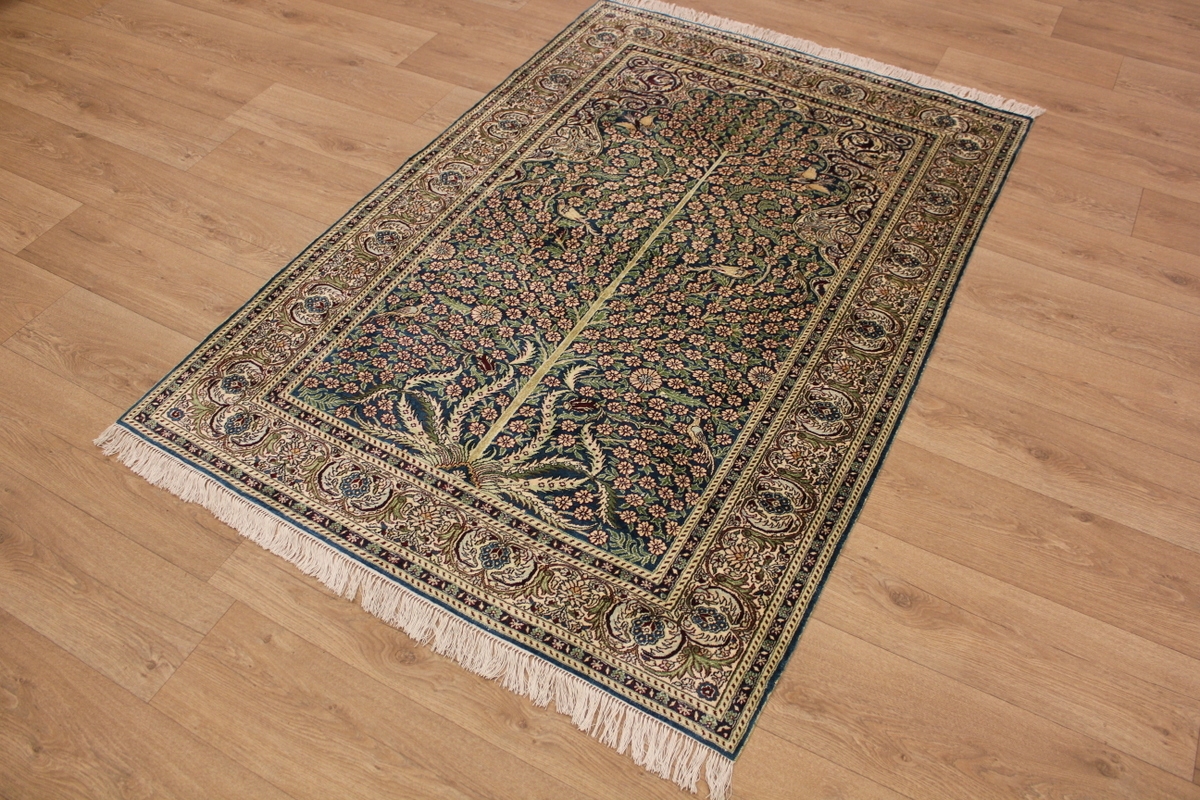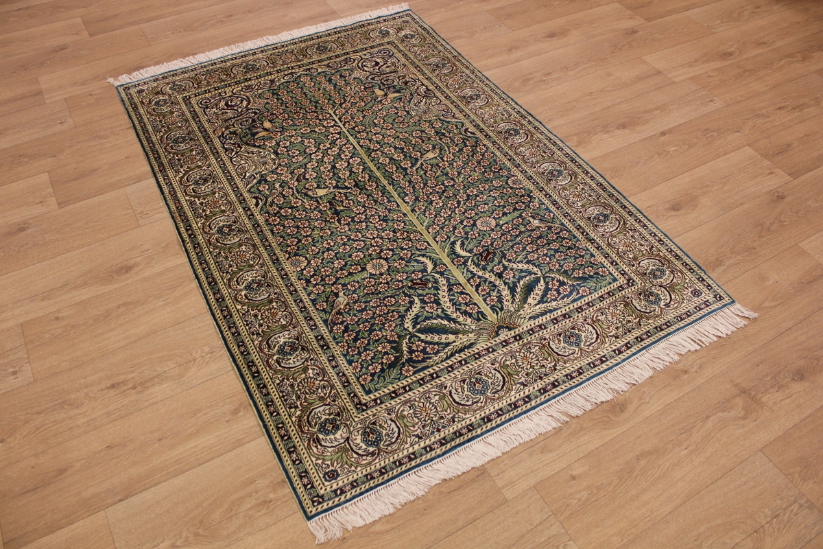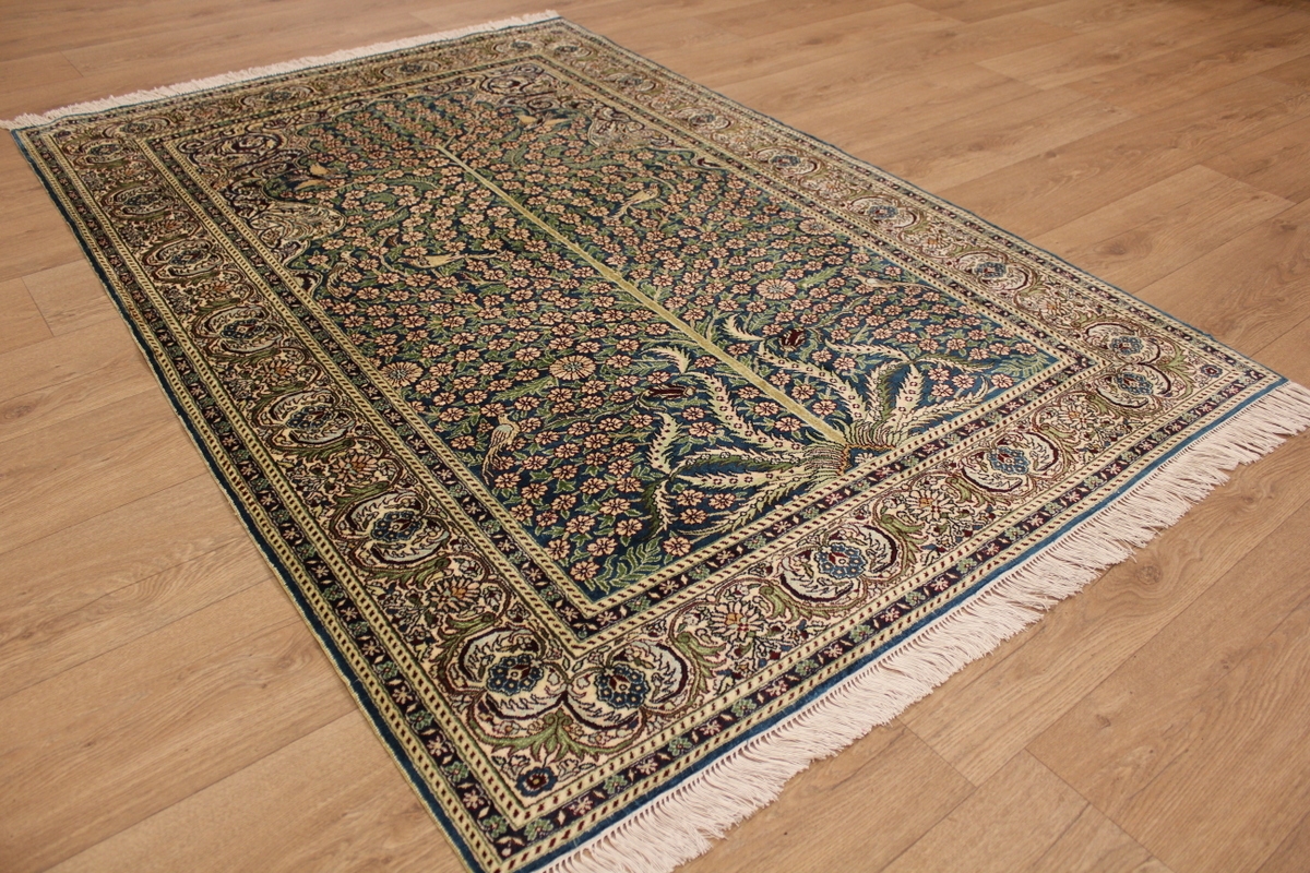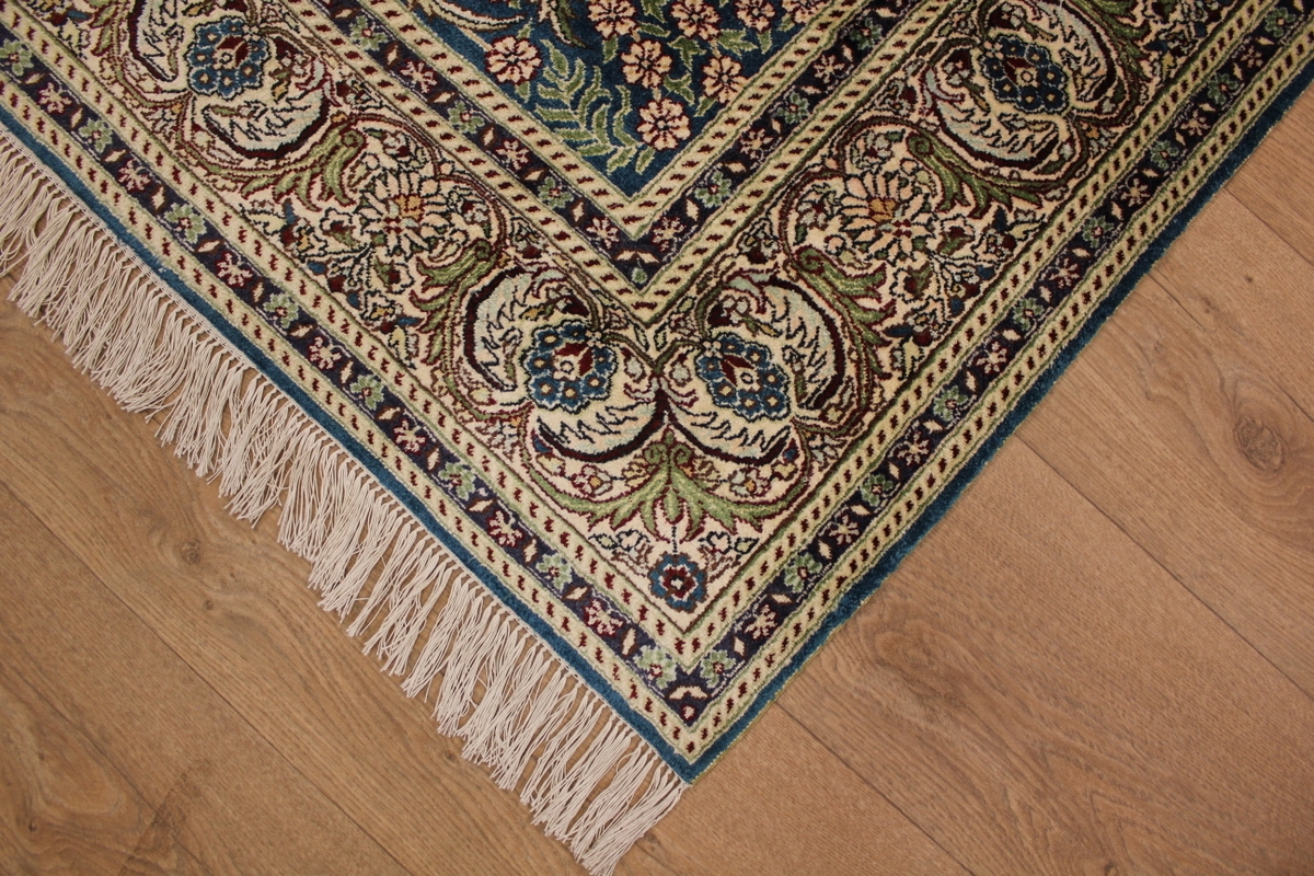 Aufgrund der soliden Wollqualtität und der fast ausschließlichen Verwendung von Naturfarben kann sich der Gom Teppich mit anderen hochwertigen Perserteppichen durchaus messen. Neben guten wollenen Teppichen werden hier in größerer Anzahl Seidenteppiche geknüpft. Als Motive findet man quadratisch unterteilte Gartenteppiche, Jagdschilderungen, Botteh-Motive, Zenrtalmedallions und Vasenmuster. Alle sind liebevoll feingliedrig ausgestattet. Ihre Kolorierung, für die hauptsächlich Naturfarben verwendet werden, reicht von sattem Rot (oft mit leuchtendem Türkis abgestimmt) bis zu lichtblauen, grünen und sogar braunen Tönen. Grundfarbe ist zumeist Elfenbein, zuweilen wird auch Rot als Hintergrundfarbe gewählt.