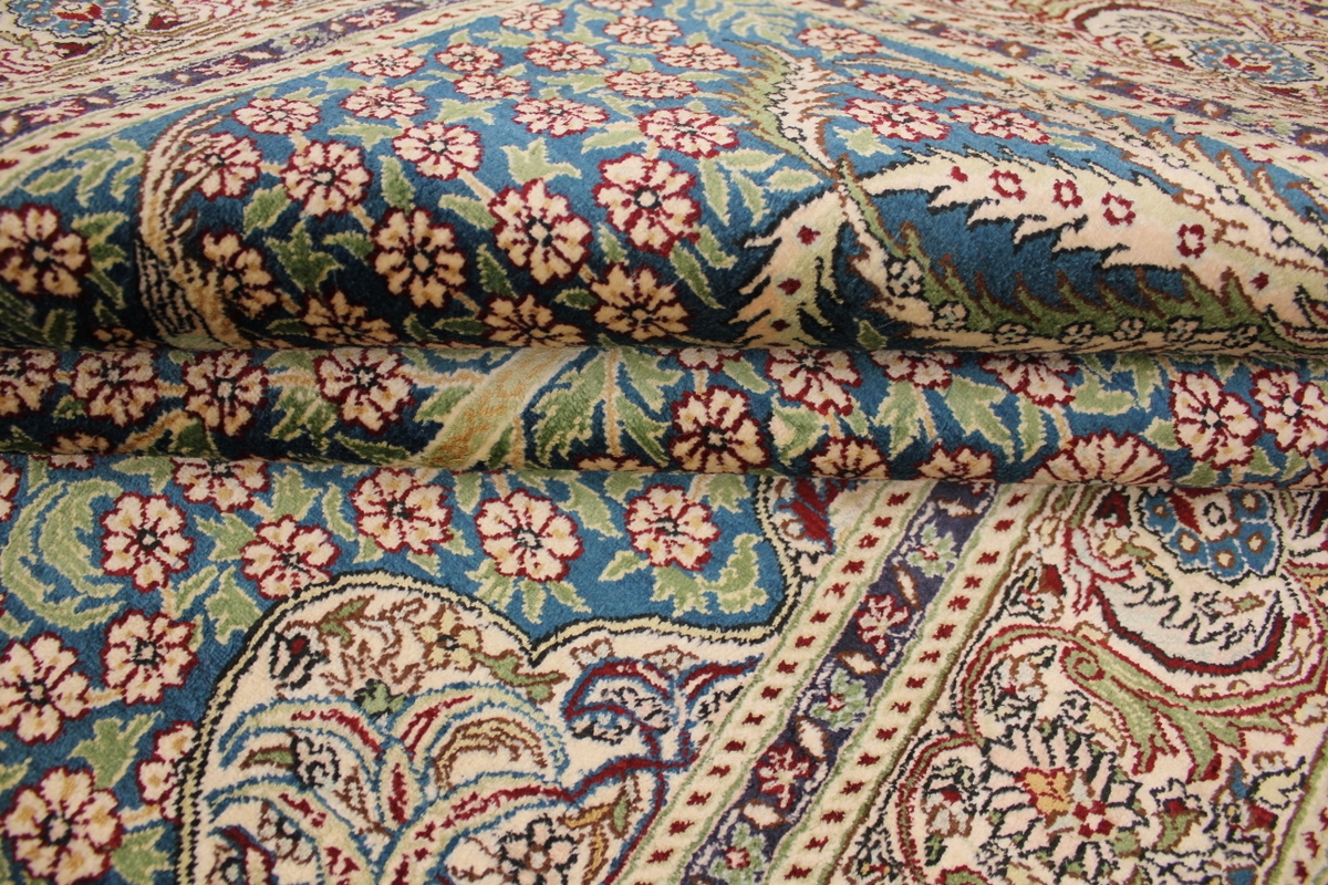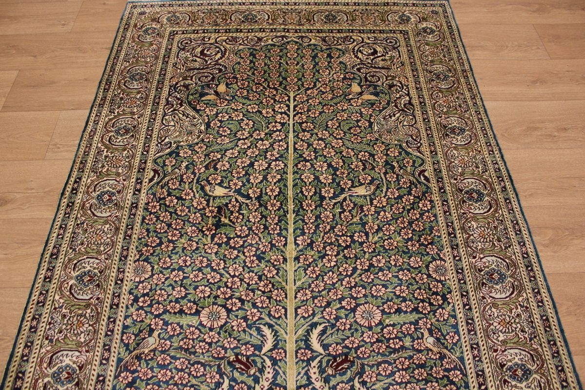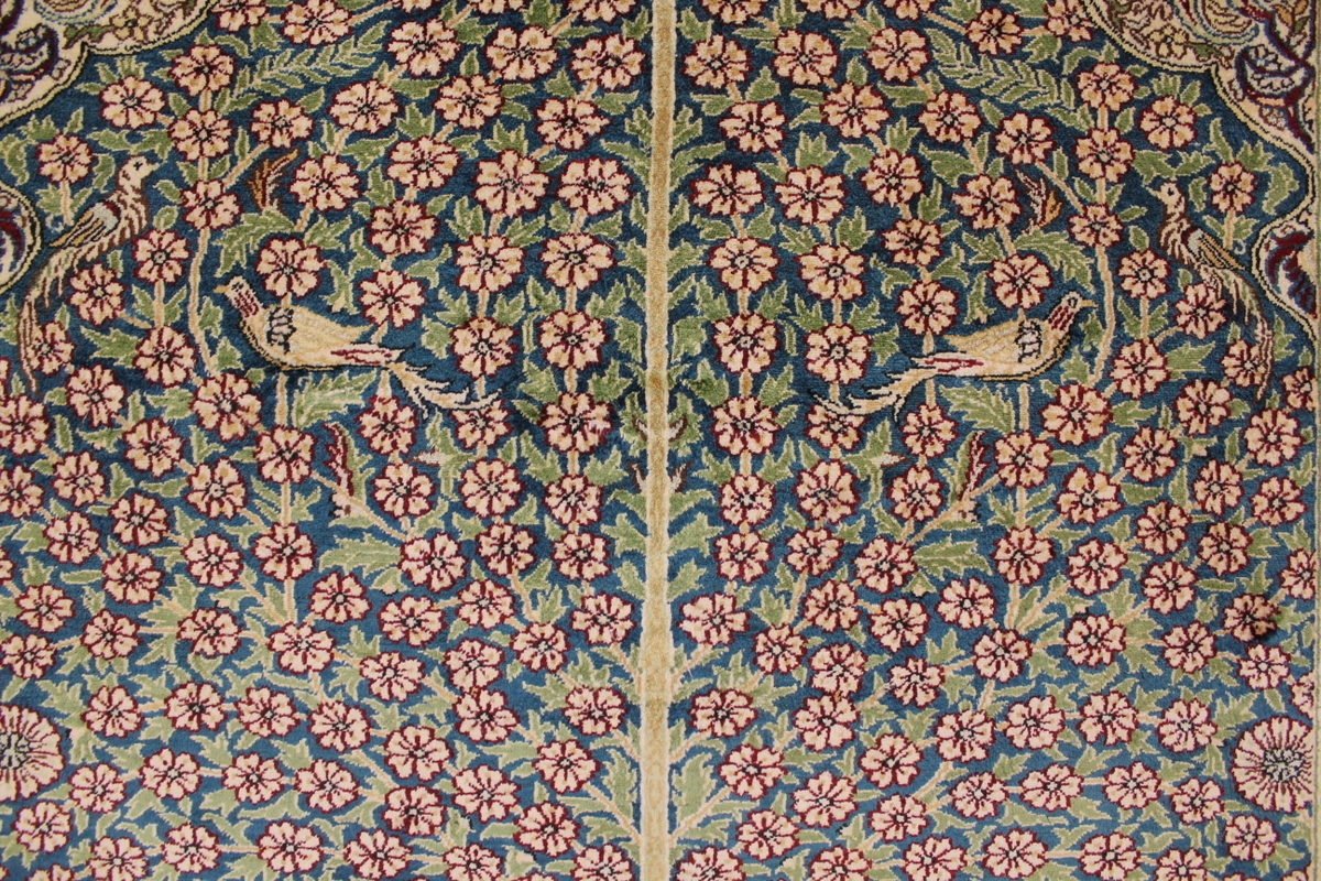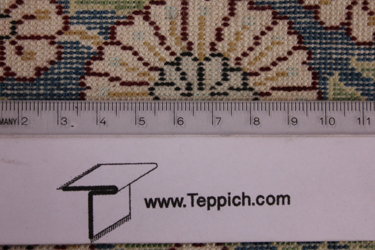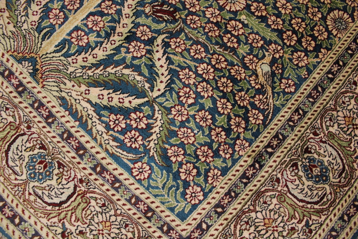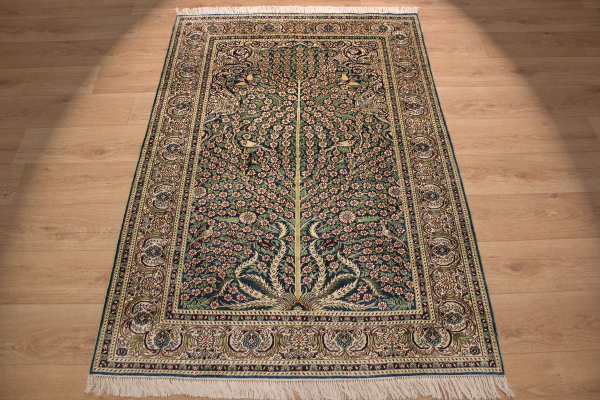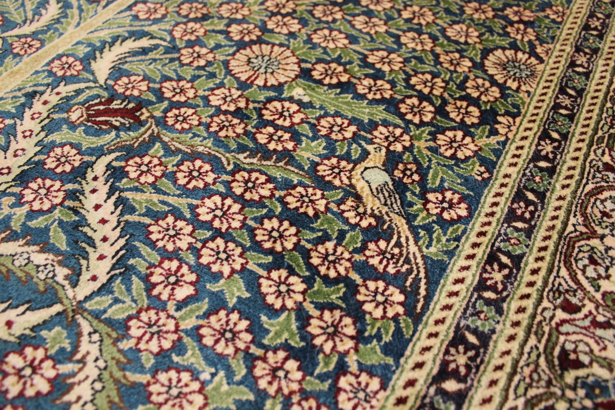Aufgrund der soliden Wollqualtität und der fast ausschließlichen Verwendung von Naturfarben kann sich der Gom Teppich mit anderen hochwertigen Perserteppichen durchaus messen. Neben guten wollenen Teppichen werden hier in größerer Anzahl Seidenteppiche geknüpft. Als Motive findet man quadratisch unterteilte Gartenteppiche, Jagdschilderungen, Botteh-Motive, Zenrtalmedallions und Vasenmuster. Alle sind liebevoll feingliedrig ausgestattet. Ihre Kolorierung, für die hauptsächlich Naturfarben verwendet werden, reicht von sattem Rot (oft mit leuchtendem Türkis abgestimmt) bis zu lichtblauen, grünen und sogar braunen Tönen. Grundfarbe ist zumeist Elfenbein, zuweilen wird auch Rot als Hintergrundfarbe gewählt.