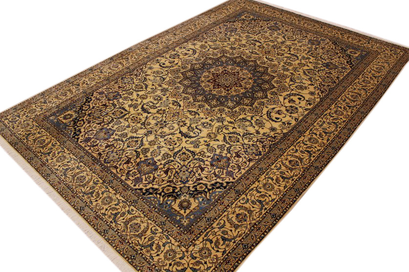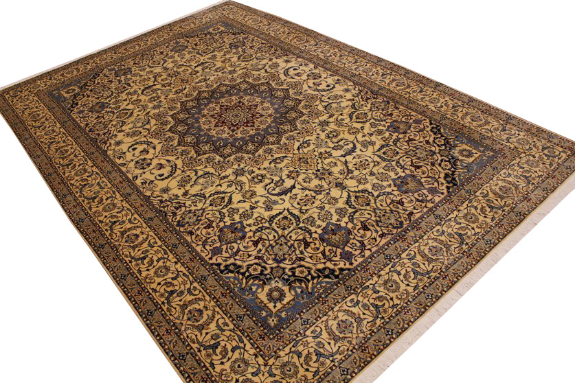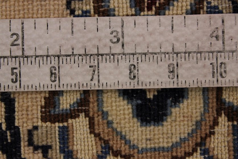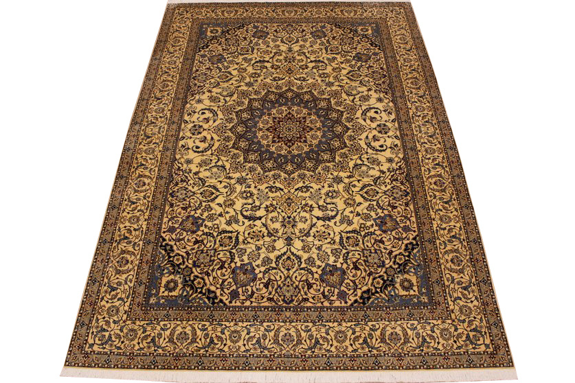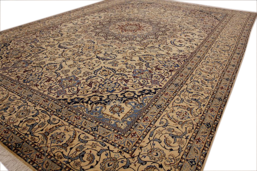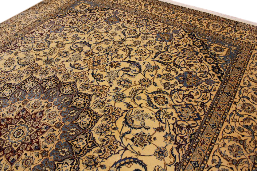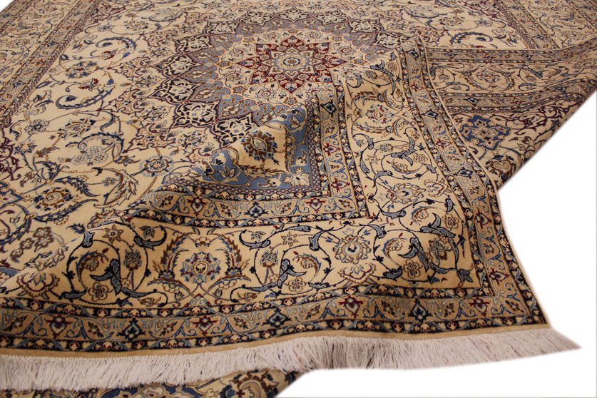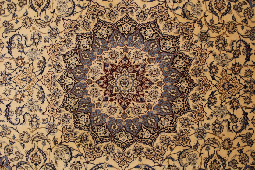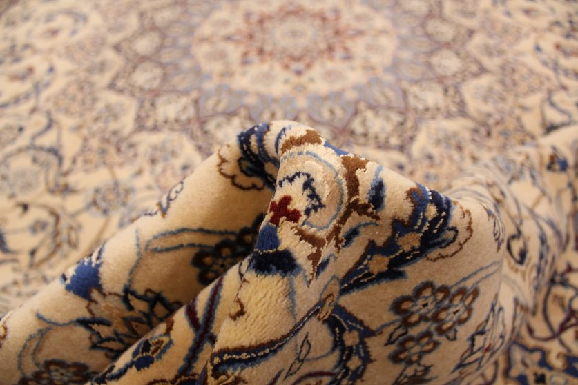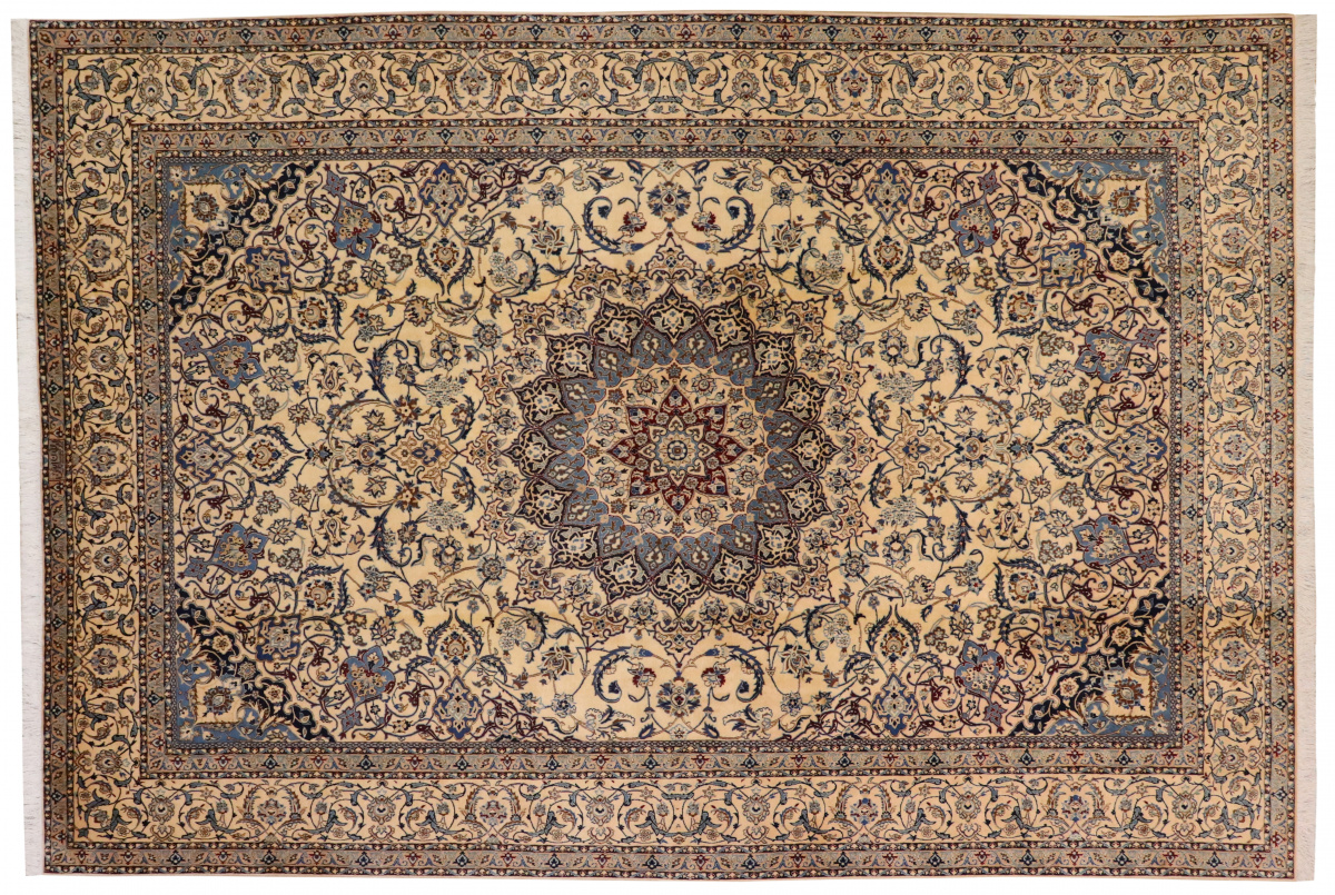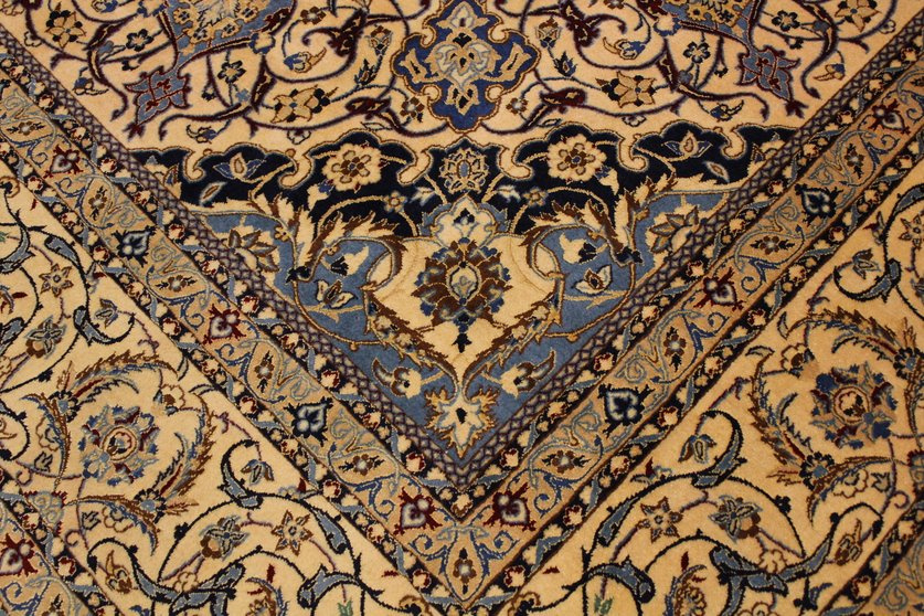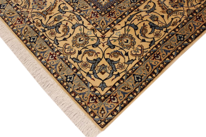 Nain Teppiche sind entweder durchgemustert oder mit Medallion. Typische Farbkombinationen von Nain Teppichen sind Blau-Beige oder Rot-Beige und selten Grün-Beige.