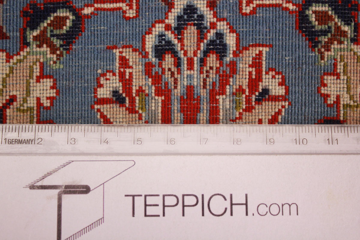 Der Saum von Isfahan-Teppichen besteht in der Regel aus einem großen mittleren Streifen, der von zwei schmalen Sicherheitsstreifen umgeben ist. Eine breite Farbpalette findet bei Isfahan-Teppichen Verwendung, und ihre Knüpfer sind Meister im Gestalten harmonischer Kombinationen aus Untergrund und Design, wobei sie mit hellen und dunklen Farben zu variieren wissen.