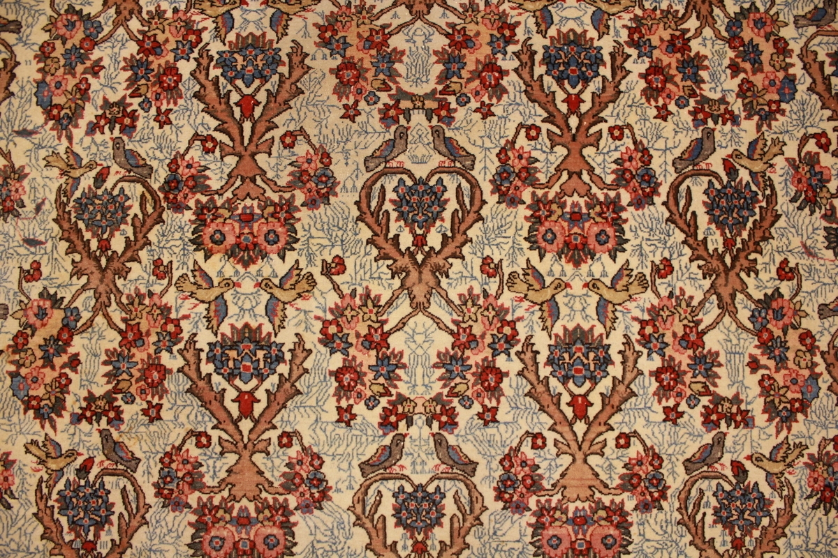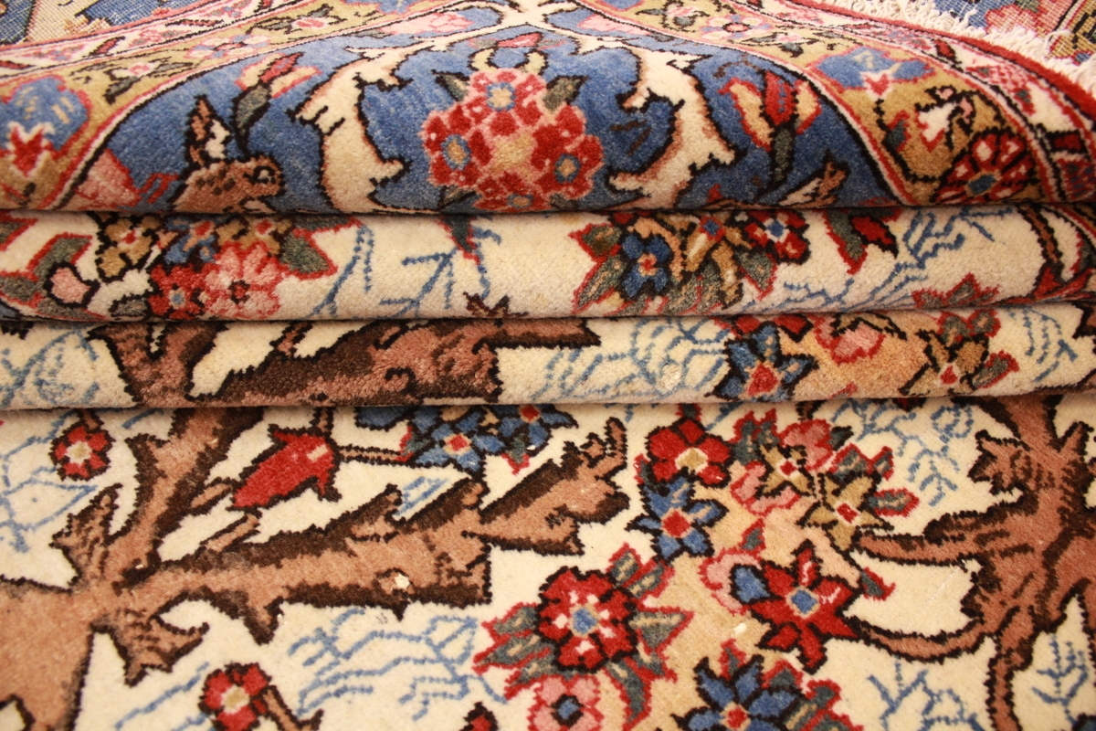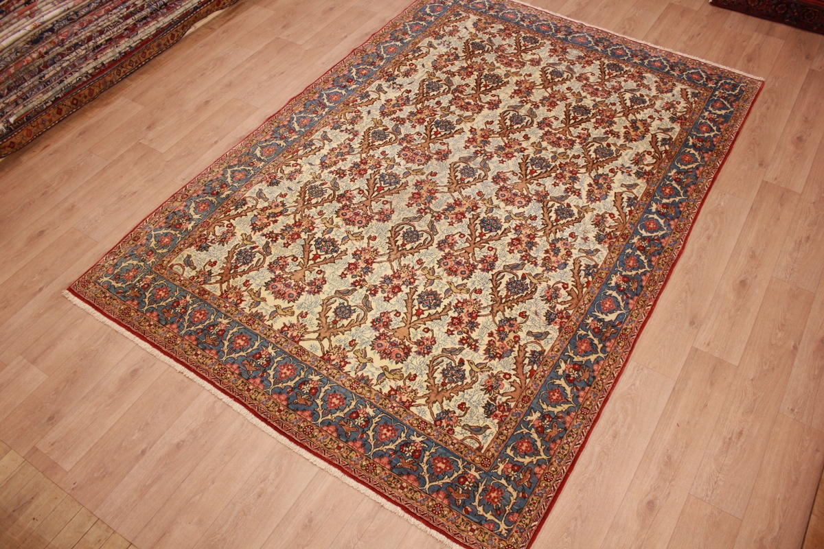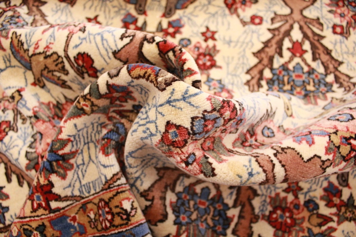 Trotz der vielseitigen Farbpalette hat der Gom-Teppich niemals grelle Farkontraste, sondern achtet auf eine harmonische Farbabstimmung. Bemerkenswert ist auch die äußerst exakte Knüpfung, die fast an Maschinenarbeit erinnert.