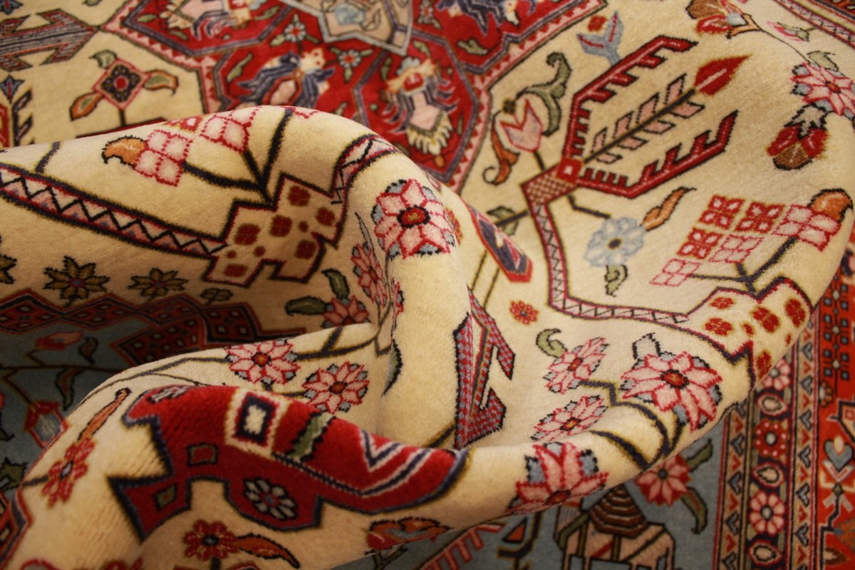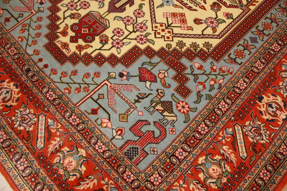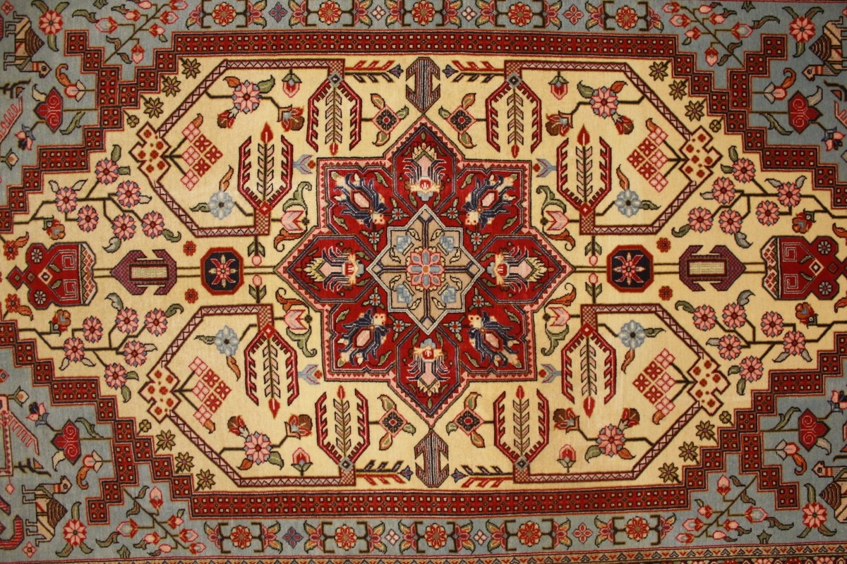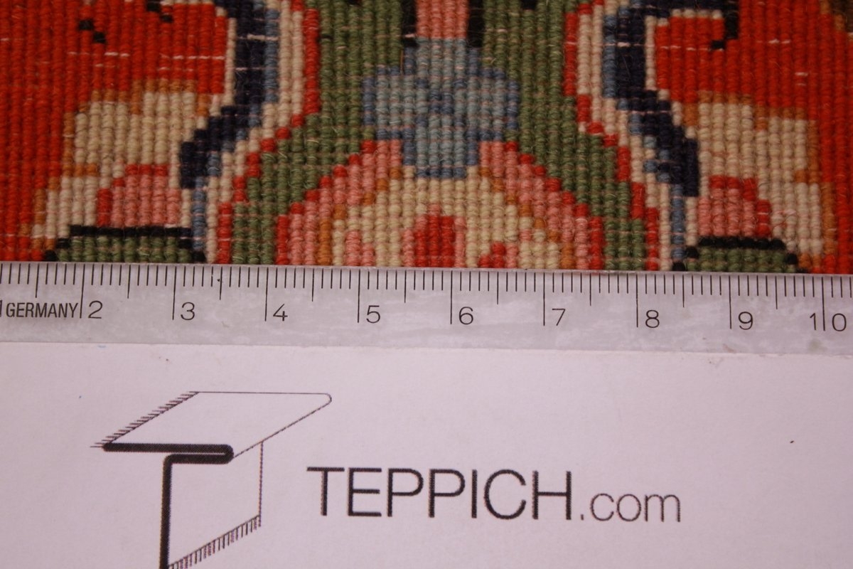 Trotz der vielseitigen Farbpalette hat der Gom-Teppich niemals grelle Farkontraste, sondern achtet auf eine harmonische Farbabstimmung. Bemerkenswert ist auch die äußerst exakte Knüpfung, die fast an Maschinenarbeit erinnert.
