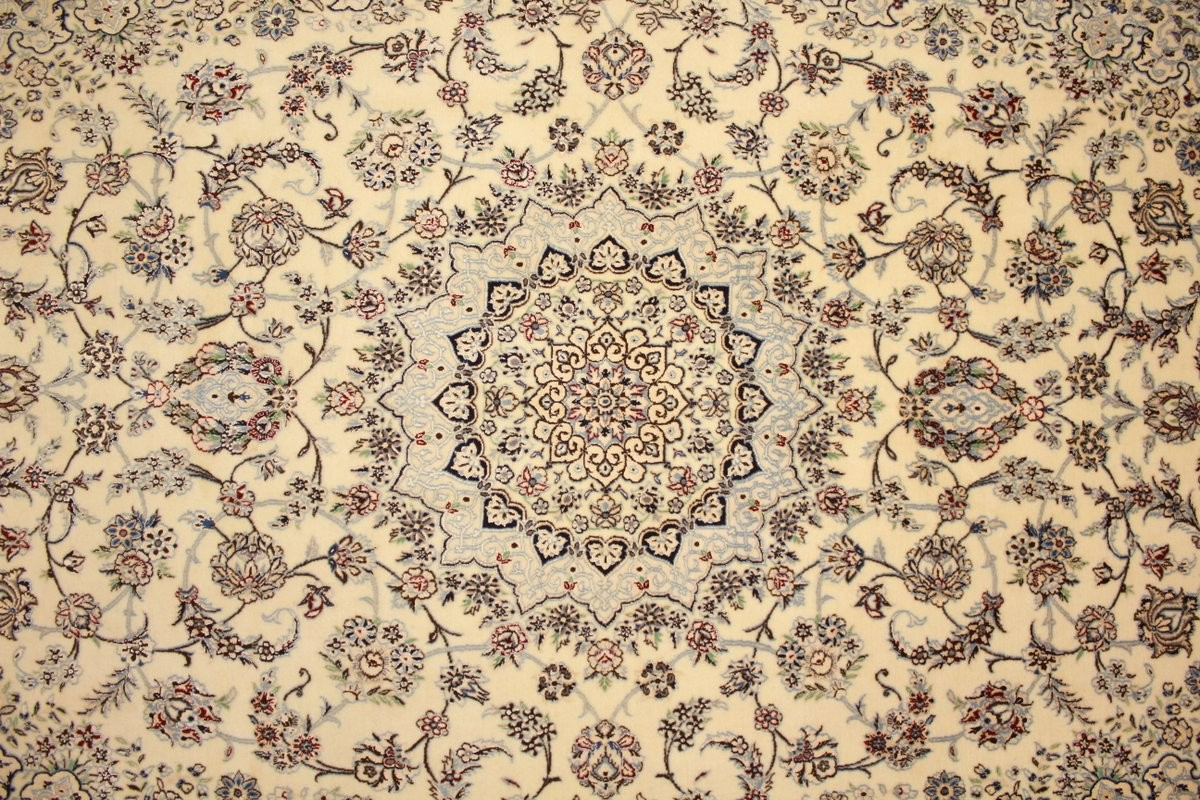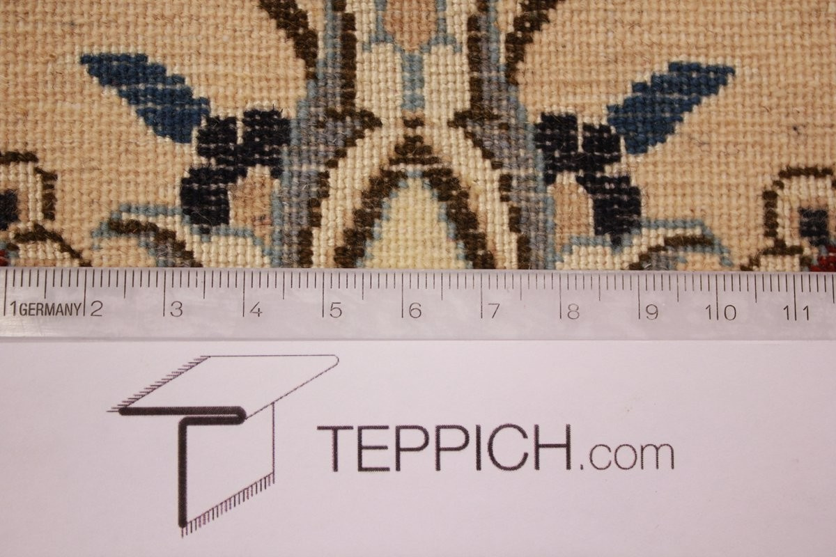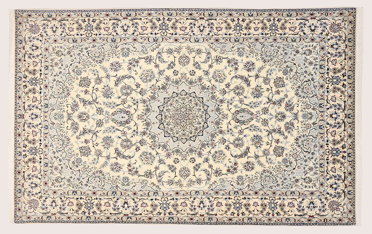 Nain Teppiche sind entweder durchgemustert oder mit Medallion. Typische Farbkombinationen von Nain Teppichen sind Blau-Beige oder Rot-Beige und selten Grün-Beige.