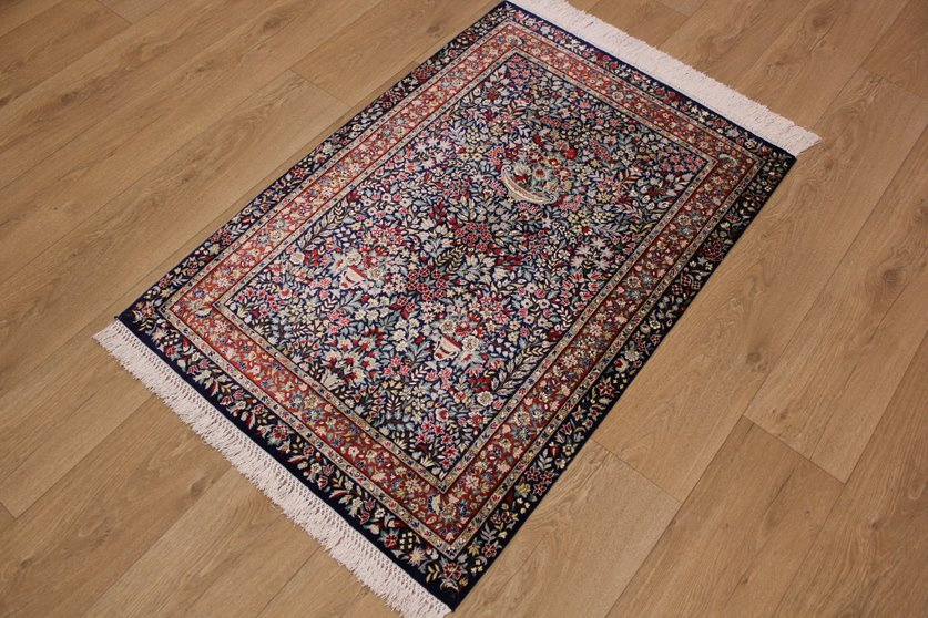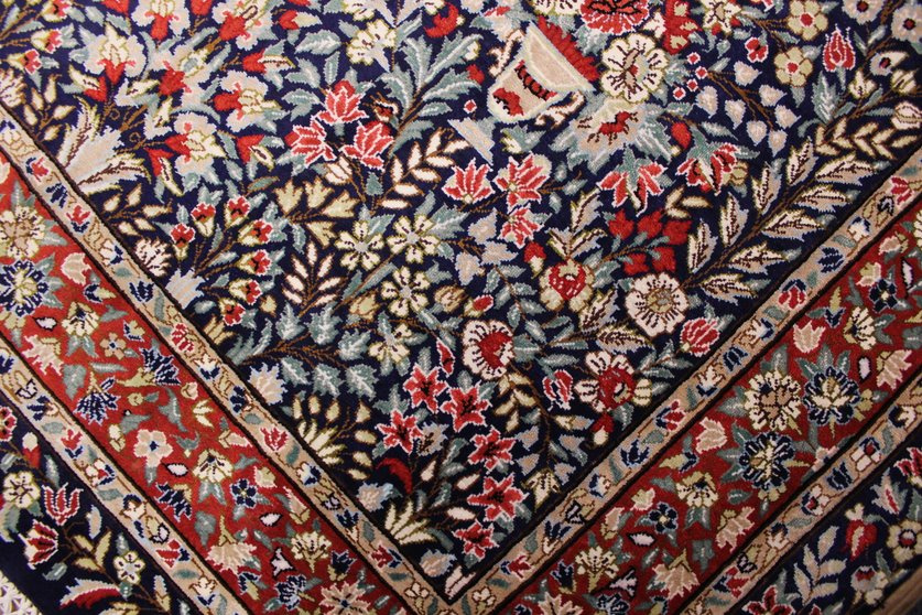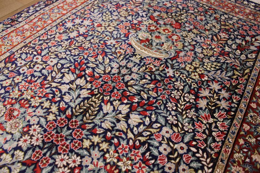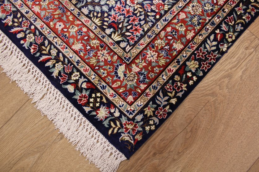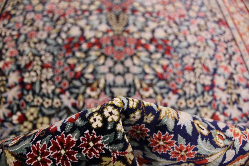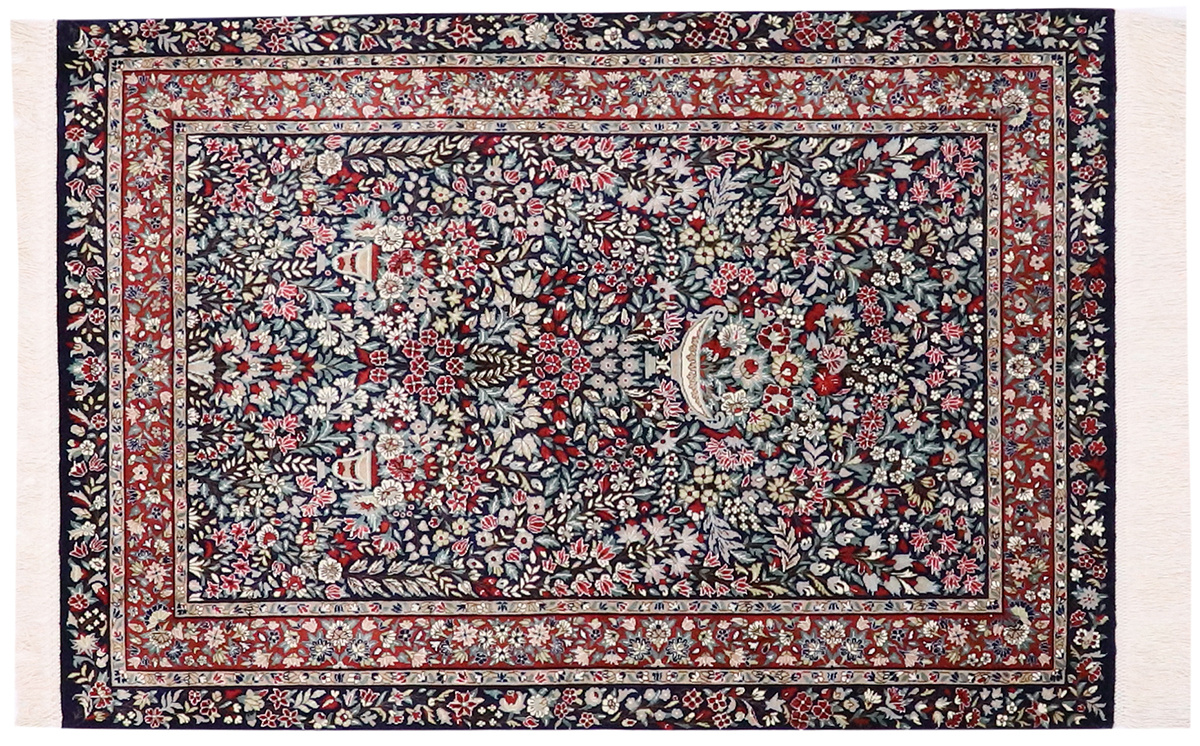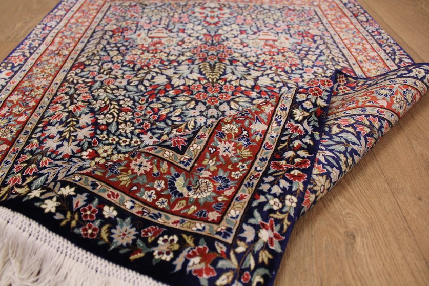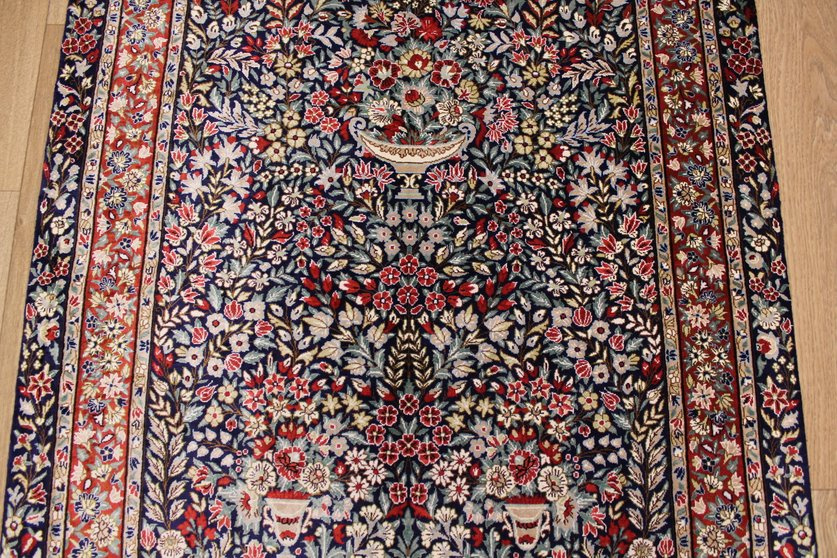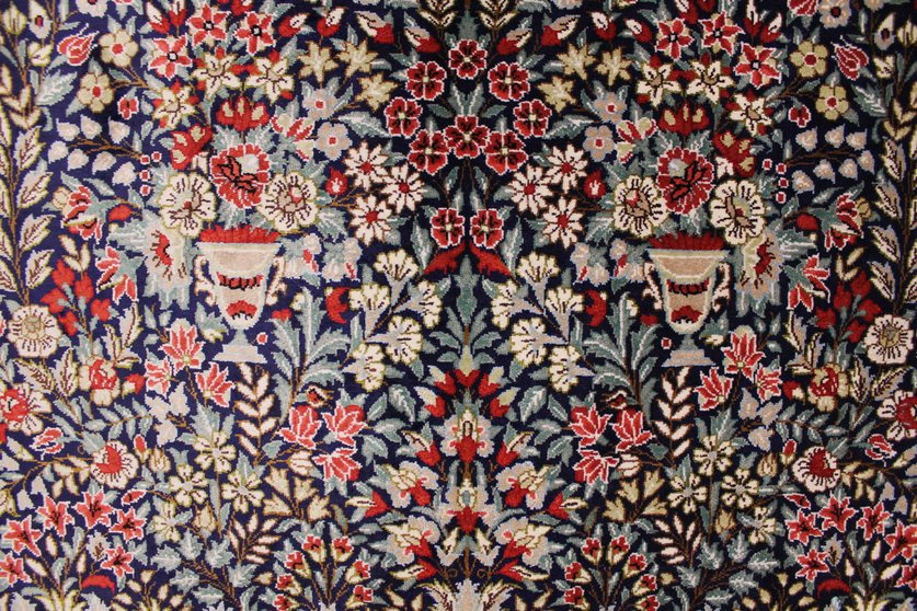 Trotz der vielseitigen Farbpalette hat der Gom-Teppich niemals grelle Farkontraste, sondern achtet auf eine harmonische Farbabstimmung. Bemerkenswert ist auch die äußerst exakte Knüpfung, die fast an Maschinenarbeit erinnert.