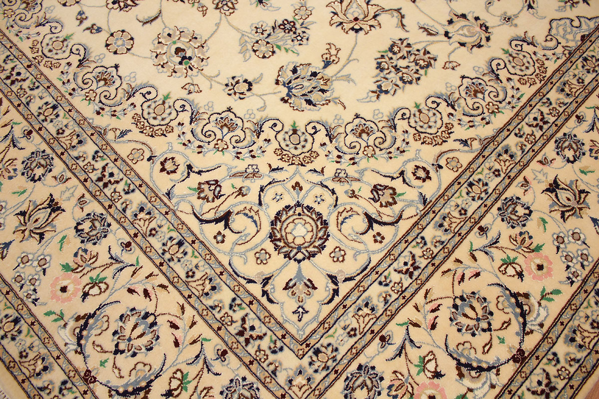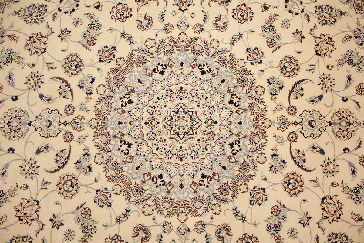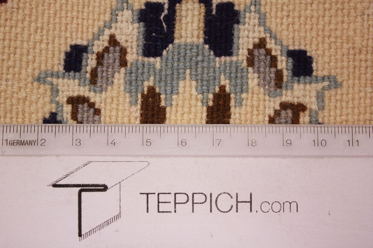 Nain Teppiche sind entweder durchgemustert oder mit Medallion. Typische Farbkombinationen von Nain Teppichen sind Blau-Beige oder Rot-Beige und selten Grün-Beige.
