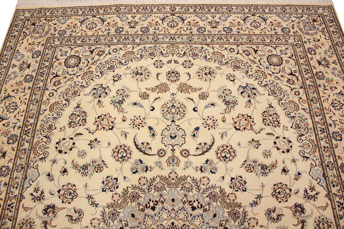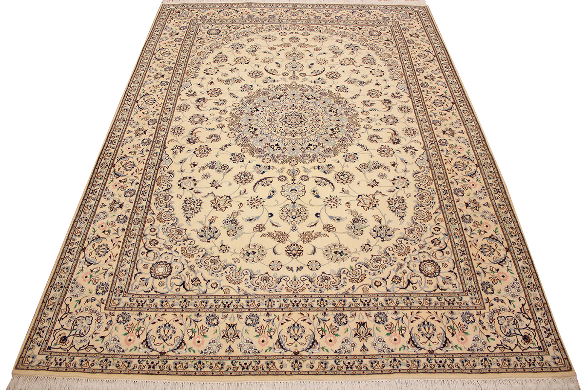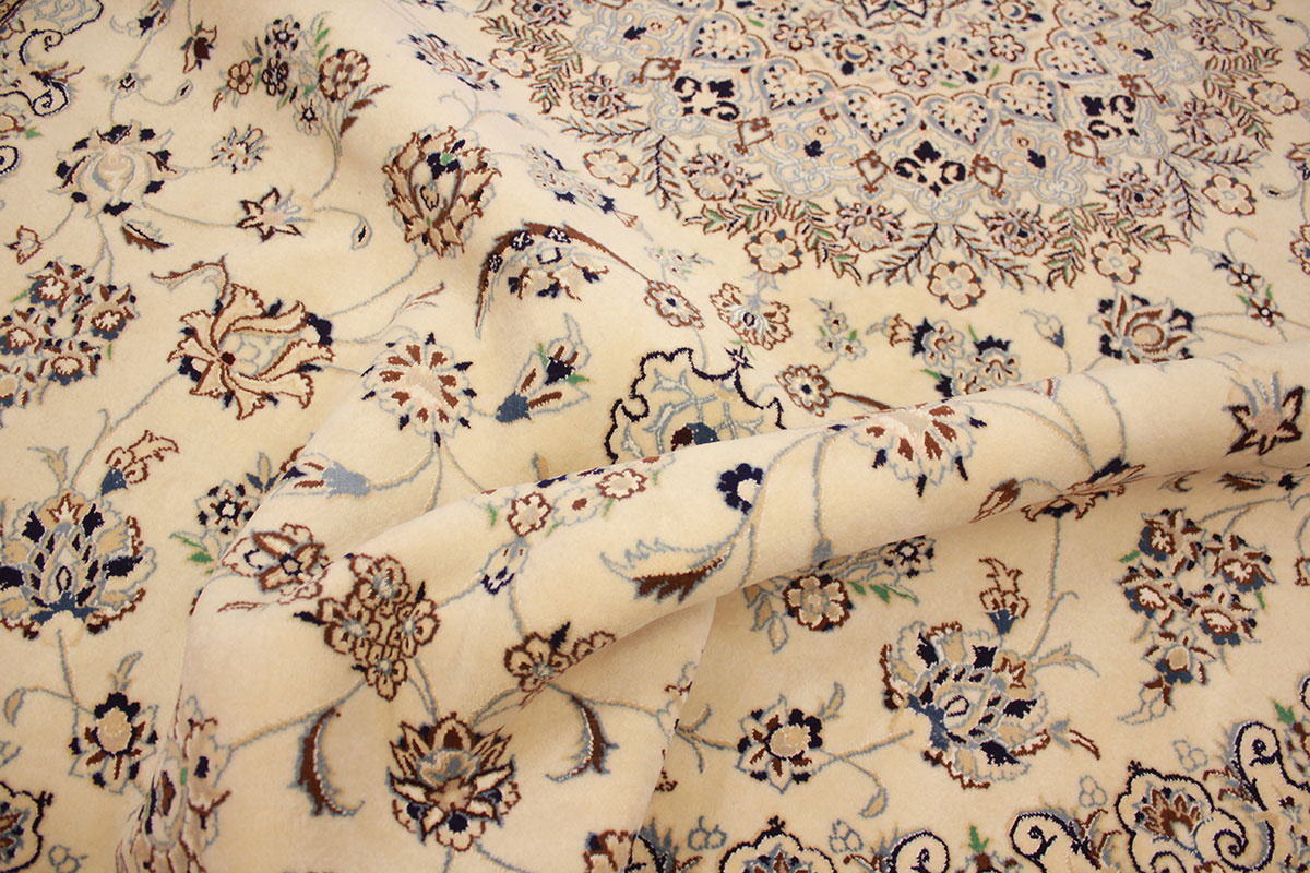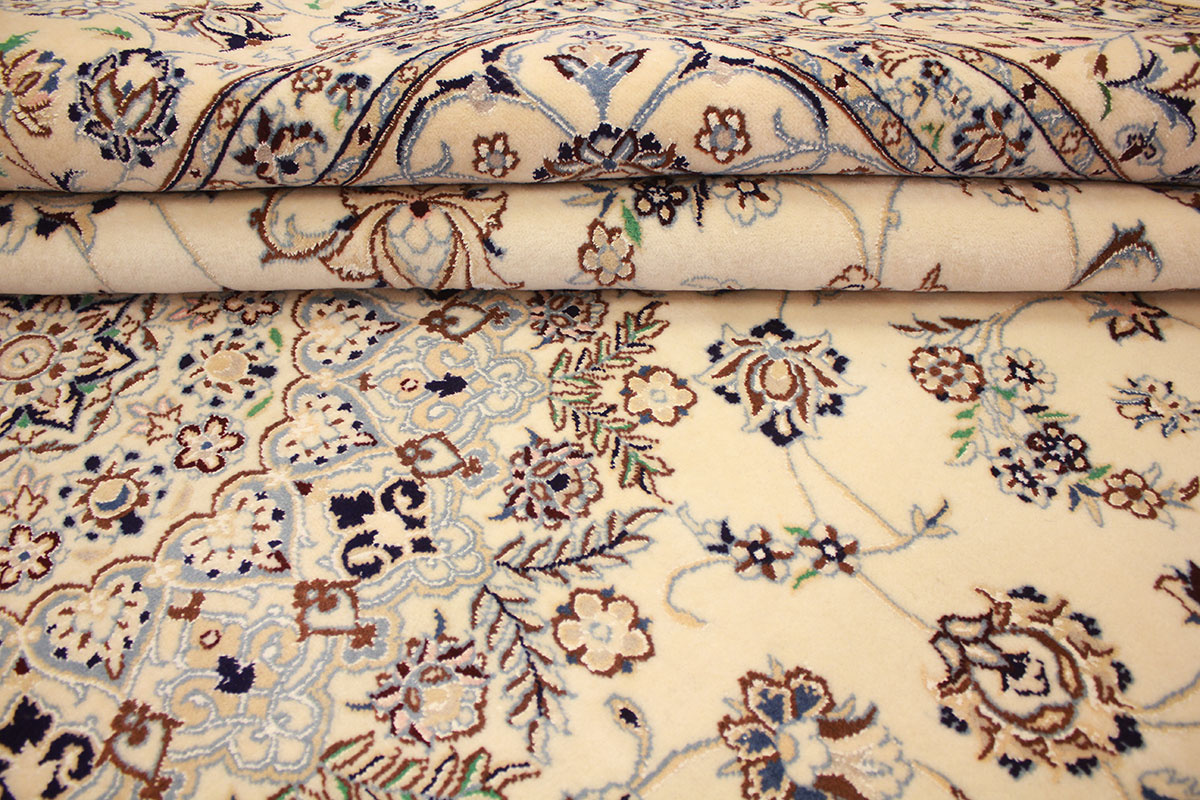 Nain Teppiche sind entweder durchgemustert oder mit Medallion. Typische Farbkombinationen von Nain Teppichen sind Blau-Beige oder Rot-Beige und selten Grün-Beige.