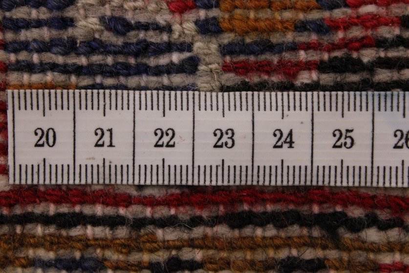 Vertikaler Webstuhl. Kette und Schuss aus Baumwolle. Flor aus Wolle. Türkischer Knoten mit einer Dichte zwischen 30 und 100 Knoten pro Quadratzoll. Die üblichen Maße sind der Dozar und der Treppenteppich oder der Strip.