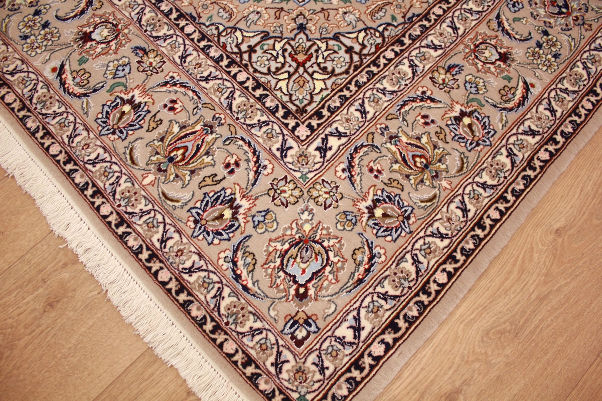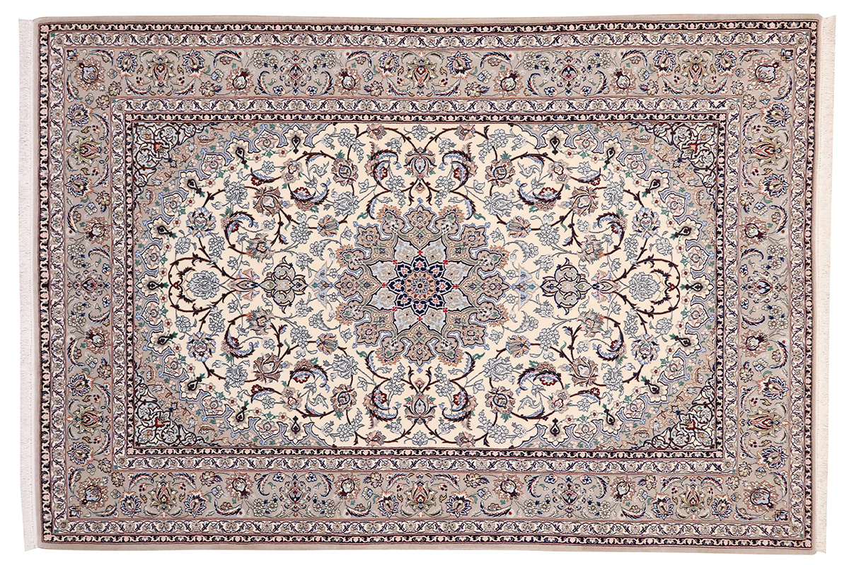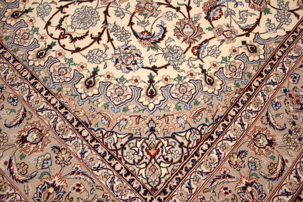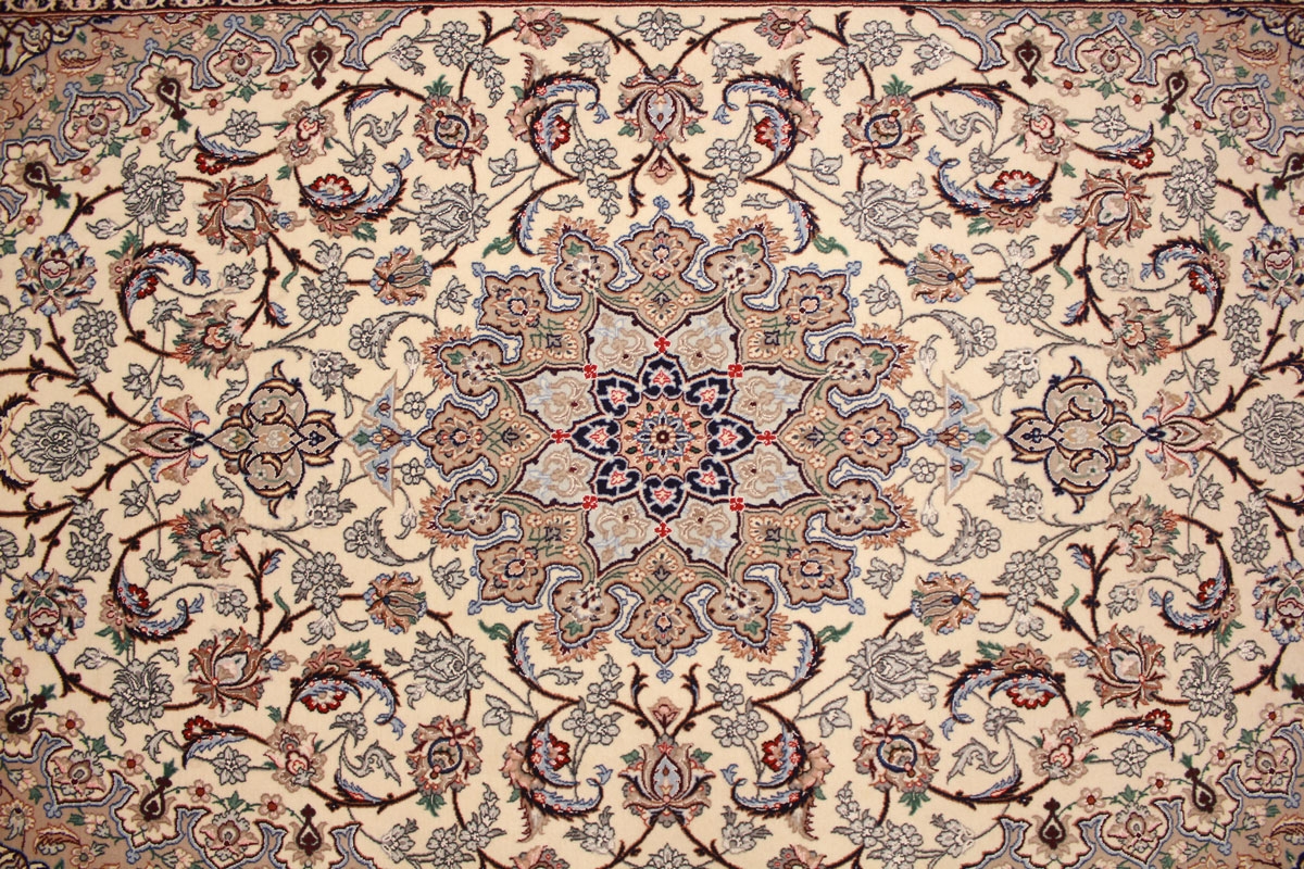 Eine breite Farbpalette findet bei Isfahan-Teppichen Verwendung, und ihre Knüpfer sind Meister im Gestalten harmonischer Kombinationen aus Untergrund und Design, wobei sie mit hellen und dunklen Farben zu variieren wissen.