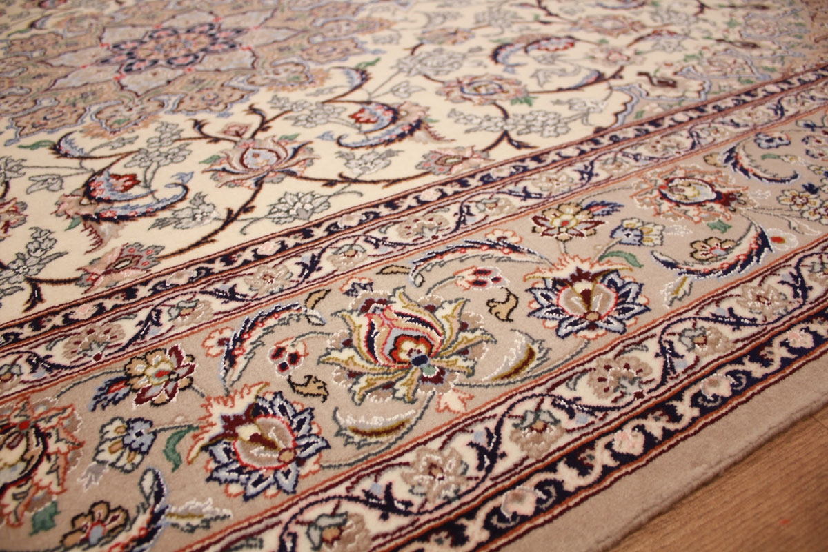 Der Saum von Isfahan-Teppichen besteht in der Regel aus einem großen mittleren Streifen, der von zwei schmalen Sicherheitsstreifen umgeben ist. Eine breite Farbpalette findet bei Isfahan-Teppichen Verwendung, und ihre Knüpfer sind Meister im Gestalten harmonischer Kombinationen aus Untergrund und Design, wobei sie mit hellen und dunklen Farben zu variieren wissen.