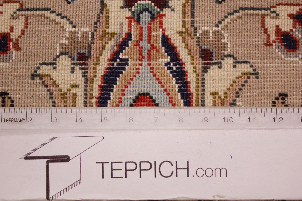 Technische Details Vertikaler Webstuhl, vorwiegend in Privathäusern in der Stadt. Die Rückseite ist aus Baumwolle, der Flor aus sehr knapp geschnittener Wolle. Einige Exemplare besitzen einen Flor aus Seide. Der persische Knoten wird verwendet, und die Dichte ist sehr hoch: von 160 bis 400 Knoten pro Quadratzoll. Alle Isfahan-Teppiche haben ein Blumendesign, in der Regel mit einem Medaillon in der Mitte eines Bereiches, der von einem Motiv ineinander verflochtener Blumenzweige geschmückt ist.