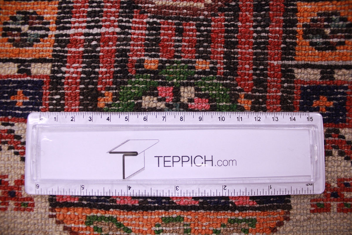 Vertikaler Webstuhl. Kette und Schuss aus Baumwolle. Flor aus Wolle. Türkischer Knoten mit einer Dichte zwischen 30 und 100 Knoten pro Quadratzoll. Die üblichen Maße sind der Dozar und der Treppenteppich oder der Strip.