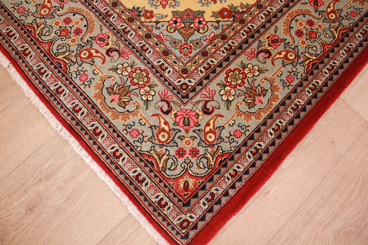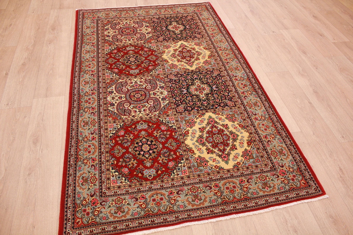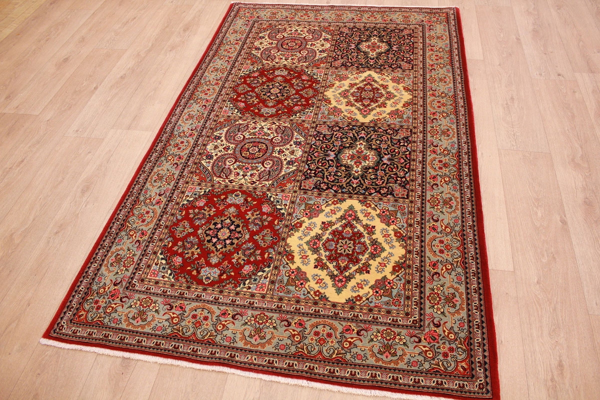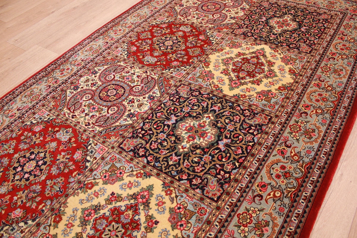 Aufgrund der soliden Wollqualtität und der fast ausschließlichen Verwendung von Naturfarben kann sich der Gom Teppich mit anderen hochwertigen Perserteppichen durchaus messen. Neben guten wollenen Teppichen werden hier in größerer Anzahl Seidenteppiche geknüpft. Als Motive findet man quadratisch unterteilte Gartenteppiche, Jagdschilderungen, Botteh-Motive, Zenrtalmedallions und Vasenmuster. Alle sind liebevoll feingliedrig ausgestattet. Ihre Kolorierung, für die hauptsächlich Naturfarben verwendet werden, reicht von sattem Rot (oft mit leuchtendem Türkis abgestimmt) bis zu lichtblauen, grünen und sogar braunen Tönen. Grundfarbe ist zumeist Elfenbein, zuweilen wird auch Rot als Hintergrundfarbe gewählt.