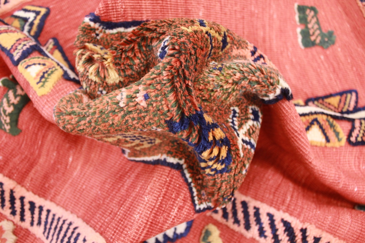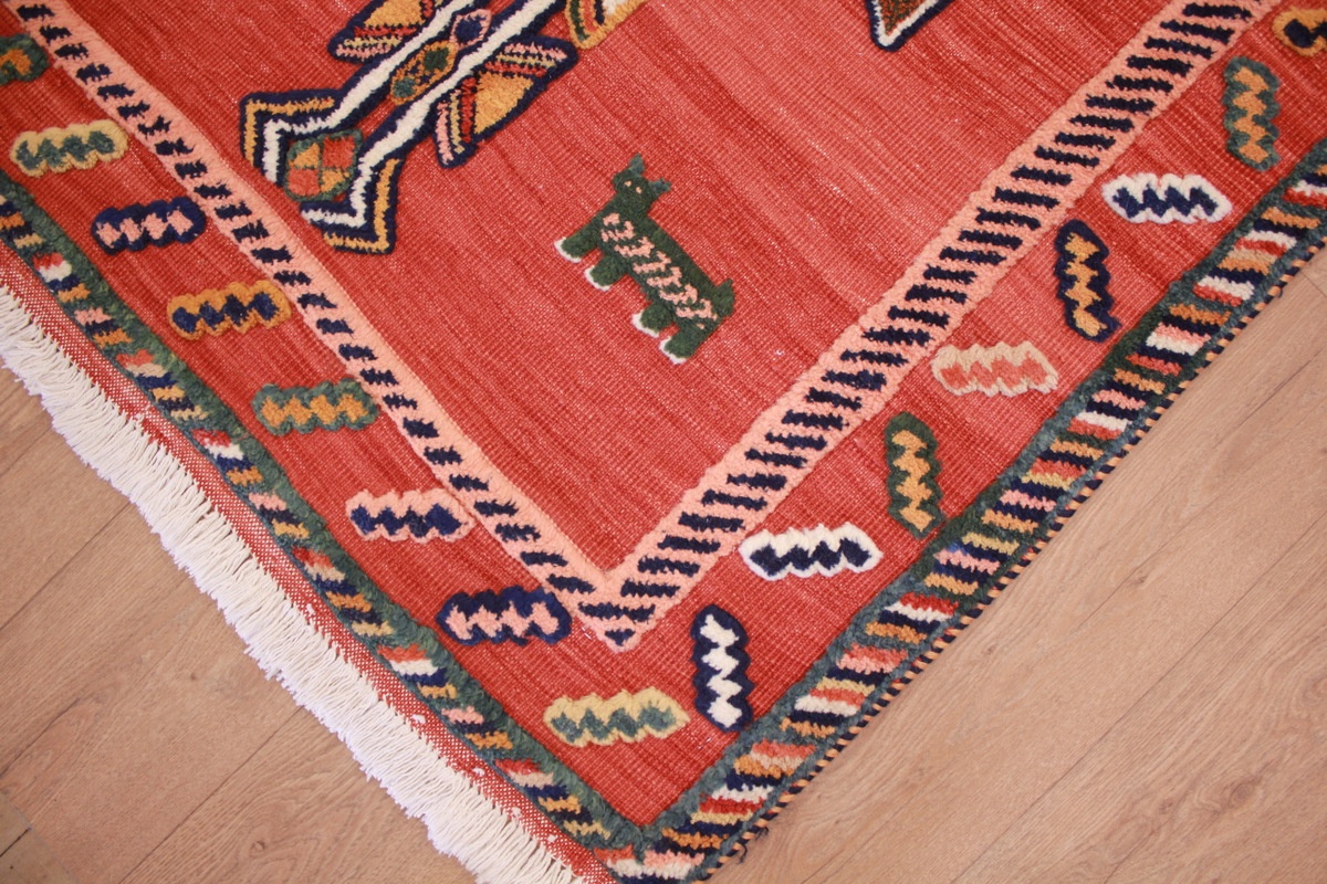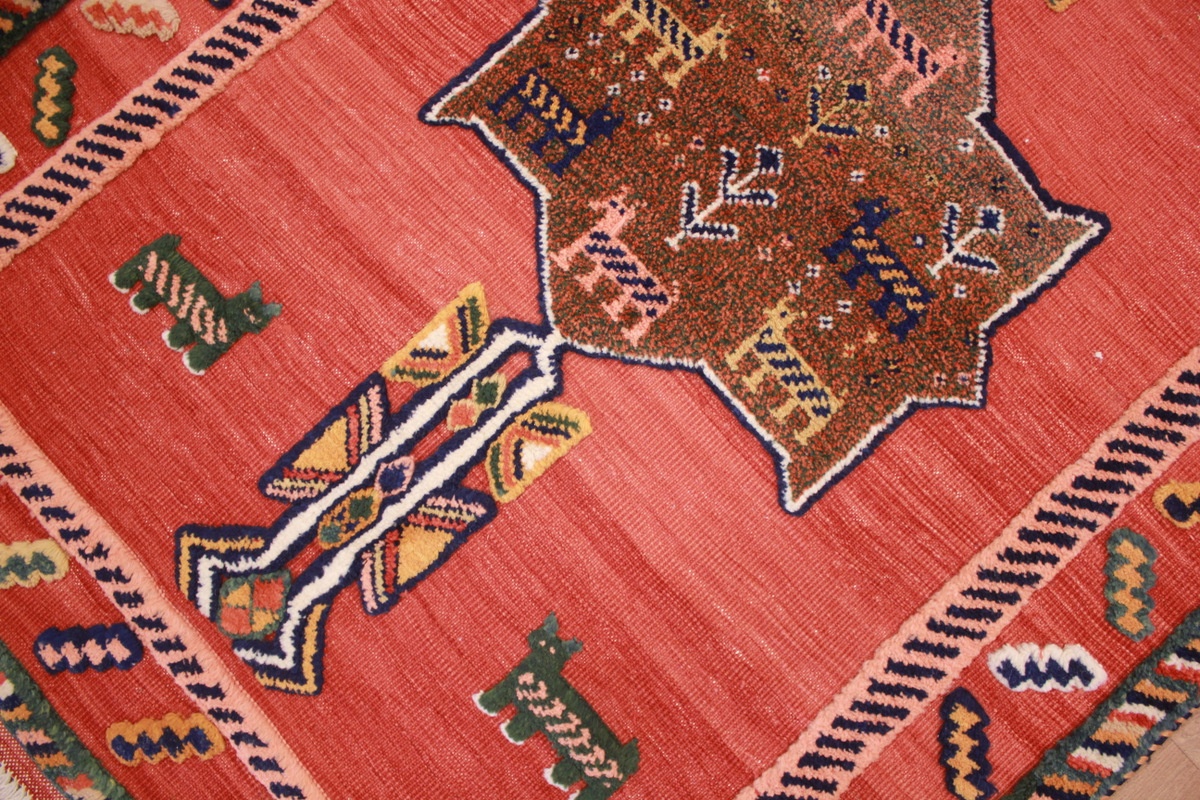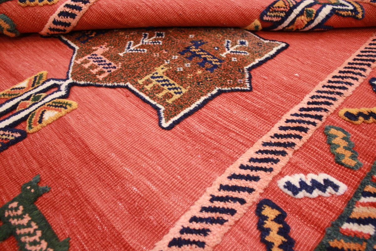 Sie werden sehr kunstvoll geknüpft und sind eine Kombination aus handgewebtem Kelim und handgeknüpftem Teppich.