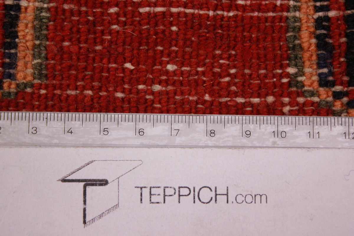 Vertikaler Webstuhl. Kette und Schuss aus Baumwolle. Flor aus Wolle. Türkischer Knoten mit einer Dichte zwischen 30 und 100 Knoten pro Quadratzoll. Die üblichen Maße sind der Dozar und der Treppenteppich oder der Strip.
