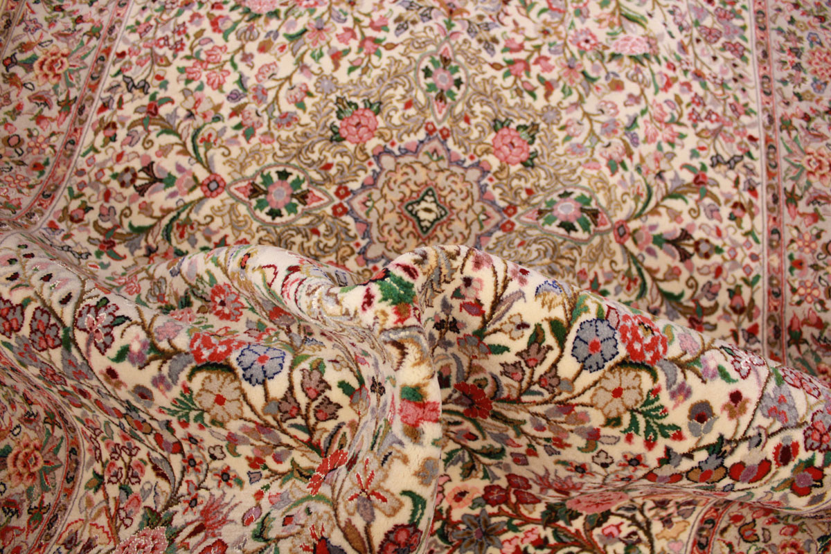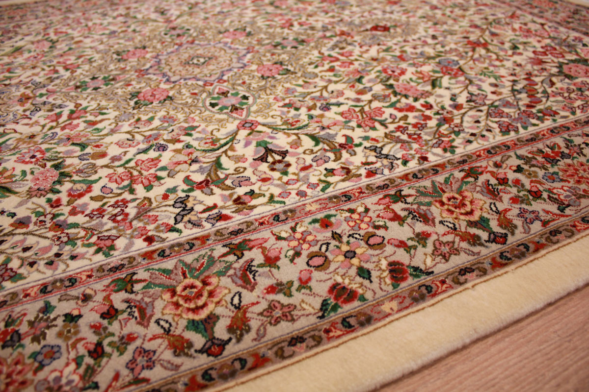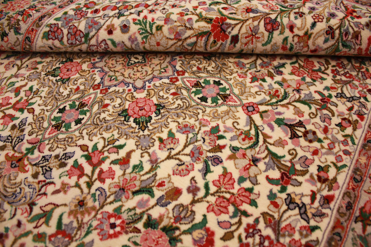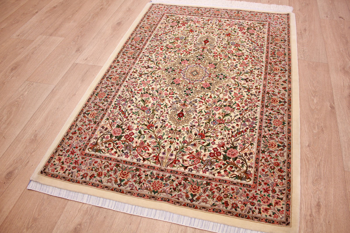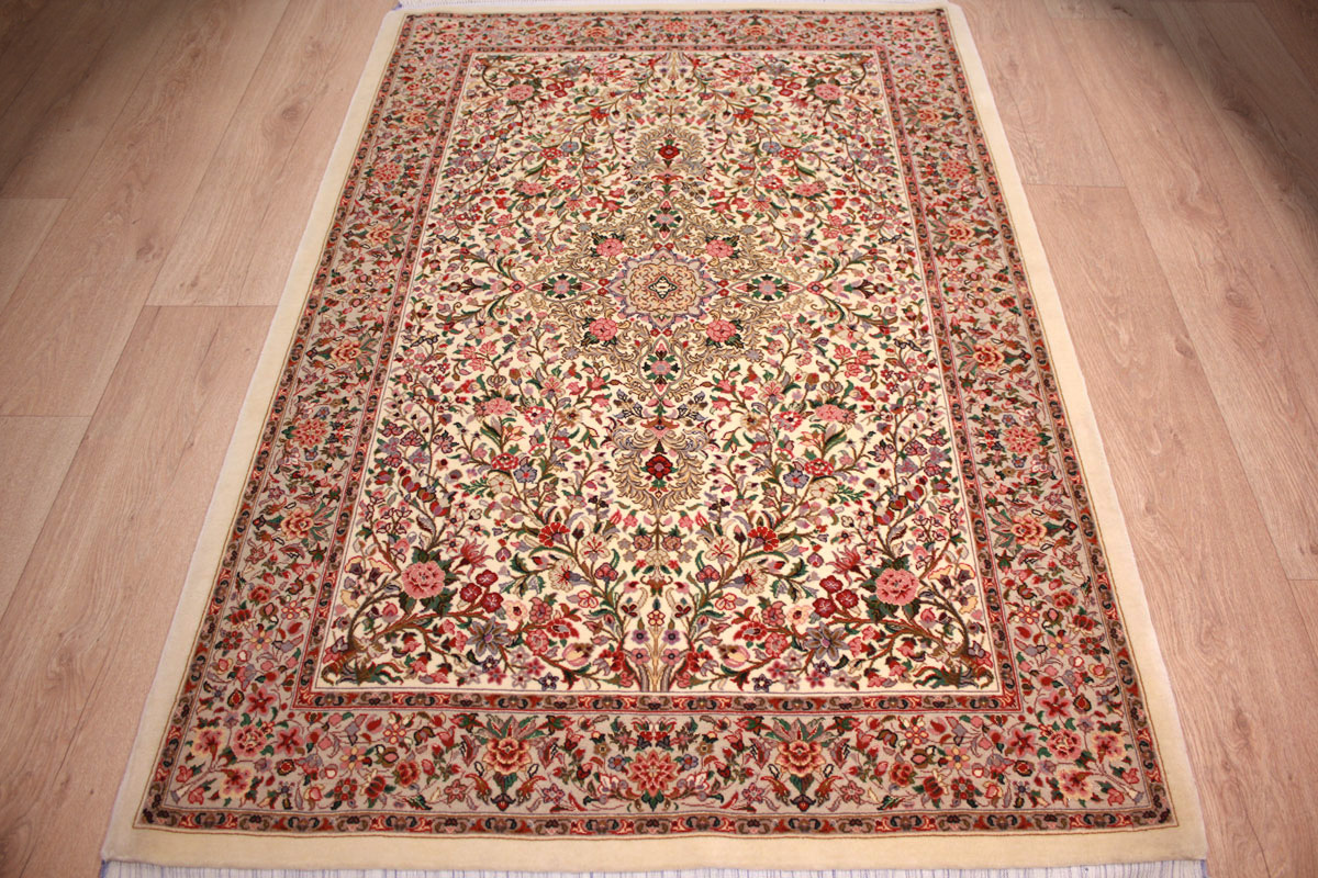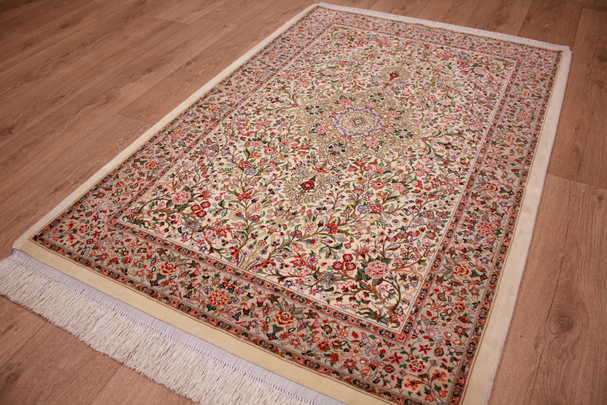 Aufgrund der soliden Wollqualtität und der fast ausschließlichen Verwendung von Naturfarben kann sich der Gom Teppich mit anderen hochwertigen Perserteppichen durchaus messen. Neben guten wollenen Teppichen werden hier in größerer Anzahl Seidenteppiche geknüpft. Als Motive findet man quadratisch unterteilte Gartenteppiche, Jagdschilderungen, Botteh-Motive, Zenrtalmedallions und Vasenmuster. Alle sind liebevoll feingliedrig ausgestattet. Ihre Kolorierung, für die hauptsächlich Naturfarben verwendet werden, reicht von sattem Rot (oft mit leuchtendem Türkis abgestimmt) bis zu lichtblauen, grünen und sogar braunen Tönen. Grundfarbe ist zumeist Elfenbein, zuweilen wird auch Rot als Hintergrundfarbe gewählt.