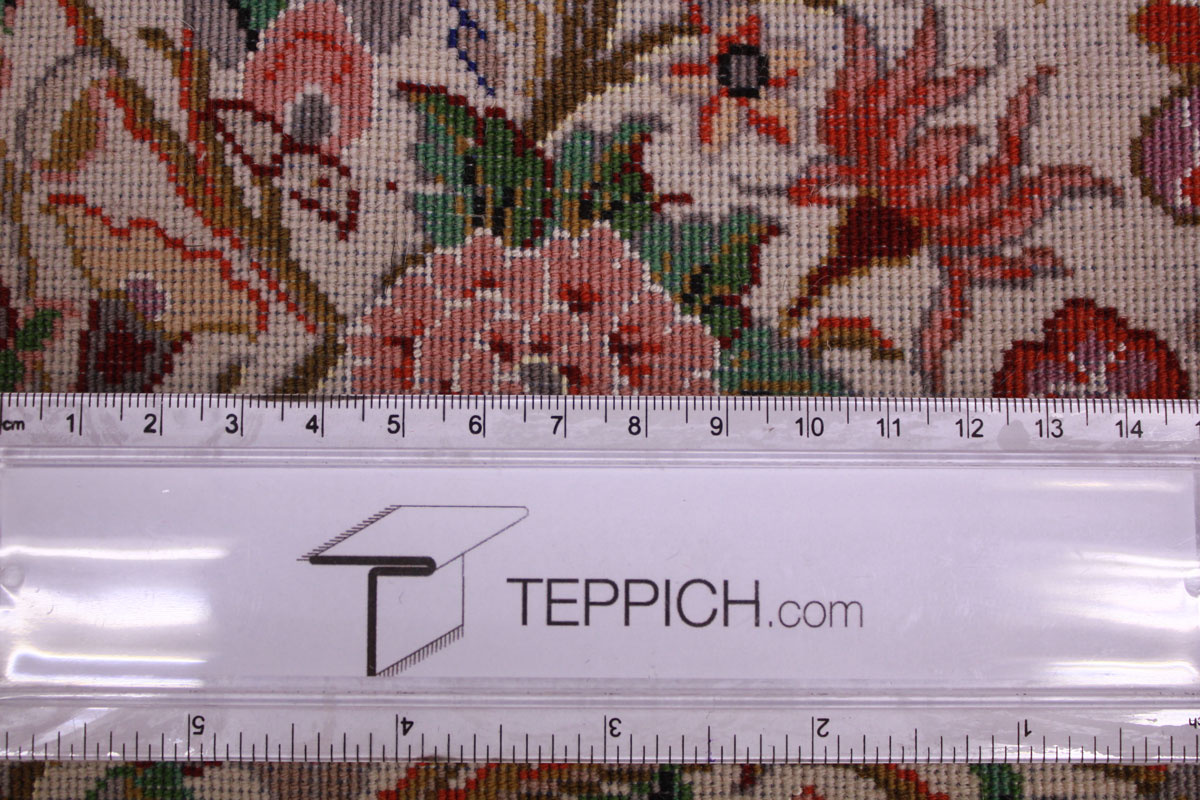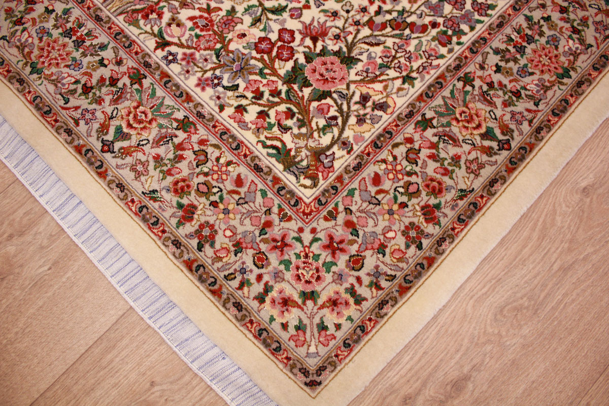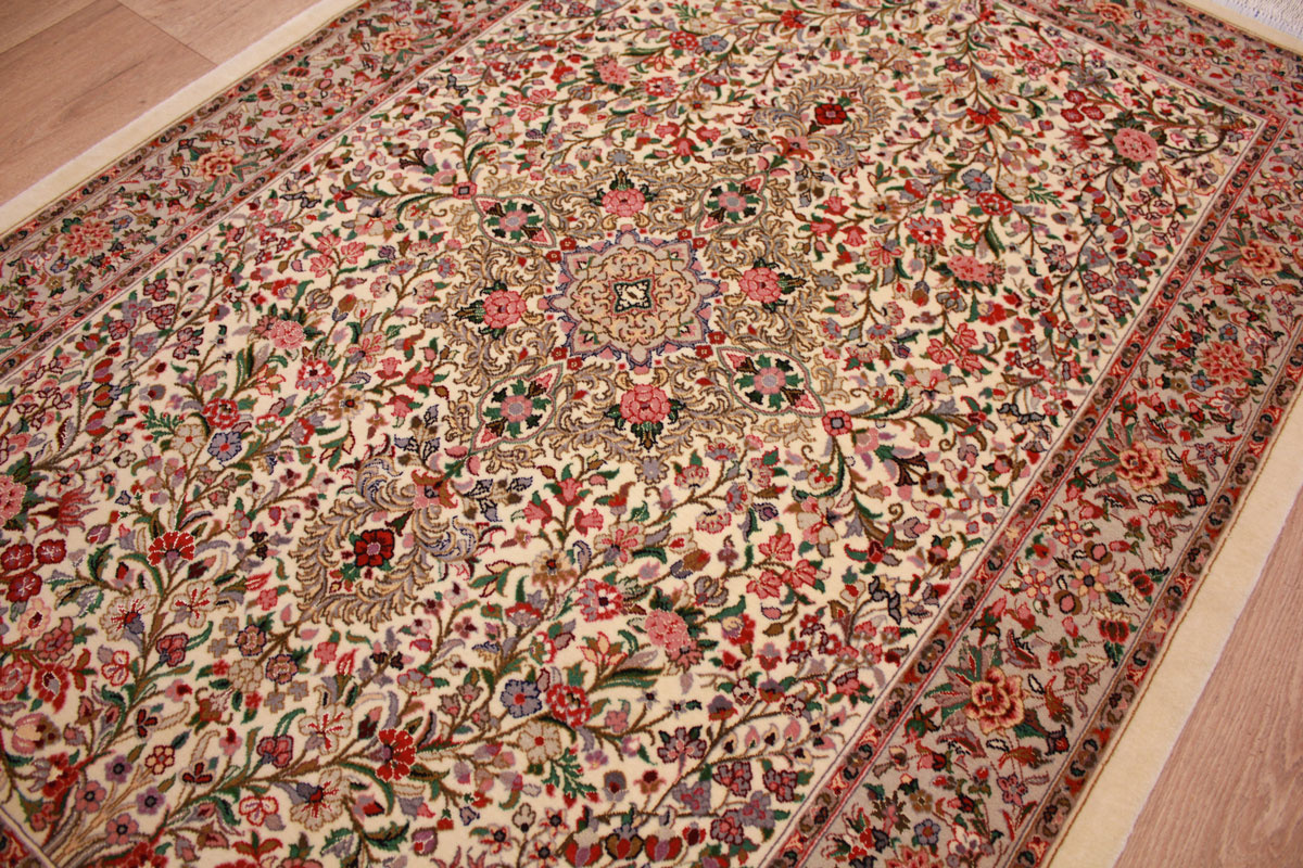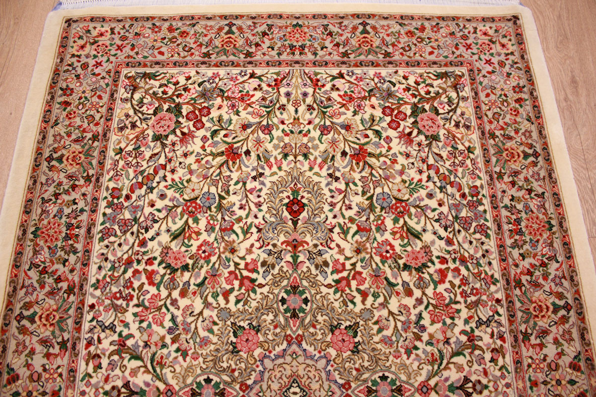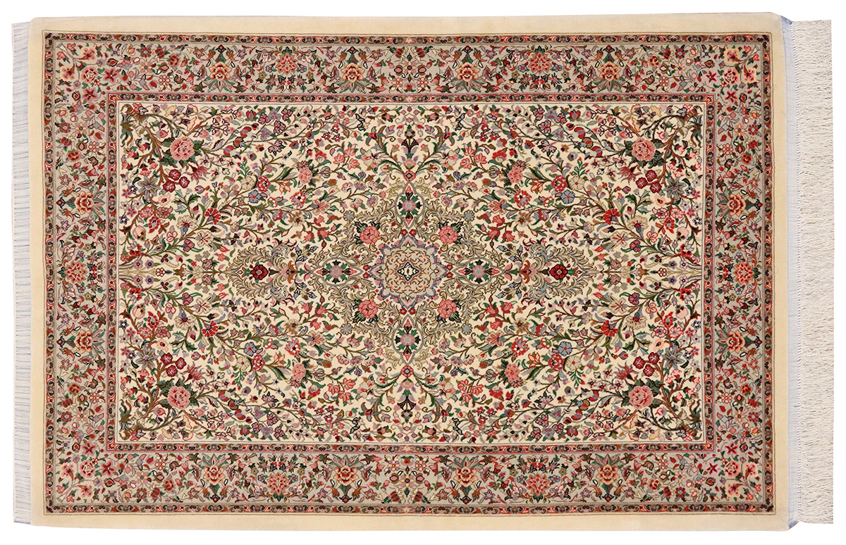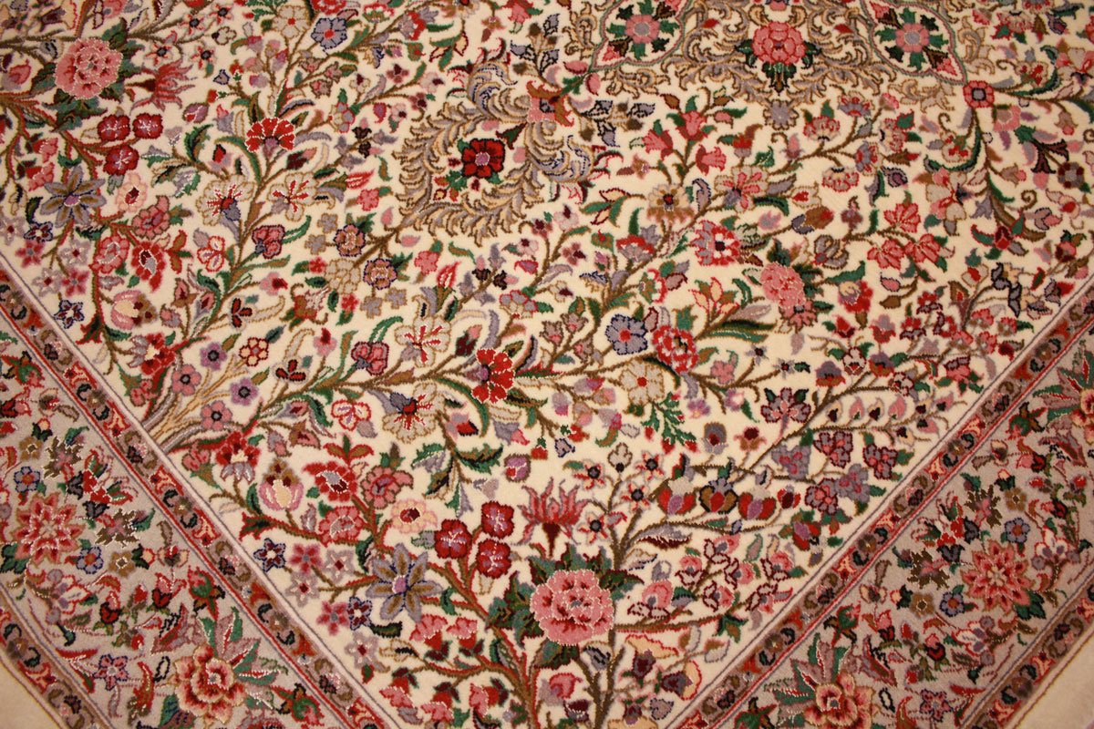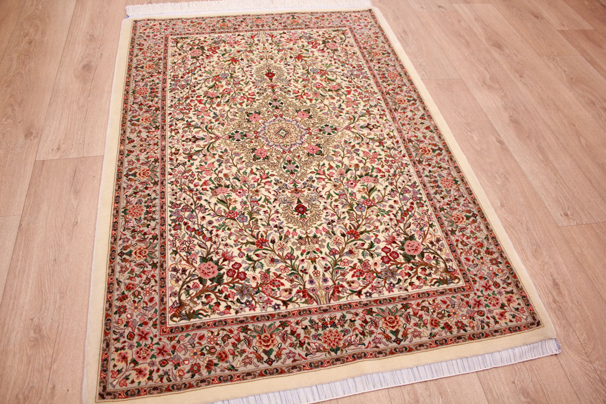 Aufgrund der soliden Wollqualtität und der fast ausschließlichen Verwendung von Naturfarben kann sich der Gom Teppich mit anderen hochwertigen Perserteppichen durchaus messen. Neben guten wollenen Teppichen werden hier in größerer Anzahl Seidenteppiche geknüpft. Als Motive findet man quadratisch unterteilte Gartenteppiche, Jagdschilderungen, Botteh-Motive, Zenrtalmedallions und Vasenmuster. Alle sind liebevoll feingliedrig ausgestattet. Ihre Kolorierung, für die hauptsächlich Naturfarben verwendet werden, reicht von sattem Rot (oft mit leuchtendem Türkis abgestimmt) bis zu lichtblauen, grünen und sogar braunen Tönen. Grundfarbe ist zumeist Elfenbein, zuweilen wird auch Rot als Hintergrundfarbe gewählt.