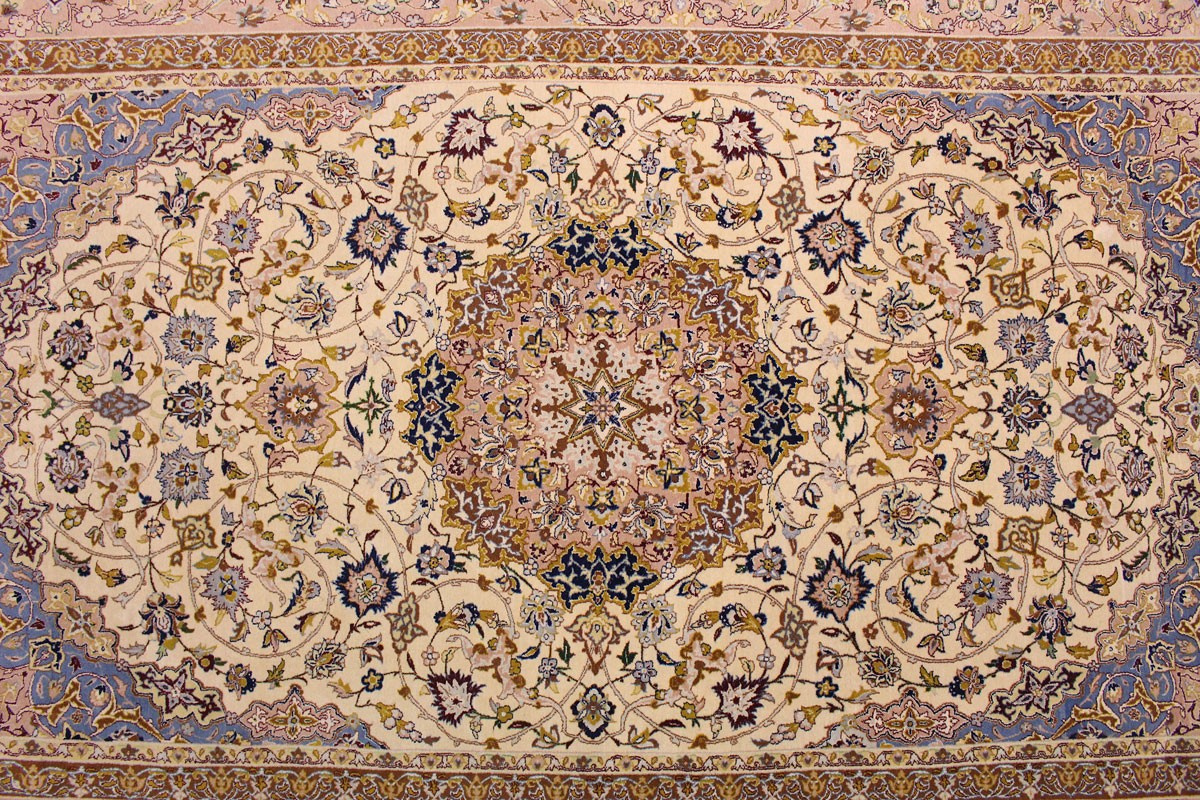 Eine breite Farbpalette findet bei Isfahan-Teppichen Verwendung, und ihre Knüpfer sind Meister im Gestalten harmonischer Kombinationen aus Untergrund und Design, wobei sie mit hellen und dunklen Farben zu variieren wissen.