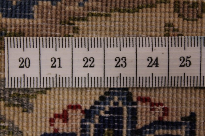 Technische Details Vertikaler Webstuhl, vorwiegend in Privathäusern in der Stadt. Die Rückseite ist aus Baumwolle, der Flor aus sehr knapp geschnittener Wolle. Einige Exemplare besitzen einen Flor aus Seide. Der persische Knoten wird verwendet, und die Dichte ist sehr hoch: von 160 bis 400 Knoten pro Quadratzoll. Alle Isfahan-Teppiche haben ein Blumendesign, in der Regel mit einem Medaillon in der Mitte eines Bereiches, der von einem Motiv ineinander verflochtener Blumenzweige geschmückt ist.
