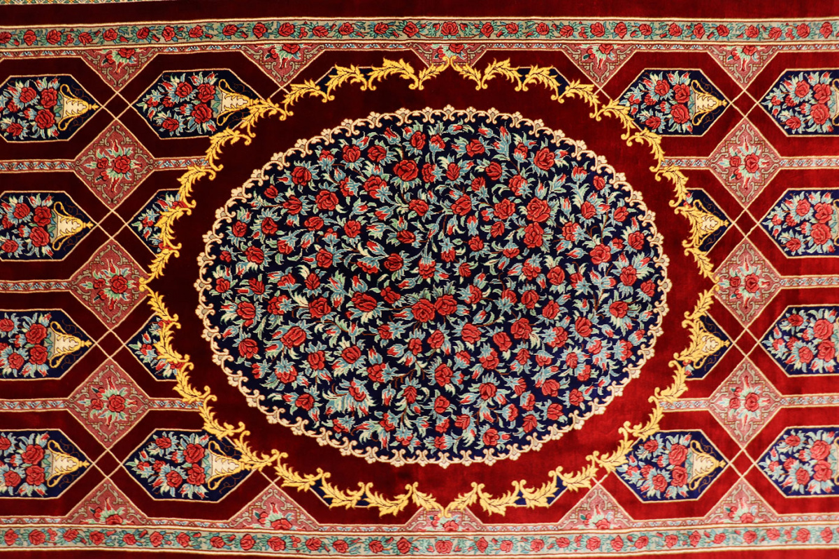 Trotz der vielseitigen Farbpalette hat der Gom-Teppich niemals grelle Farkontraste, sondern achtet auf eine harmonische Farbabstimmung. Bemerkenswert ist auch die äußerst exakte Knüpfung, die fast an Maschinenarbeit erinnert.