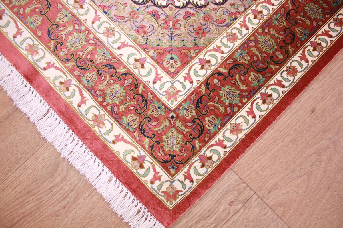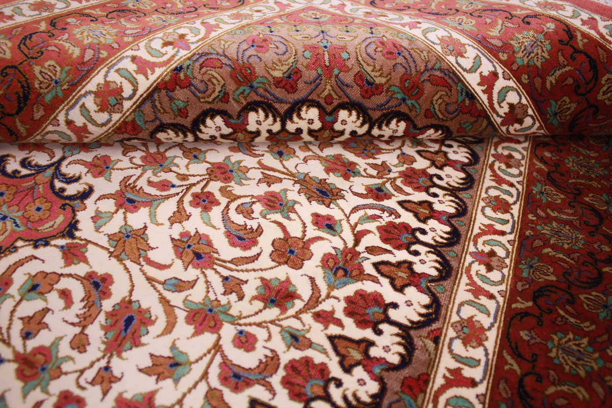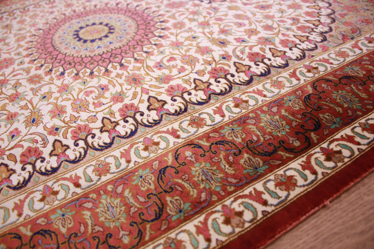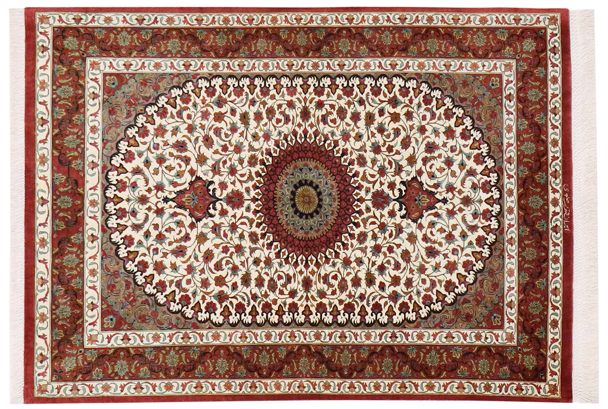 Trotz der vielseitigen Farbpalette hat der Gom-Teppich niemals grelle Farkontraste, sondern achtet auf eine harmonische Farbabstimmung. Bemerkenswert ist auch die äußerst exakte Knüpfung, die fast an Maschinenarbeit erinnert.