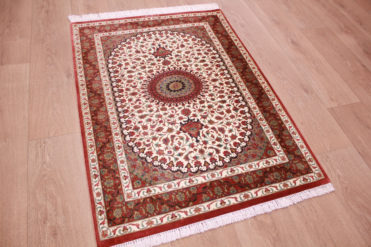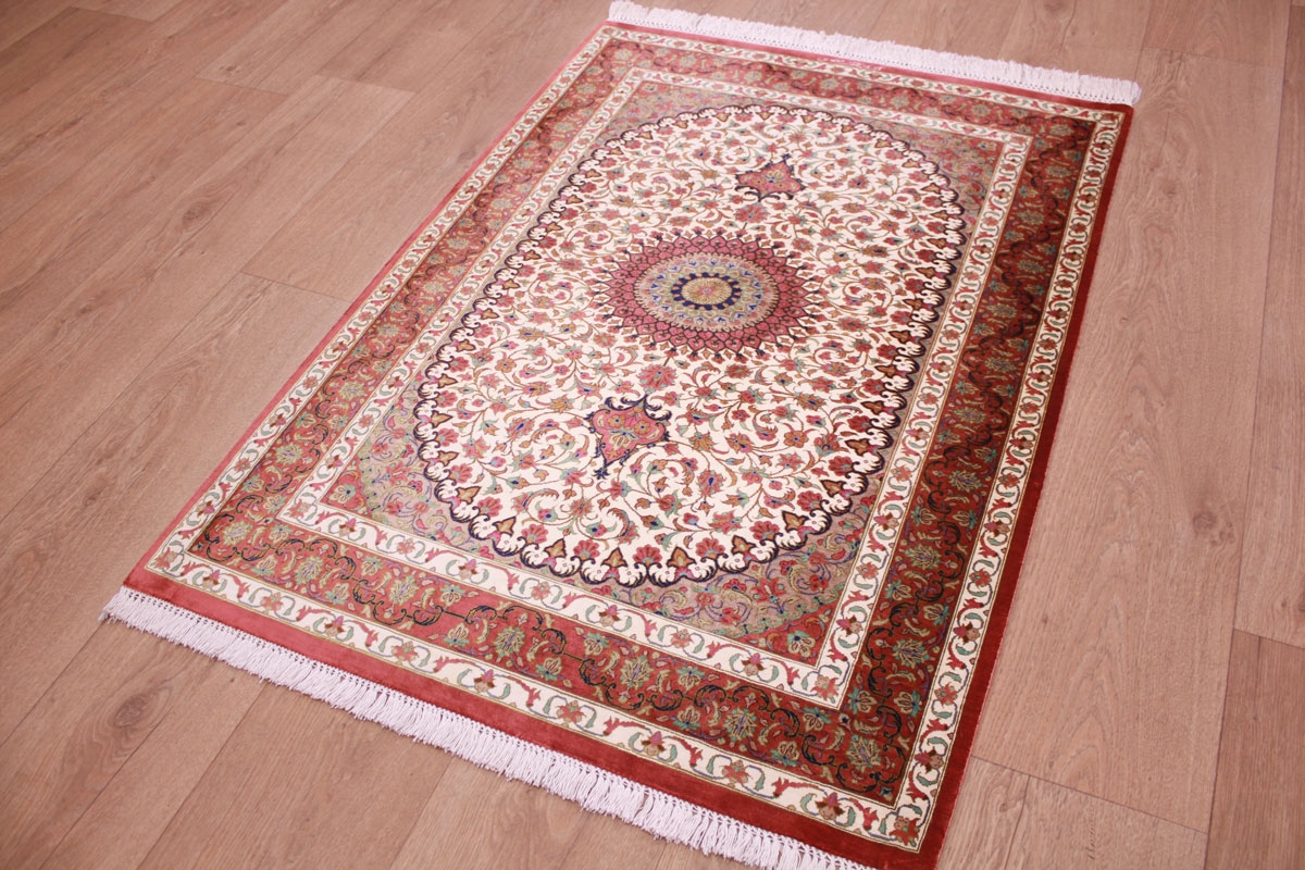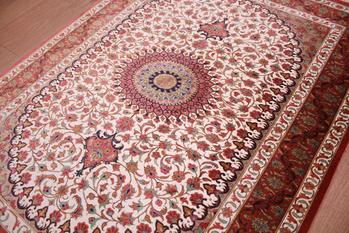Aufgrund der soliden Wollqualtität und der fast ausschließlichen Verwendung von Naturfarben kann sich der Gom Teppich mit anderen hochwertigen Perserteppichen durchaus messen. Neben guten wollenen Teppichen werden hier in größerer Anzahl Seidenteppiche geknüpft. Als Motive findet man quadratisch unterteilte Gartenteppiche, Jagdschilderungen, Botteh-Motive, Zenrtalmedallions und Vasenmuster. Alle sind liebevoll feingliedrig ausgestattet. Ihre Kolorierung, für die hauptsächlich Naturfarben verwendet werden, reicht von sattem Rot (oft mit leuchtendem Türkis abgestimmt) bis zu lichtblauen, grünen und sogar braunen Tönen. Grundfarbe ist zumeist Elfenbein, zuweilen wird auch Rot als Hintergrundfarbe gewählt.