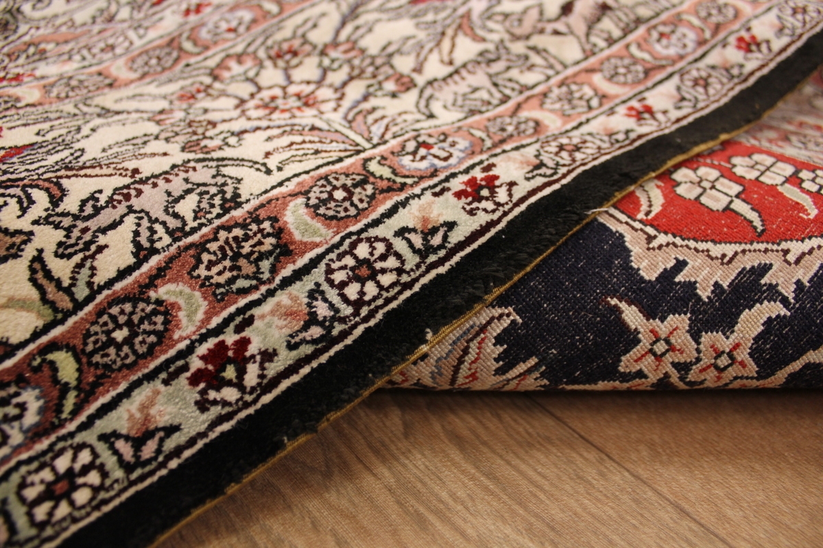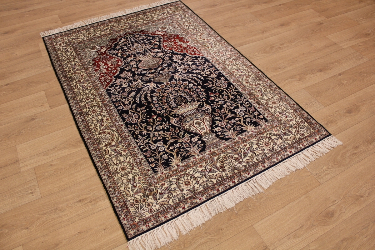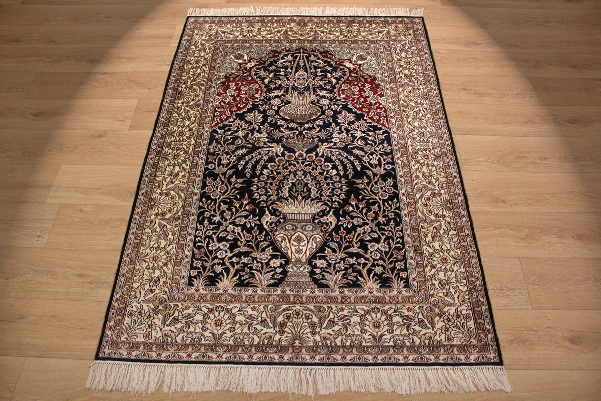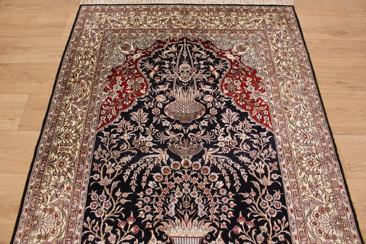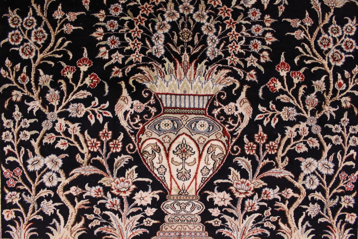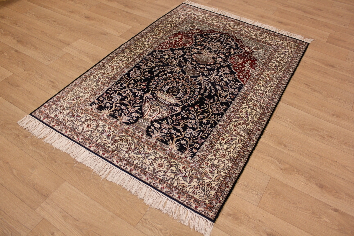 Aufgrund der soliden Wollqualtität und der fast ausschließlichen Verwendung von Naturfarben kann sich der Gom Teppich mit anderen hochwertigen Perserteppichen durchaus messen. Neben guten wollenen Teppichen werden hier in größerer Anzahl Seidenteppiche geknüpft. Als Motive findet man quadratisch unterteilte Gartenteppiche, Jagdschilderungen, Botteh-Motive, Zenrtalmedallions und Vasenmuster. Alle sind liebevoll feingliedrig ausgestattet. Ihre Kolorierung, für die hauptsächlich Naturfarben verwendet werden, reicht von sattem Rot (oft mit leuchtendem Türkis abgestimmt) bis zu lichtblauen, grünen und sogar braunen Tönen. Grundfarbe ist zumeist Elfenbein, zuweilen wird auch Rot als Hintergrundfarbe gewählt.