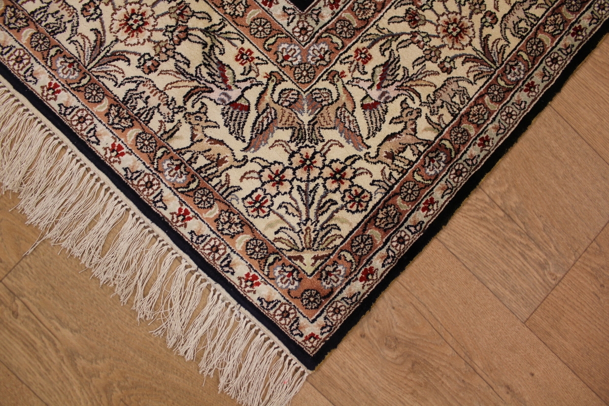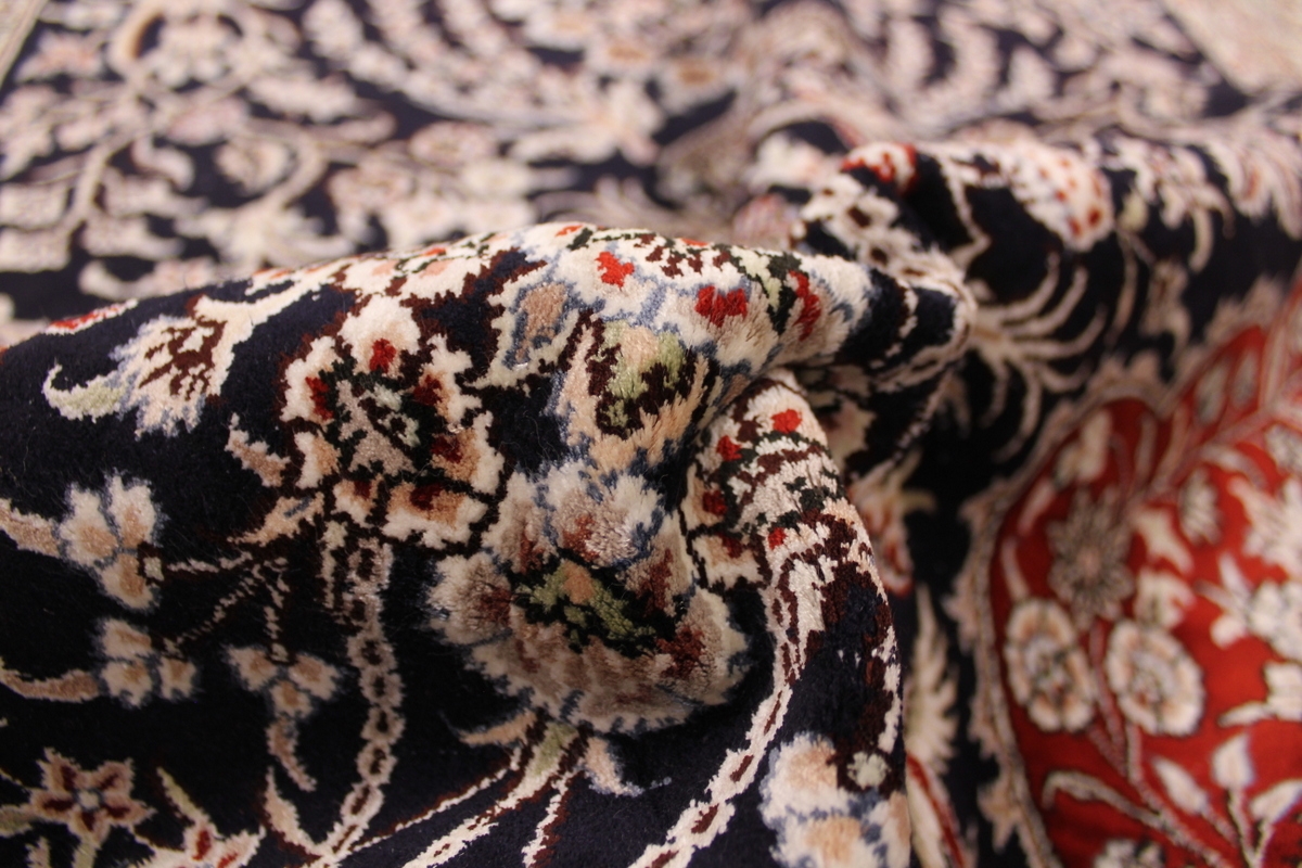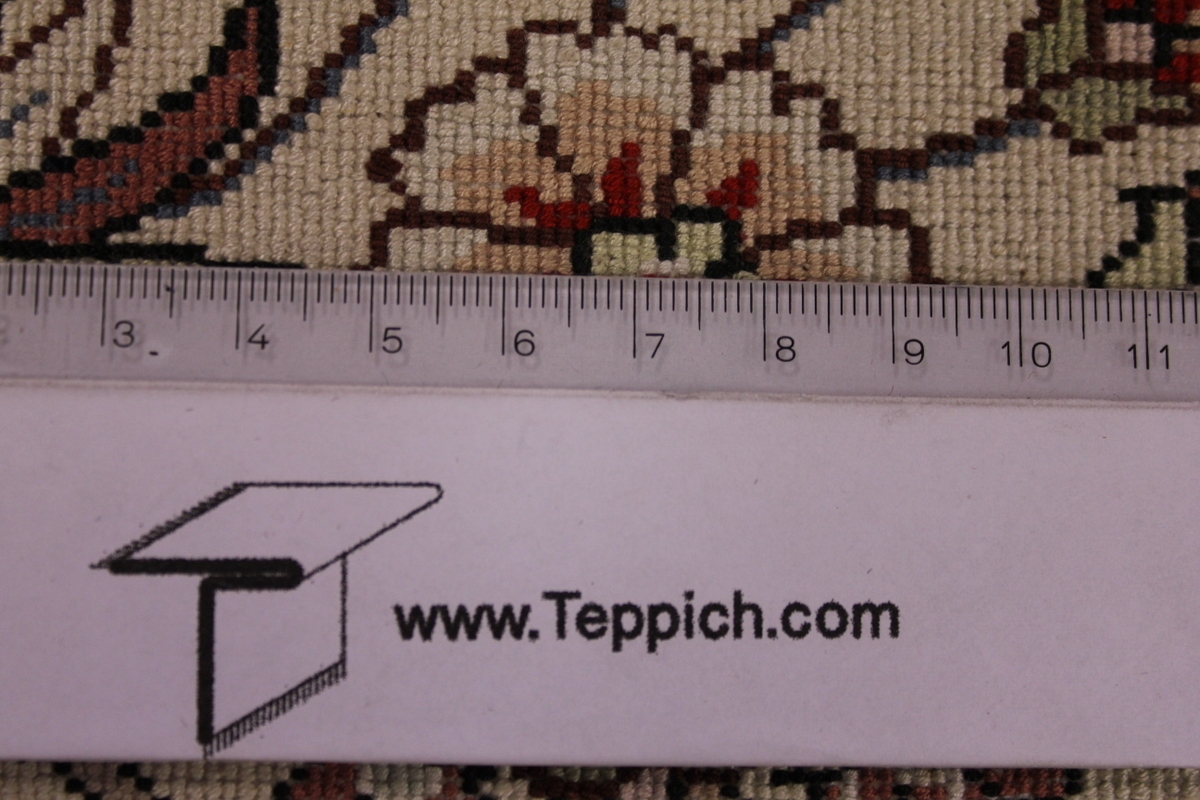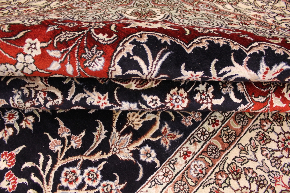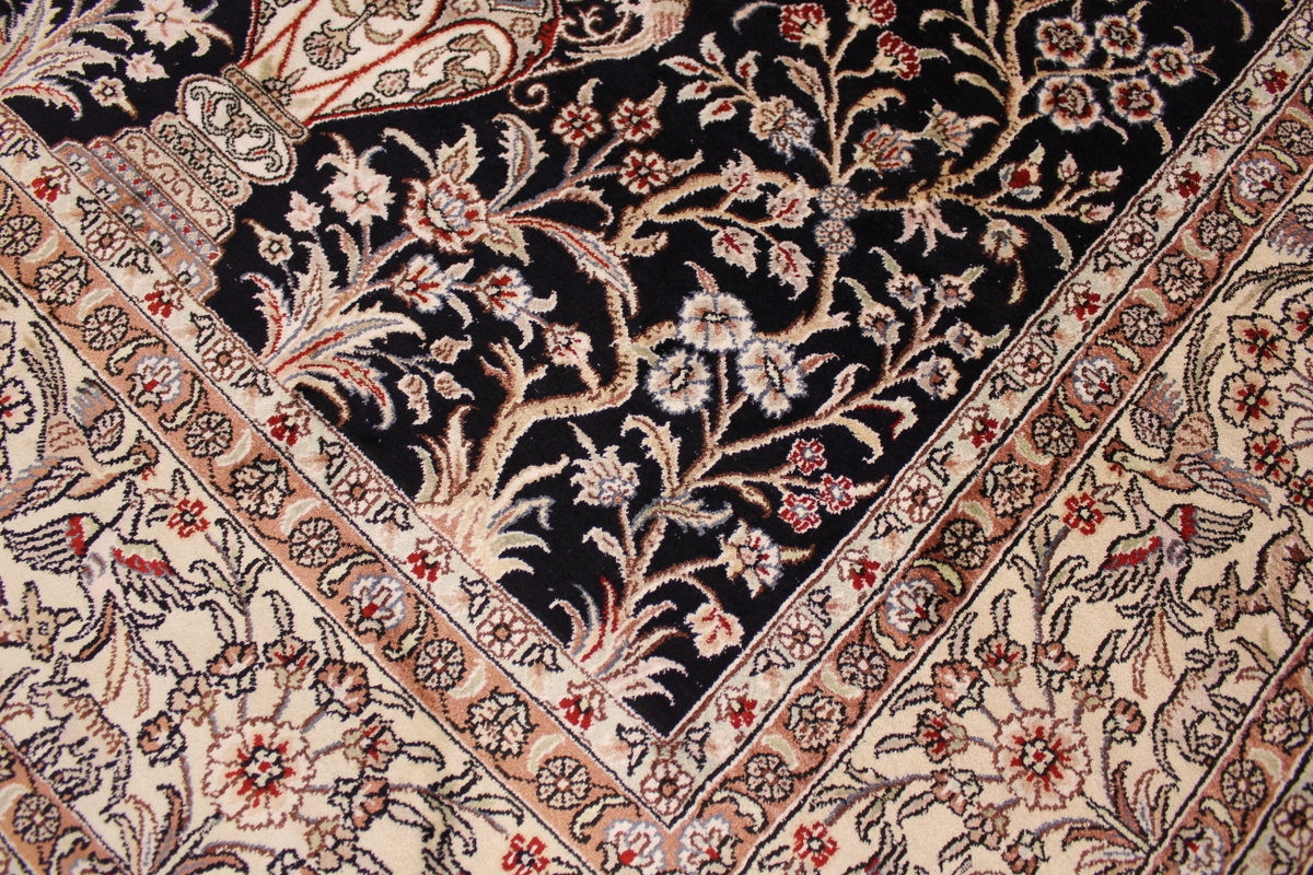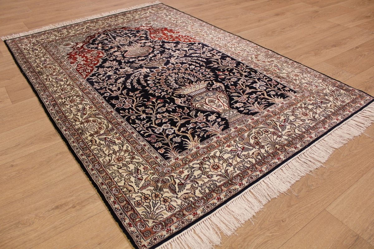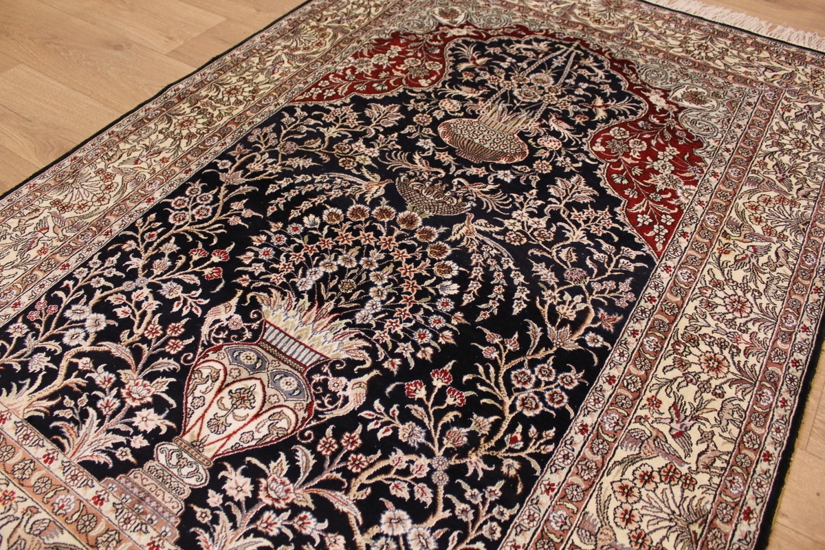 Aufgrund der soliden Wollqualtität und der fast ausschließlichen Verwendung von Naturfarben kann sich der Gom Teppich mit anderen hochwertigen Perserteppichen durchaus messen. Neben guten wollenen Teppichen werden hier in größerer Anzahl Seidenteppiche geknüpft. Als Motive findet man quadratisch unterteilte Gartenteppiche, Jagdschilderungen, Botteh-Motive, Zenrtalmedallions und Vasenmuster. Alle sind liebevoll feingliedrig ausgestattet. Ihre Kolorierung, für die hauptsächlich Naturfarben verwendet werden, reicht von sattem Rot (oft mit leuchtendem Türkis abgestimmt) bis zu lichtblauen, grünen und sogar braunen Tönen. Grundfarbe ist zumeist Elfenbein, zuweilen wird auch Rot als Hintergrundfarbe gewählt.