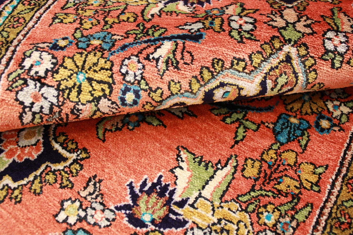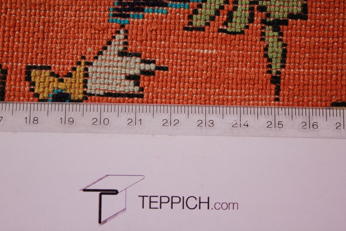 Trotz der vielseitigen Farbpalette hat der Gom-Teppich niemals grelle Farkontraste, sondern achtet auf eine harmonische Farbabstimmung. Bemerkenswert ist auch die äußerst exakte Knüpfung, die fast an Maschinenarbeit erinnert.