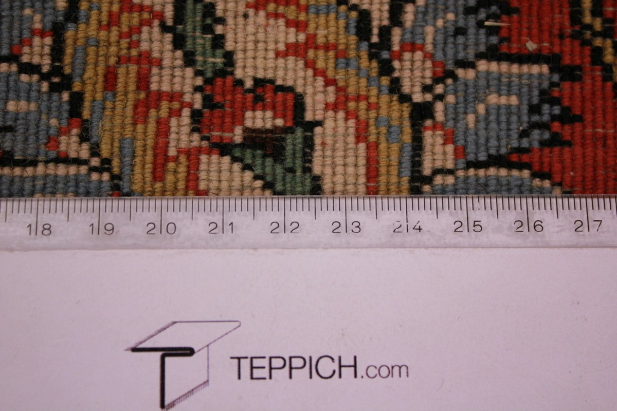 Trotz der vielseitigen Farbpalette hat der Gom-Teppich niemals grelle Farkontraste, sondern achtet auf eine harmonische Farbabstimmung. Bemerkenswert ist auch die äußerst exakte Knüpfung, die fast an Maschinenarbeit erinnert.