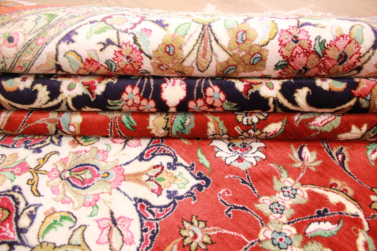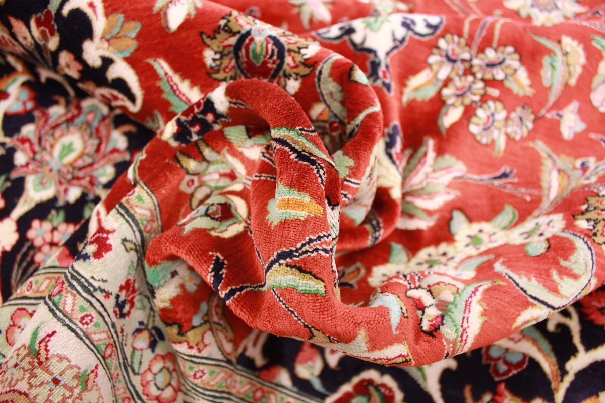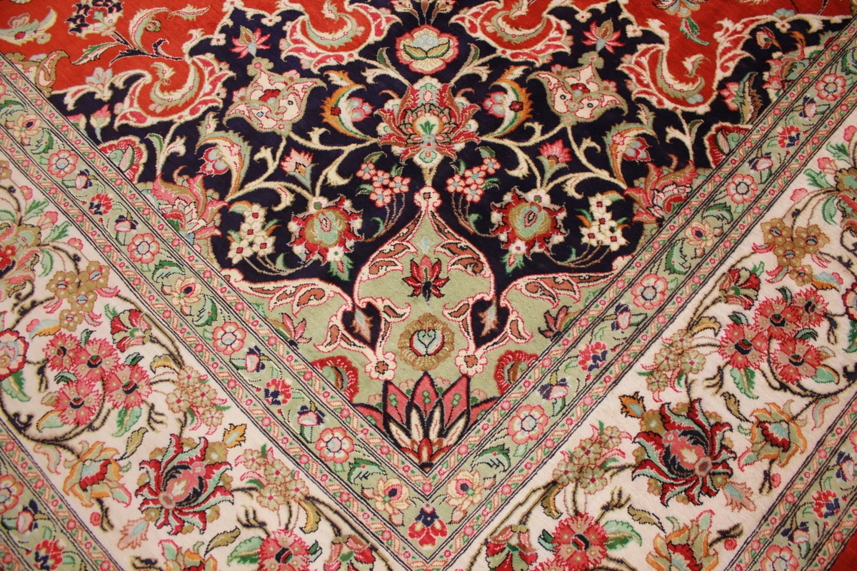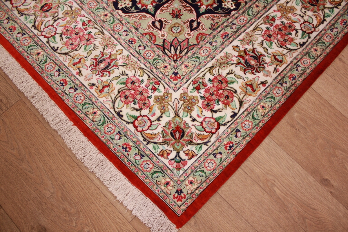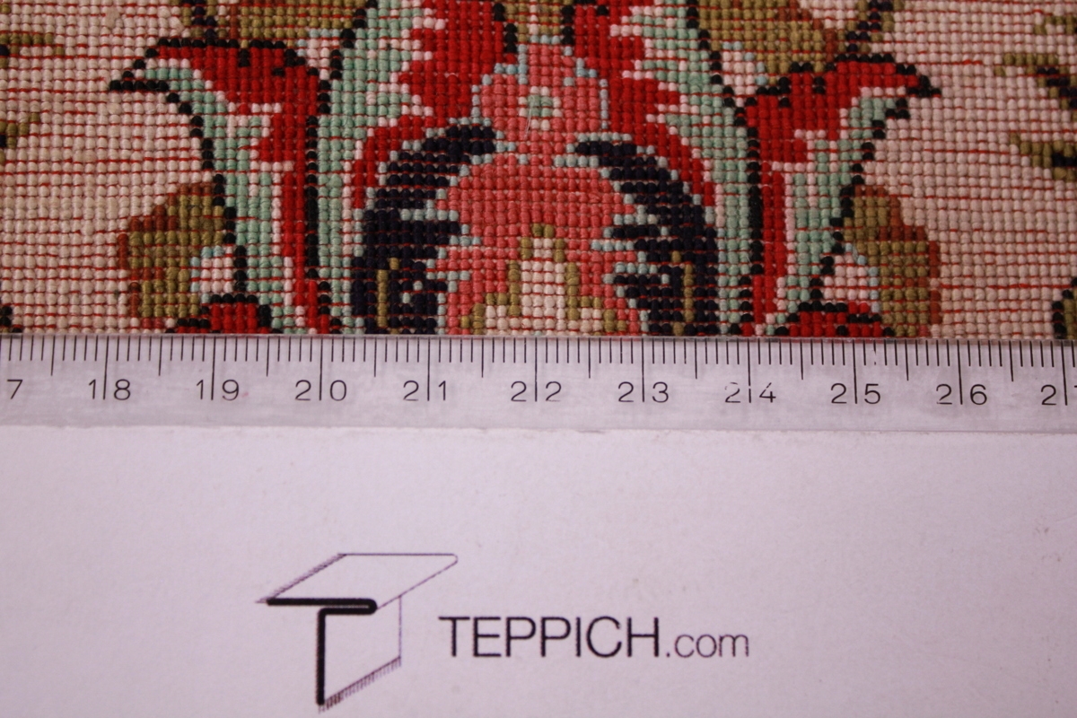 Trotz der vielseitigen Farbpalette hat der Gom-Teppich niemals grelle Farkontraste, sondern achtet auf eine harmonische Farbabstimmung. Bemerkenswert ist auch die äußerst exakte Knüpfung, die fast an Maschinenarbeit erinnert.