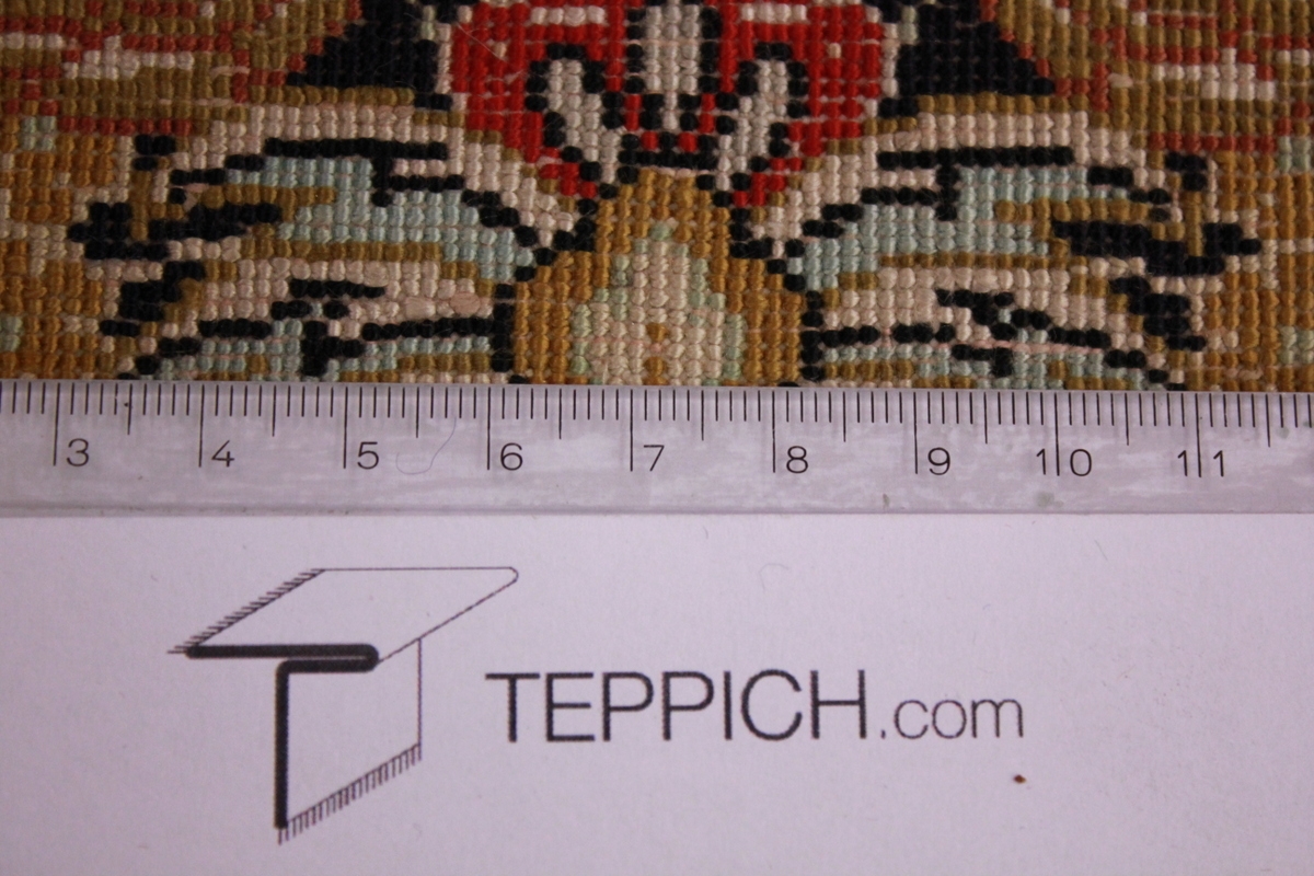 Trotz der vielseitigen Farbpalette hat der Gom-Teppich niemals grelle Farkontraste, sondern achtet auf eine harmonische Farbabstimmung. Bemerkenswert ist auch die äußerst exakte Knüpfung, die fast an Maschinenarbeit erinnert.