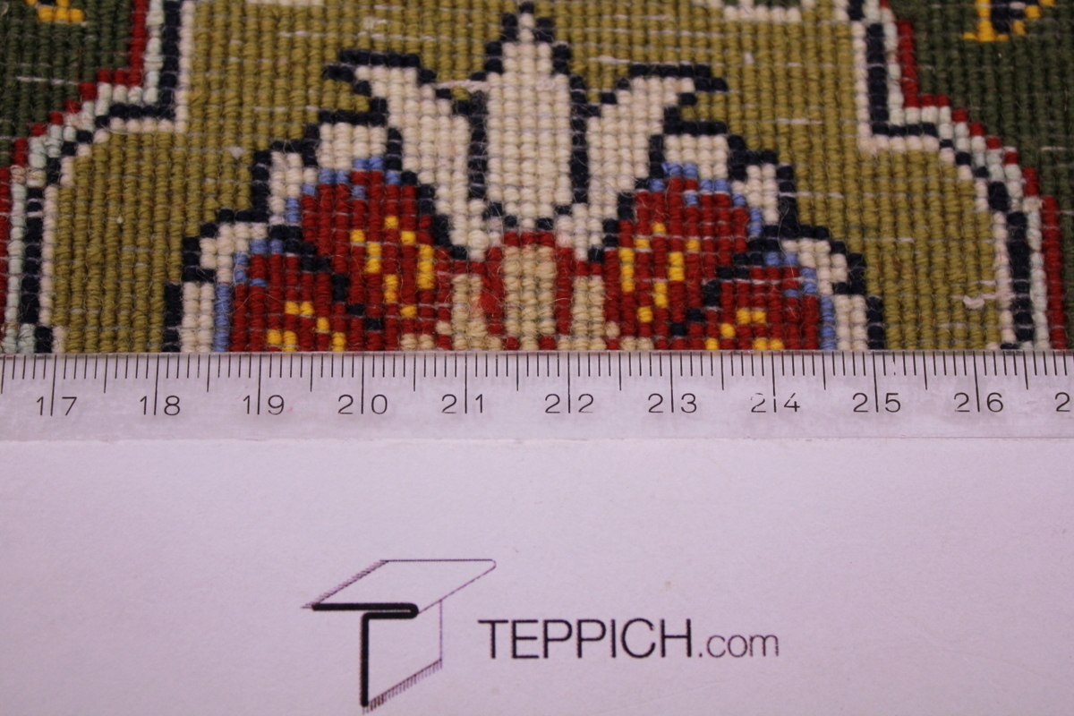 Trotz der vielseitigen Farbpalette hat der Gom-Teppich niemals grelle Farkontraste, sondern achtet auf eine harmonische Farbabstimmung. Bemerkenswert ist auch die äußerst exakte Knüpfung, die fast an Maschinenarbeit erinnert.