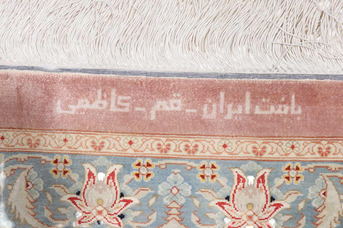 Trotz der vielseitigen Farbpalette hat der Ghom-Teppich niemals grelle Farkontraste, sondern achtet auf eine harmonische Farbabstimmung. Bemerkenswert ist auch die äußerst exakte Knüpfung, die fast an Maschinenarbeit erinnert.