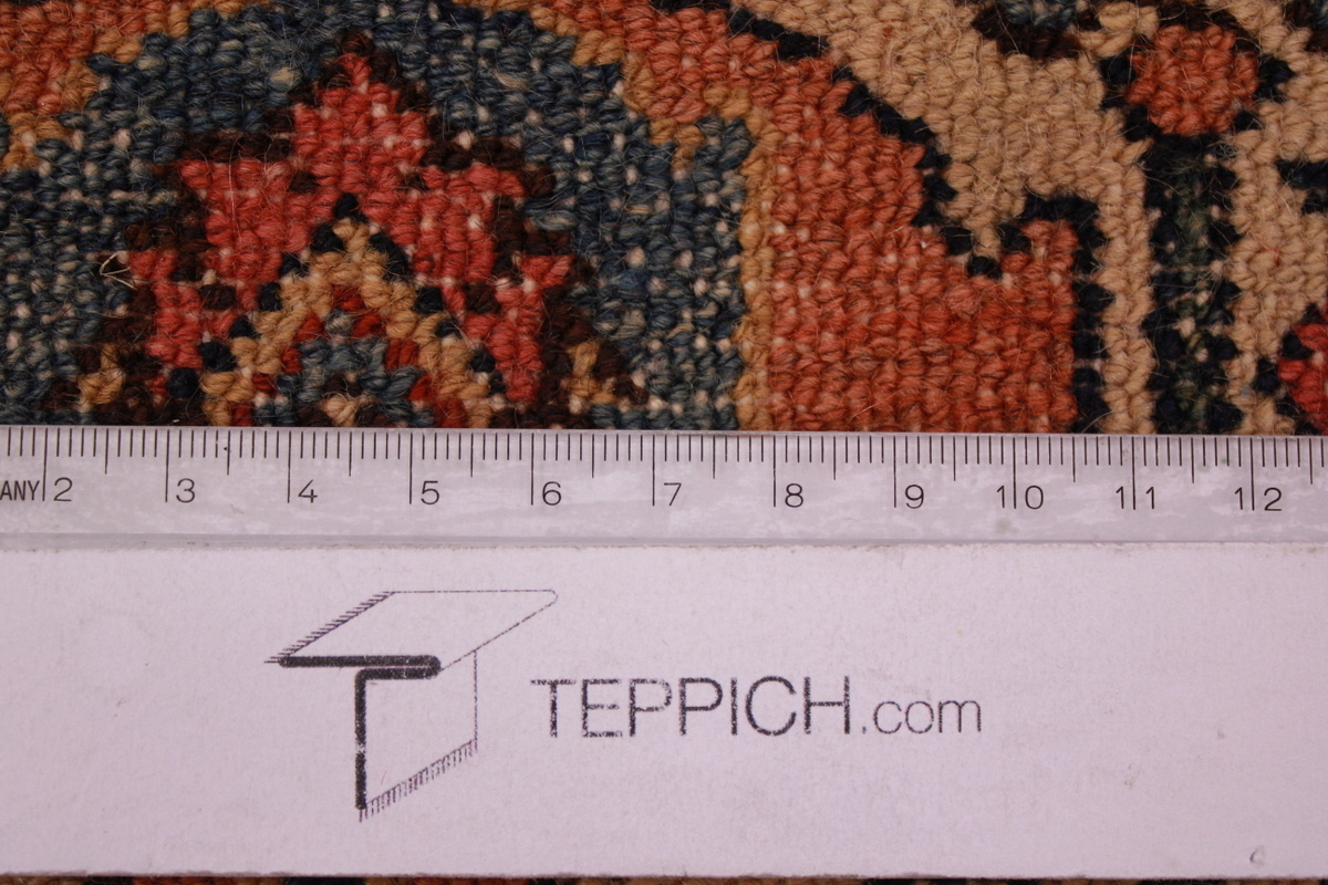 Vertikaler Webstuhl. Kette und Schuss aus Baumwolle. Flor aus Wolle. Türkischer Knoten mit einer Dichte zwischen 30 und 100 Knoten pro Quadratzoll. Die üblichen Maße sind der Dozar und der Treppenteppich oder der Strip.