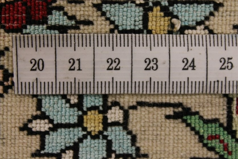 Technische Details Vertikaler Webstuhl, vorwiegend in Privathäusern in der Stadt. Die Rückseite ist aus Baumwolle, der Flor aus sehr knapp geschnittener Wolle. Einige Exemplare besitzen einen Flor aus Seide. Der persische Knoten wird verwendet, und die Dichte ist sehr hoch: von 160 bis 400 Knoten pro Quadratzoll. Alle Isfahan-Teppiche haben ein Blumendesign, in der Regel mit einem Medaillon in der Mitte eines Bereiches, der von einem Motiv ineinander verflochtener Blumenzweige geschmückt ist.