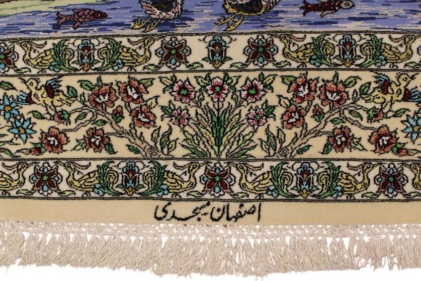 Der Saum von Isfahan-Teppichen besteht in der Regel aus einem großen mittleren Streifen, der von zwei schmalen Sicherheitsstreifen umgeben ist. Eine breite Farbpalette findet bei Isfahan-Teppichen Verwendung, und ihre Knüpfer sind Meister im Gestalten harmonischer Kombinationen aus Untergrund und Design, wobei sie mit hellen und dunklen Farben zu variieren wissen.