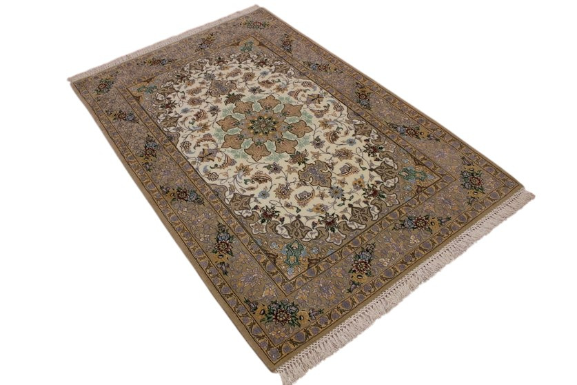 Technische Details Vertikaler Webstuhl, vorwiegend in Privathäusern in der Stadt. Die Rückseite ist aus Baumwolle, der Flor aus sehr knapp geschnittener Wolle. Einige Exemplare besitzen einen Flor aus Seide. Der persische Knoten wird verwendet, und die Dichte ist sehr hoch: von 160 bis 400 Knoten pro Quadratzoll. Alle Isfahan-Teppiche haben ein Blumendesign, in der Regel mit einem Medaillon in der Mitte eines Bereiches, der von einem Motiv ineinander verflochtener Blumenzweige geschmückt ist.