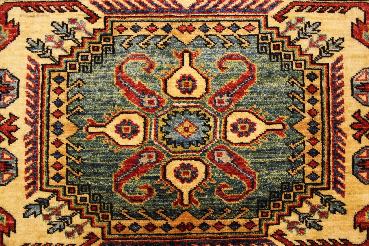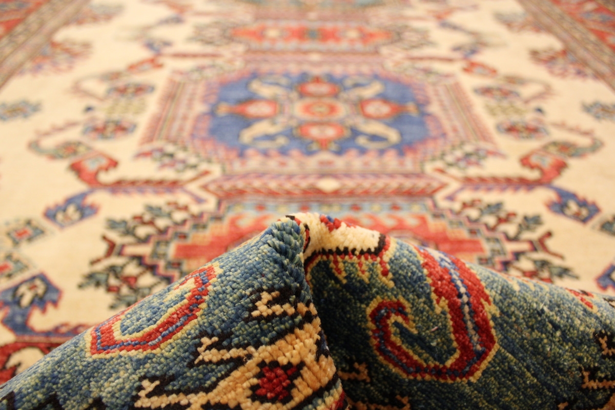Kazak Teppiche werden in Pakistan handgeknüpft. Sie bestehen aus Wolle und Naturfarben.