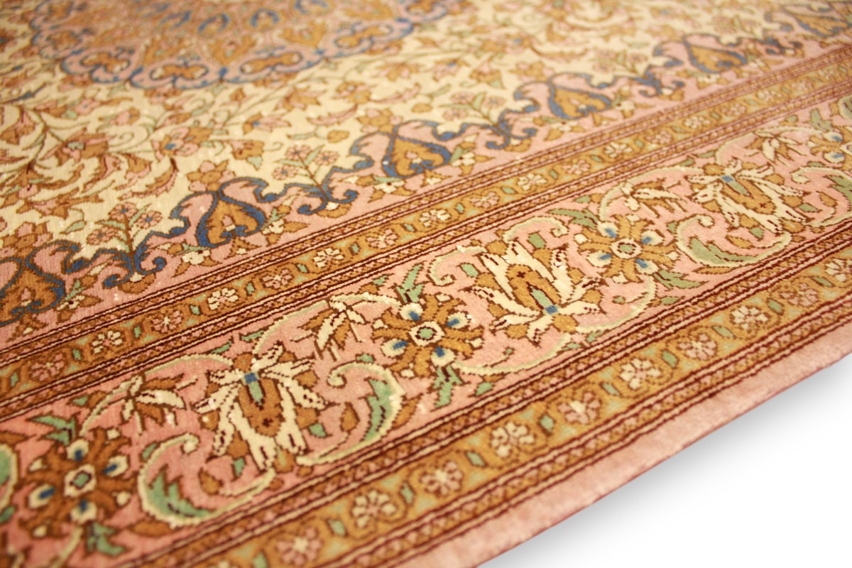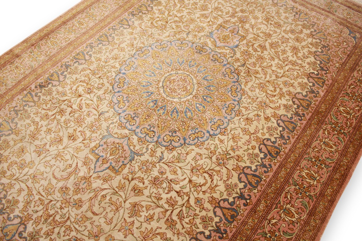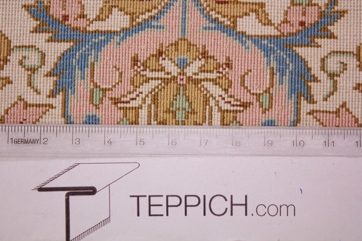 Trotz der vielseitigen Farbpalette hat der Ghom-Teppich niemals grelle Farkontraste, sondern achtet auf eine harmonische Farbabstimmung. Bemerkenswert ist auch die äußerst exakte Knüpfung, die fast an Maschinenarbeit erinnert.