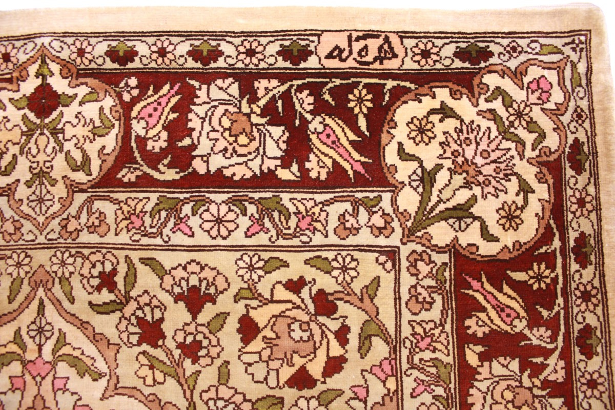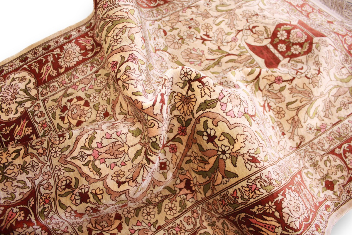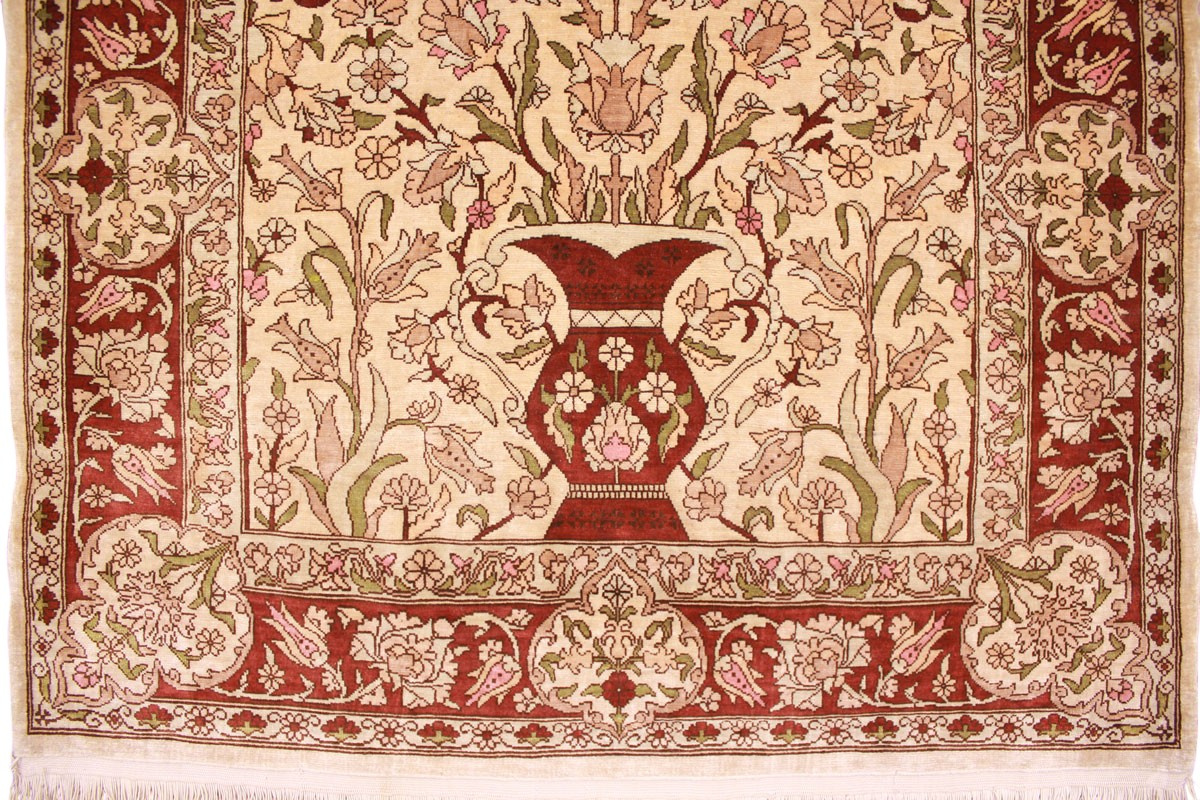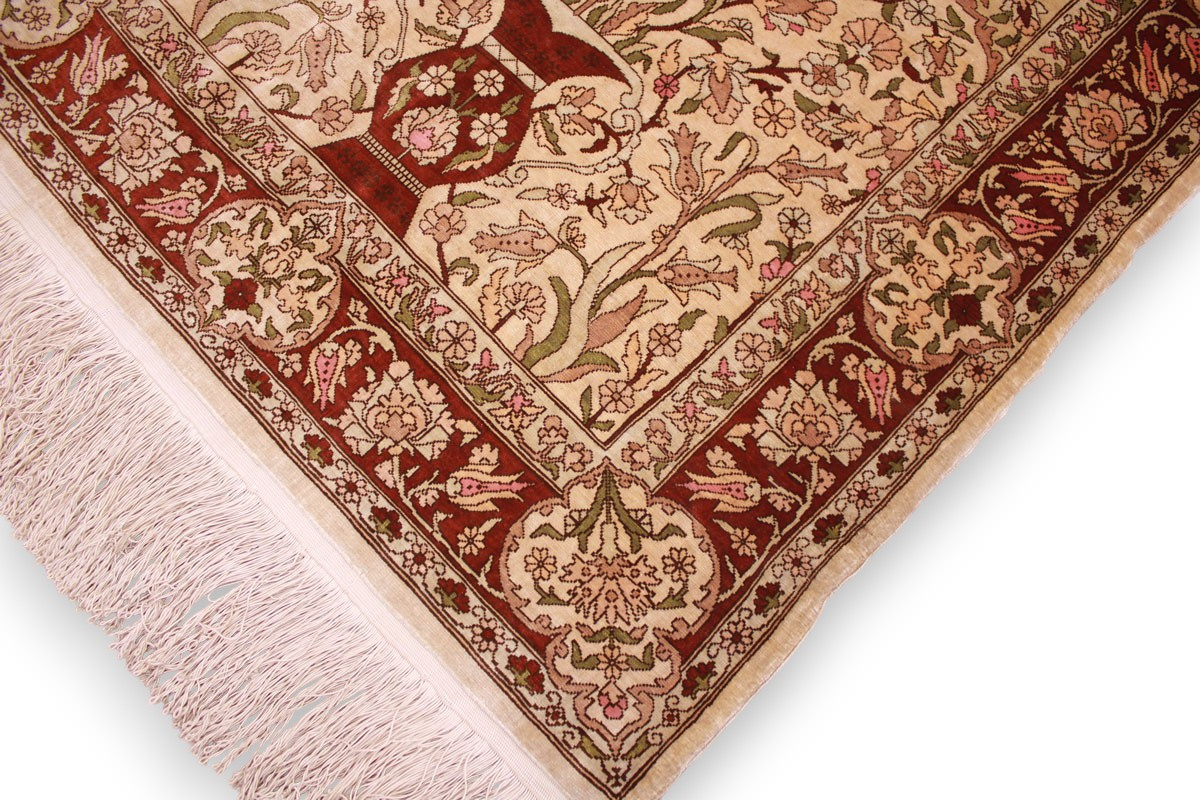 Hereke Teppiche werden sehr sorgfältig in der Türkei von hand geknüpft. Sie bestehen meist aus reiner Seide und können eine Knüpfdichte bis 5 Mio. Knoten/Qm erreichen. Hereke Teppiche sind sehr wertvoll und dekorativ. Sie werden meistens in kleineren Größen geknüpft und als Wandteppich verwendet.